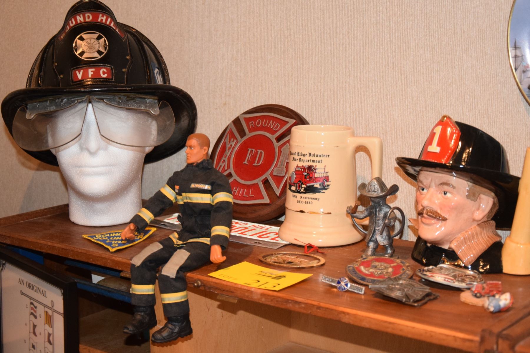 FIREFIGHTER'S COLLECTIBLES: ROUND HILL VOLUNTEER FD HELMET, BELT BUCKLES, FIGURINES, MUG, ETC. (15 PCS)