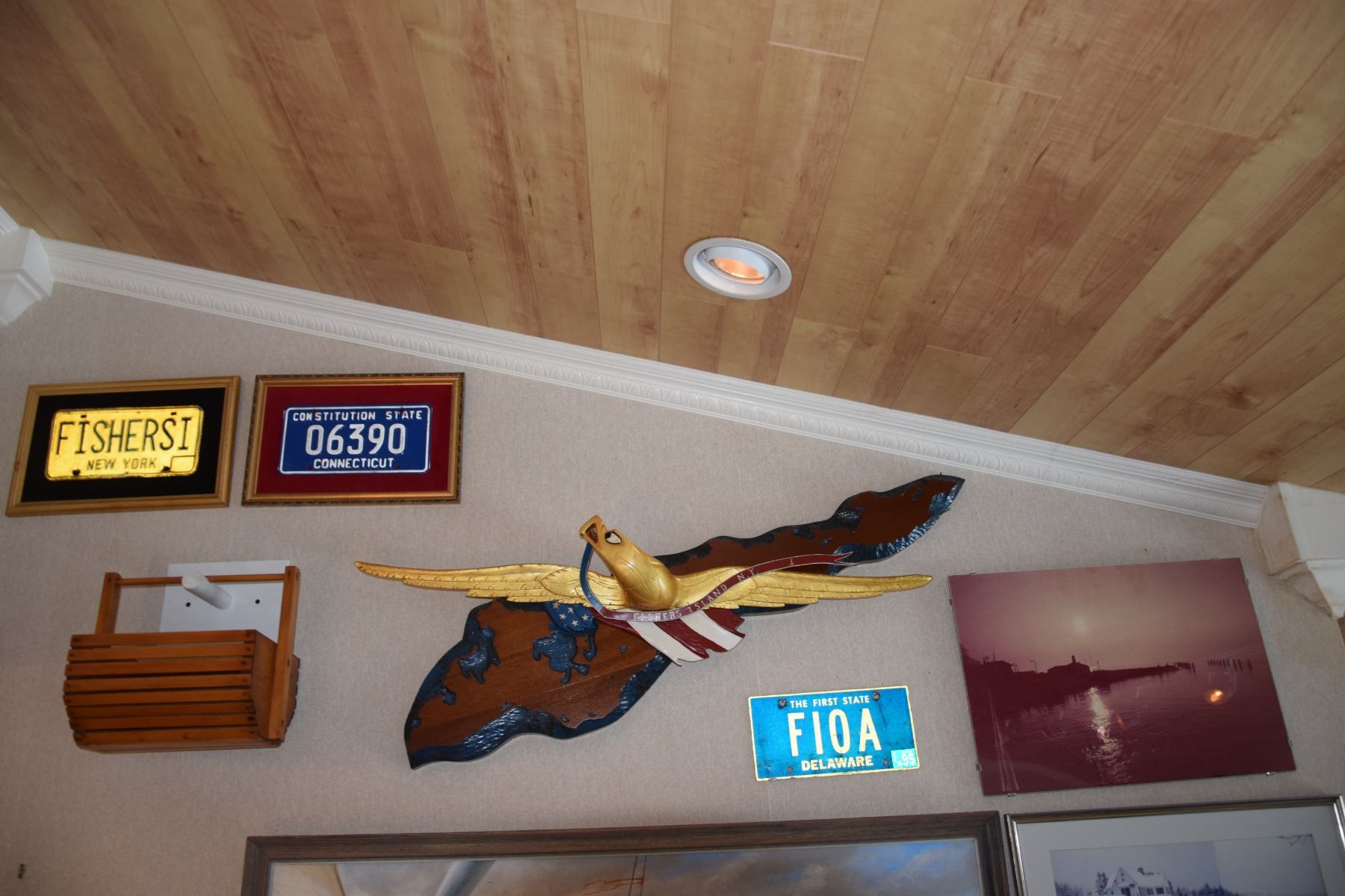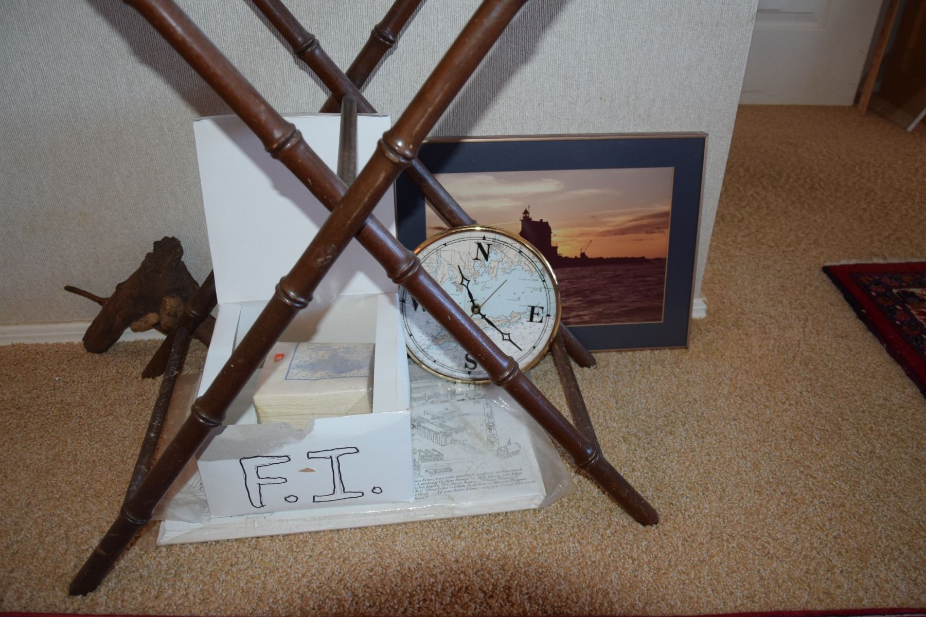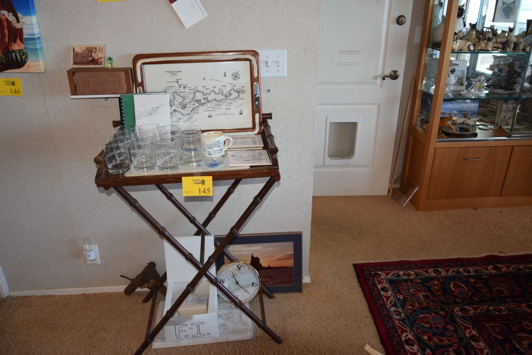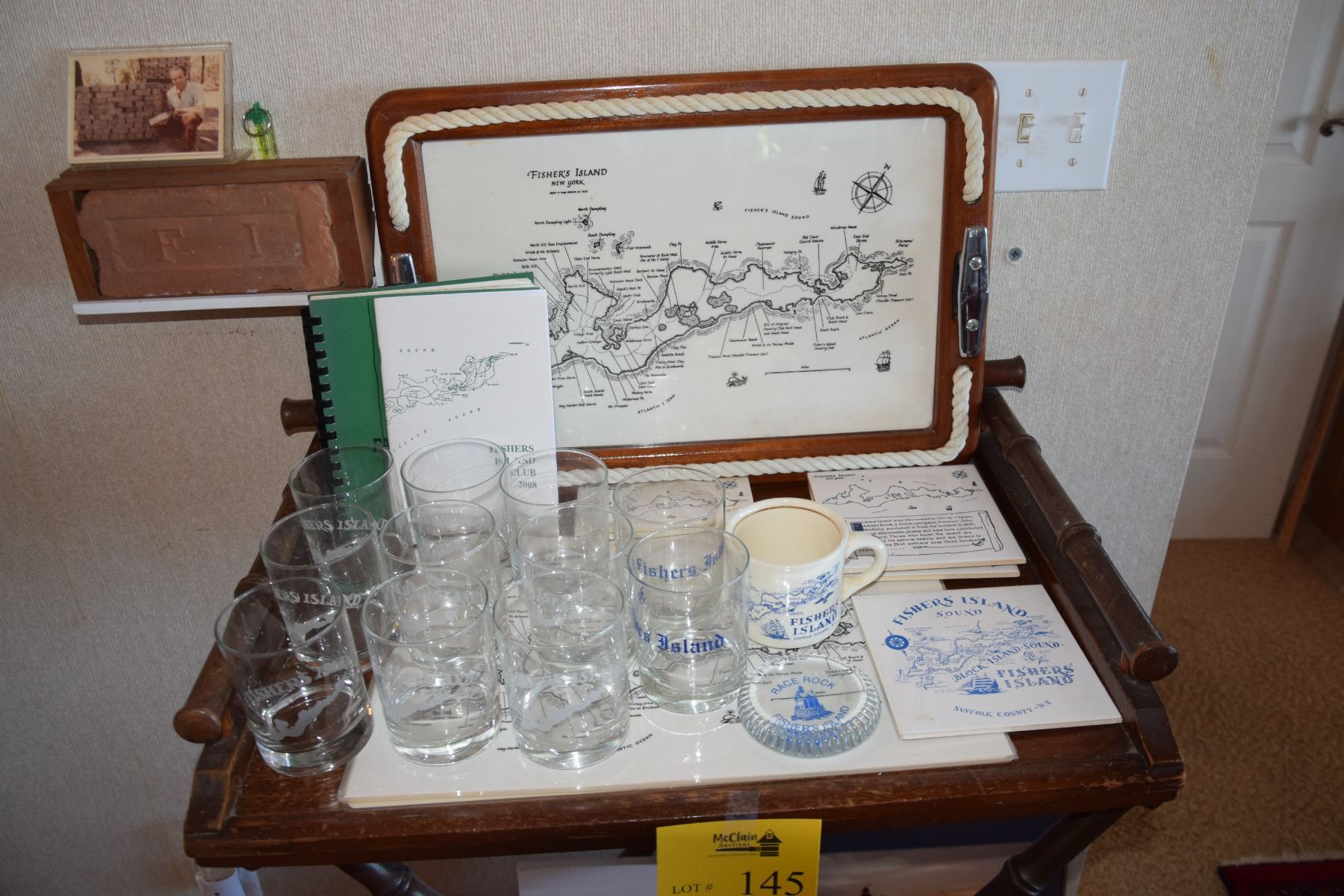 FISHER ISLAND MEMORABILIA: TRAY, HIGHBALL GLASSES, MUG, PAPERWEIGHT, TRIVETS, CLOCK, PLACEMATS, BOOKS, BRICK, ETC.