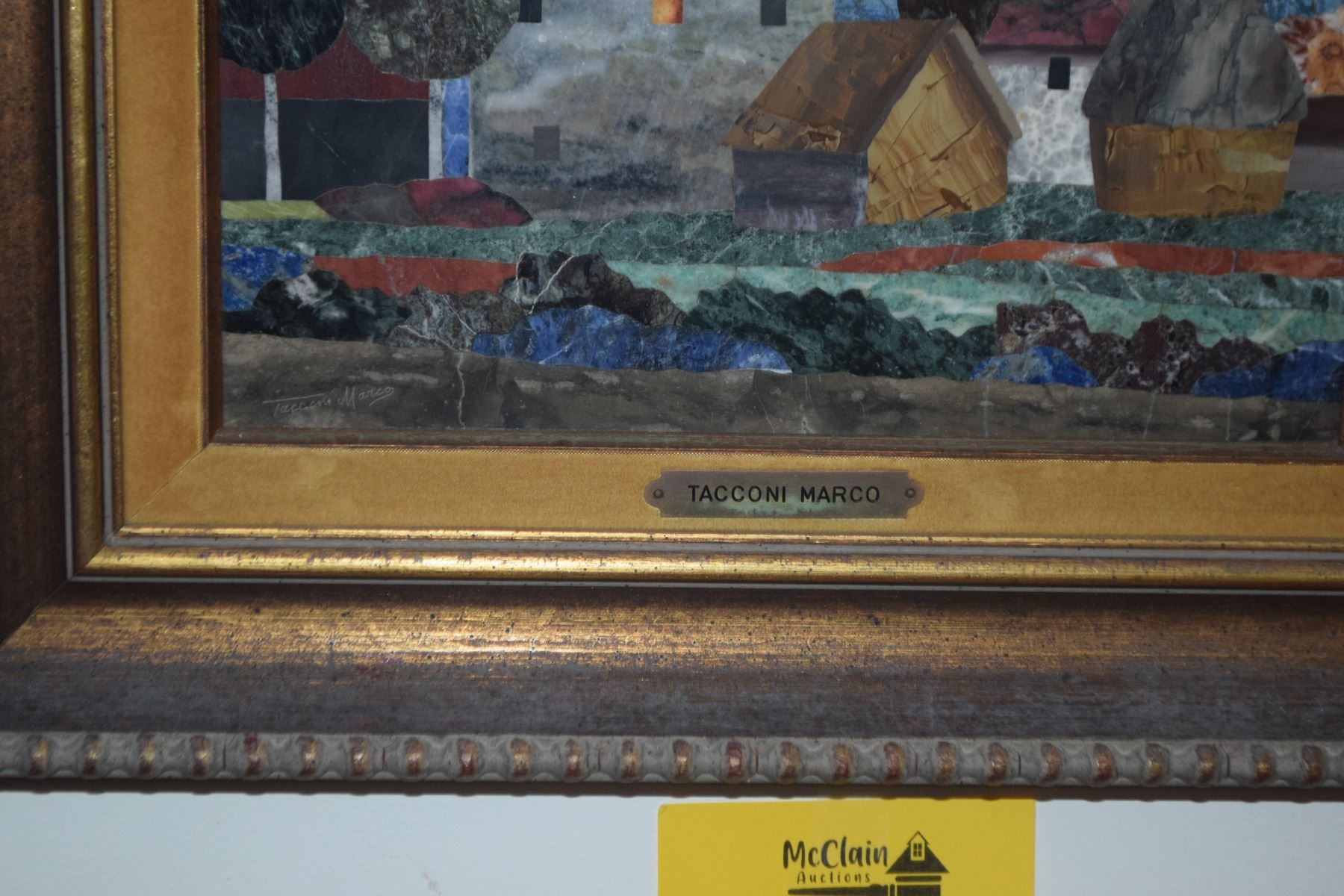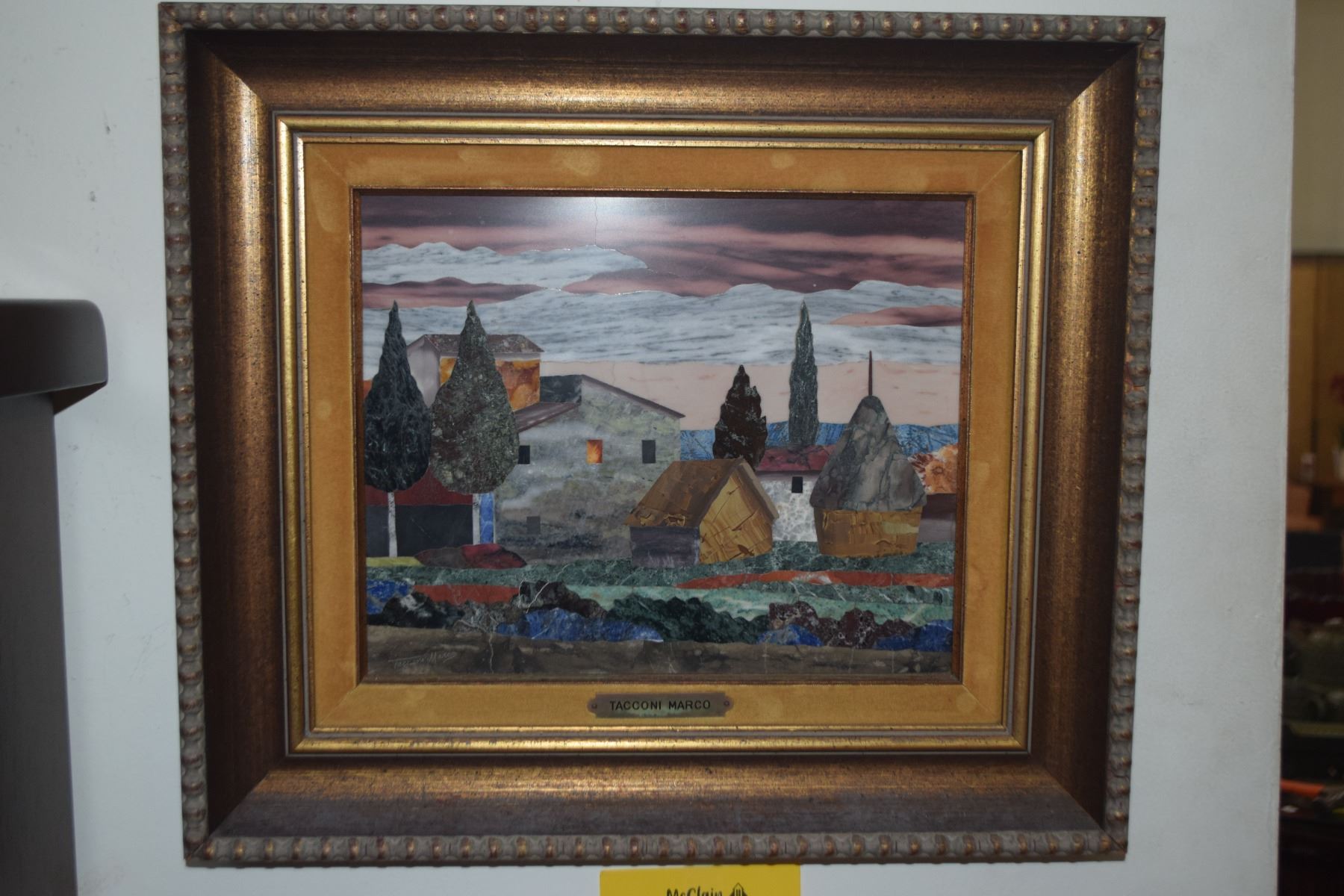 FRAMED 20TH CENTURY ITALIAN PIETRE DURA LANDSCAPE PANEL BY RACCONI MARCO, INLAID W/SEMI-PRECIOUS STONES & MARBLE, DEPICTING AN ITALIAN COUNTRYSIDE SCENE W/BUILDINGS (17 1/4" X 15 1/4")