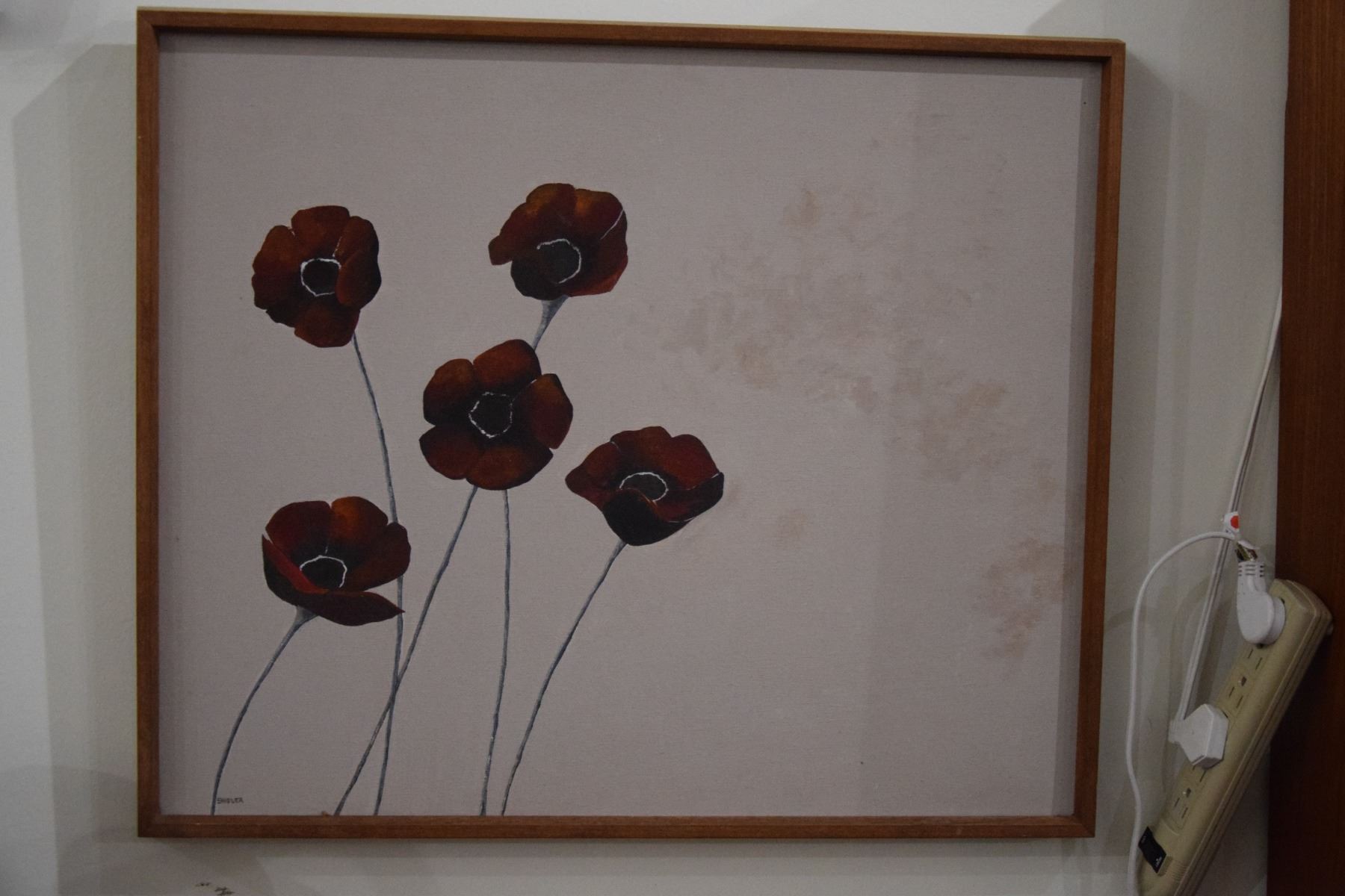 FRAMED ACRYLIC ON CANVAS, "5 POPPIES"; SIGNED SHILDER