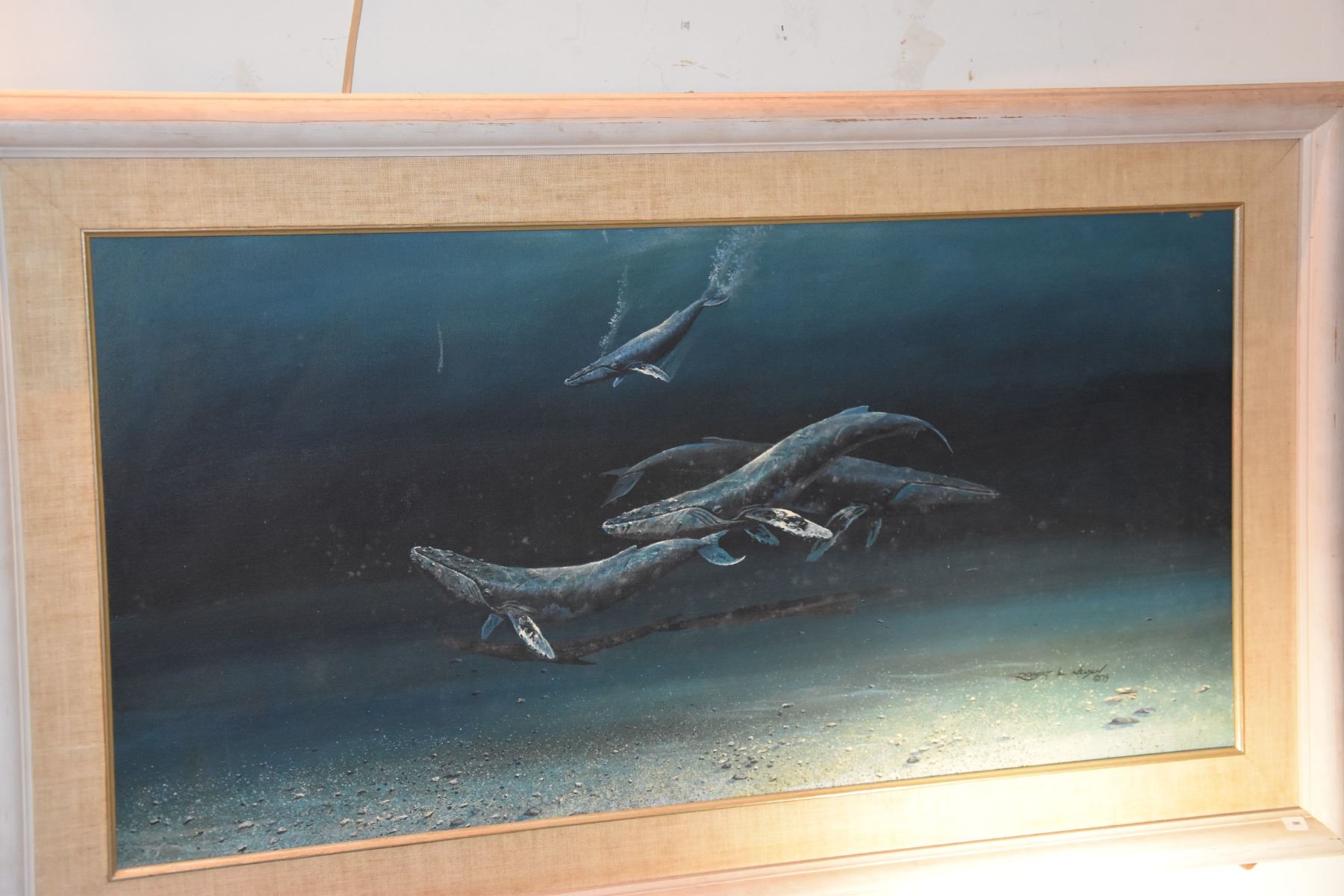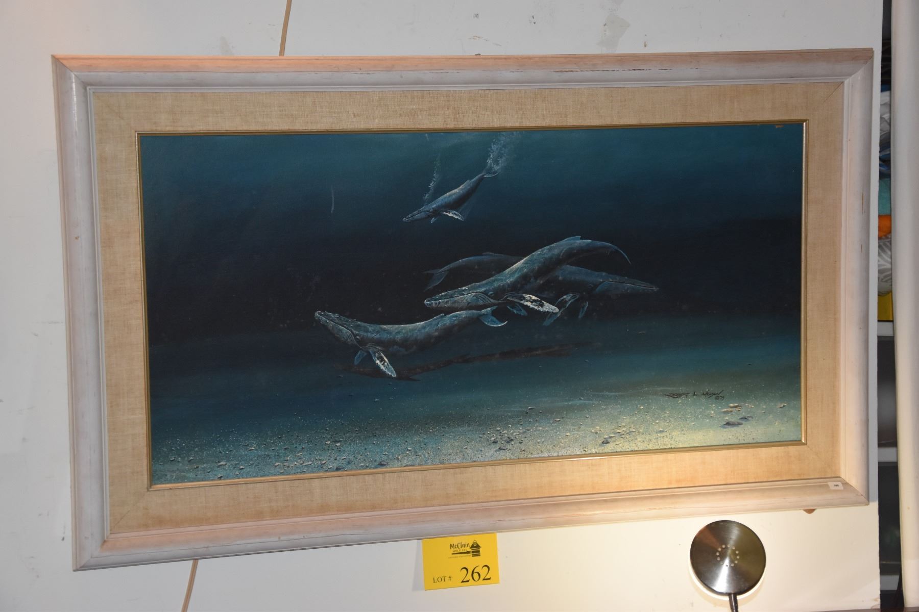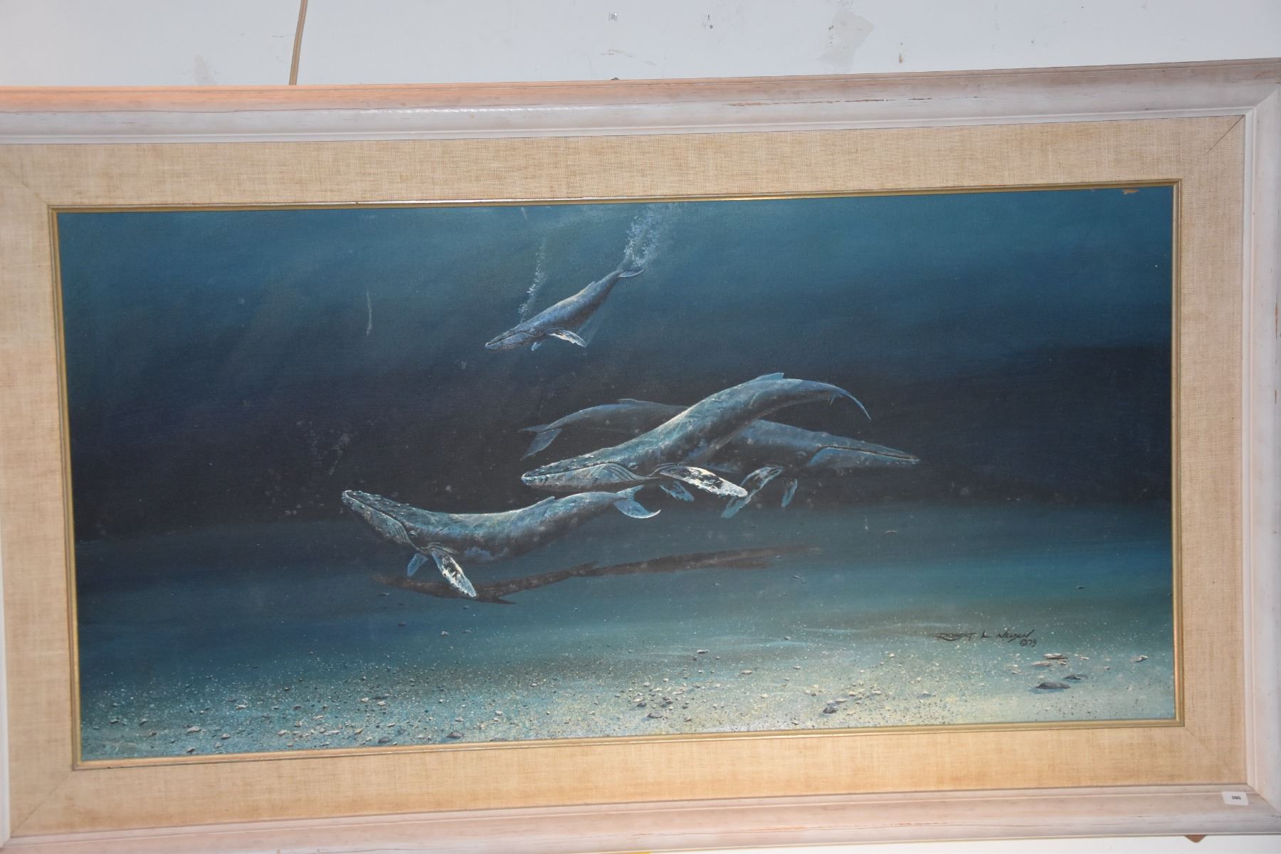 FRAMED ACRYLIC OR OIL ON CANVAS BY ROBERT LYN NELSON, UNKNOWN TITLE, DATED 1979, DEPICTING A POD OF FOUR HUMPBACK WHALES ON THE BOTTOM OF THE OCEAN; SIGNED & DATED ROBERT LYN NELSON 79