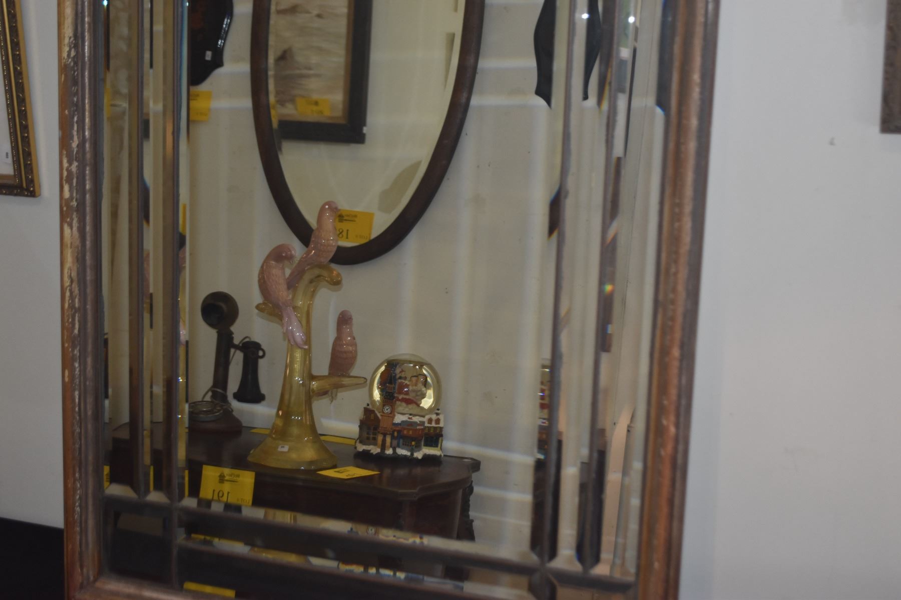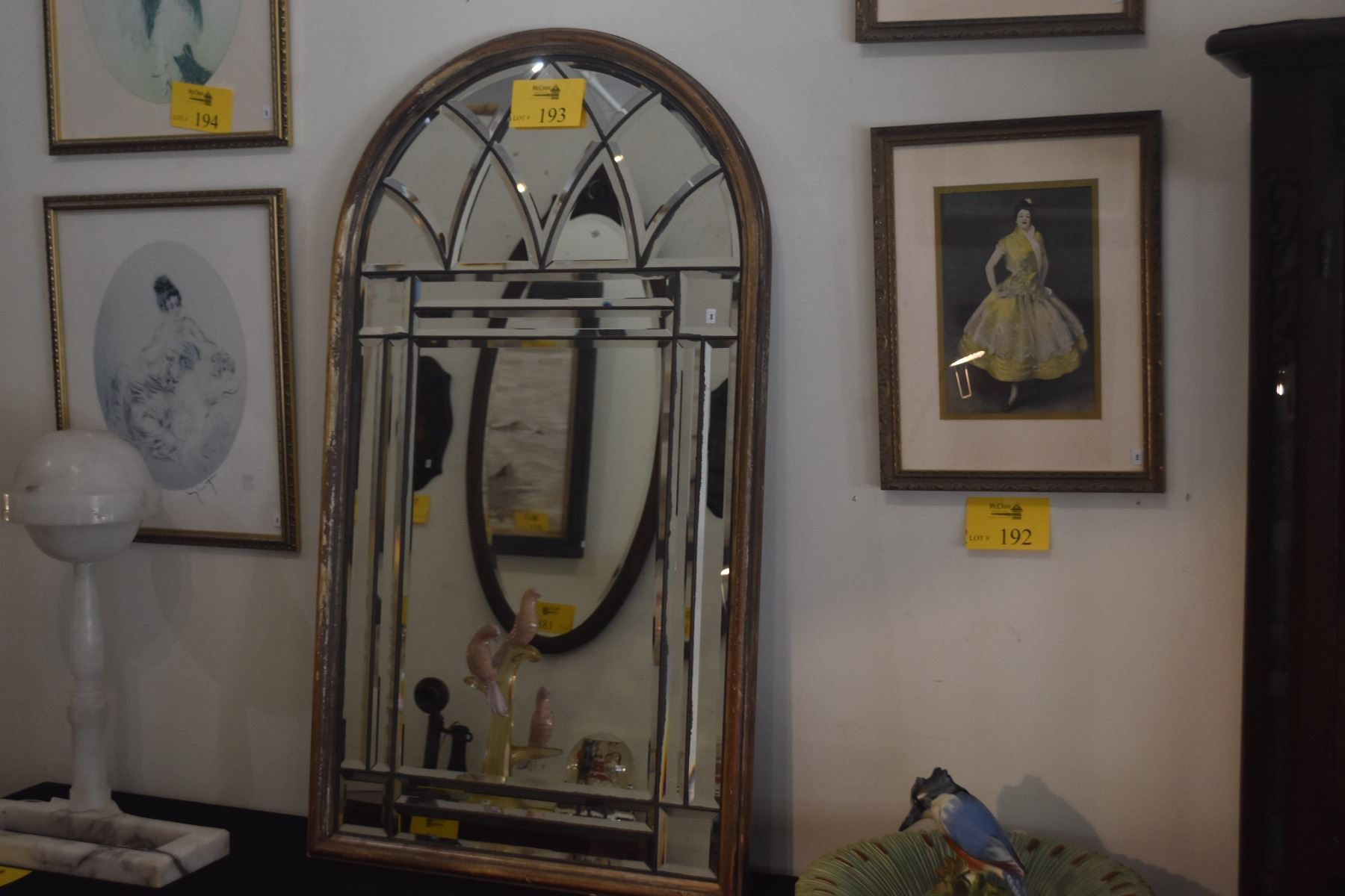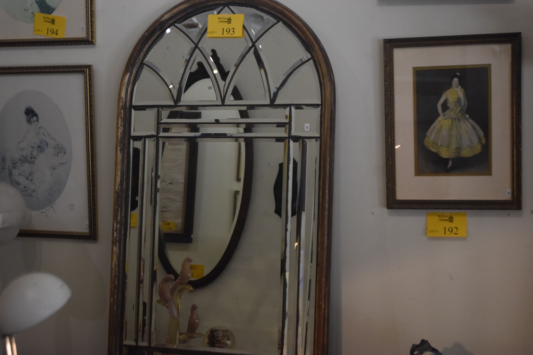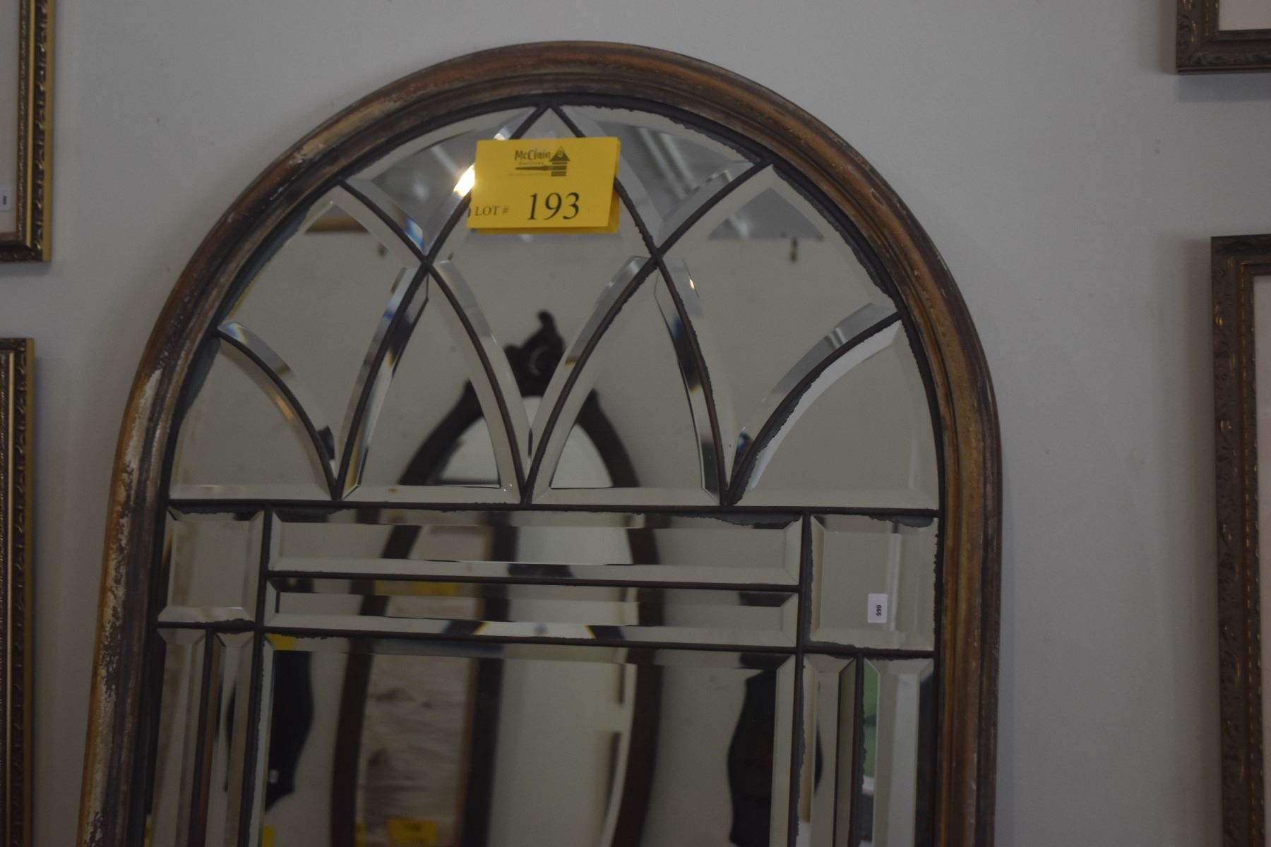 FRAMED BEVELED WALL MIRROR, ARCHED CATHEDRAL WINDOW DESIGN (26" X 46")
