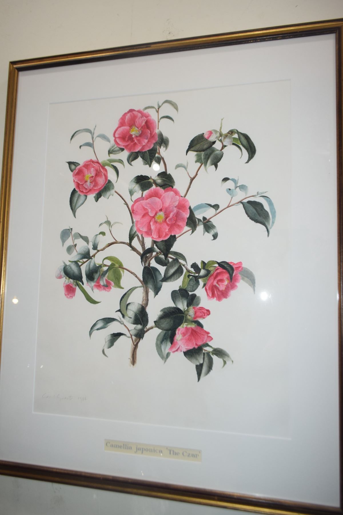 FRAMED ENGLISH BOTANICAL WATERCOLOR ON PAPER, CAMELLIA JAPONICA "THE CZAR", DEPICTING A DEEP PINK FLOWERING CAMELLIA BRANCH W/MULTIPLE BLOSSOMS; SIGNED & DATED CAROL GUEST 1984 (35" X 43")