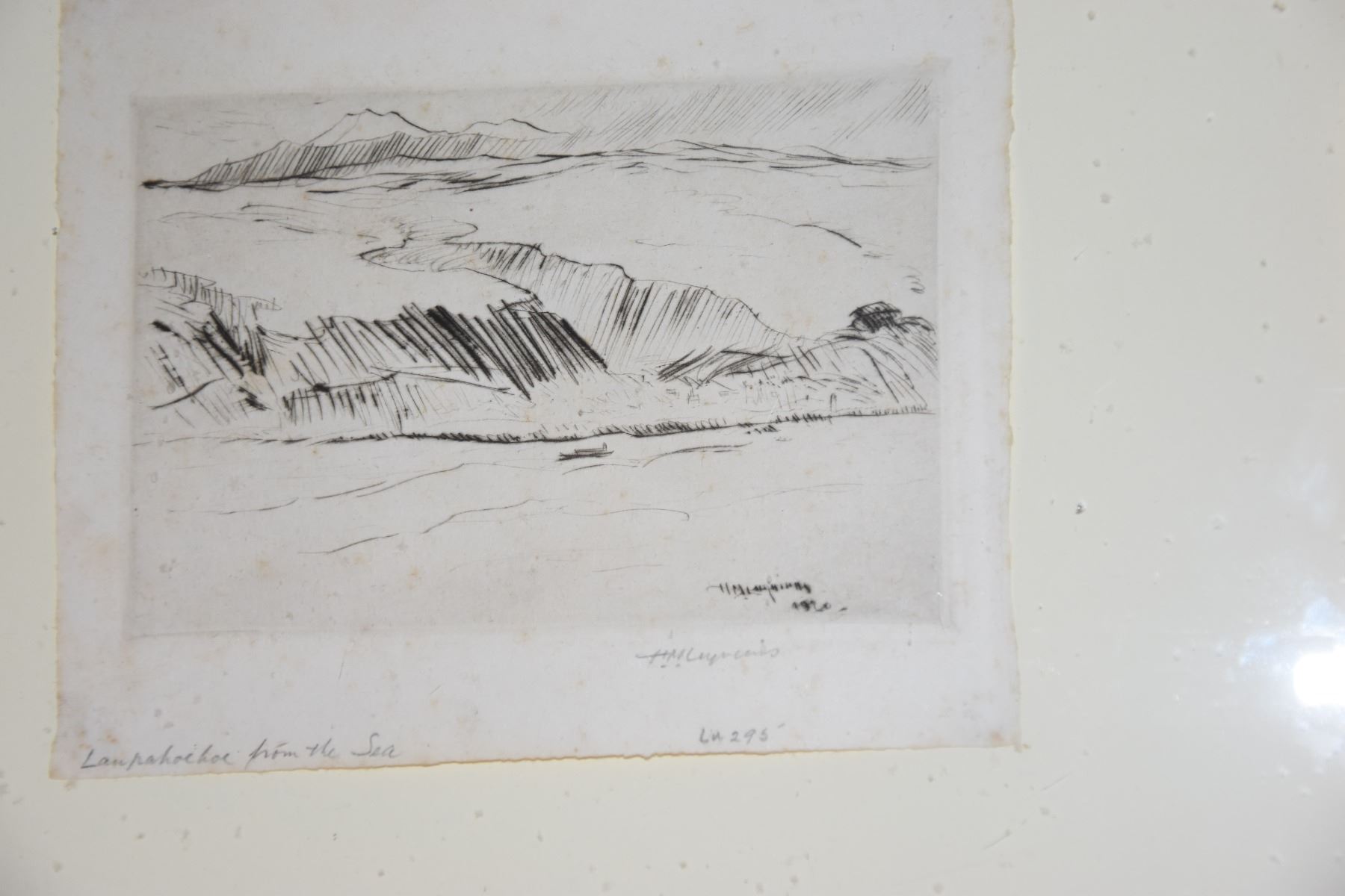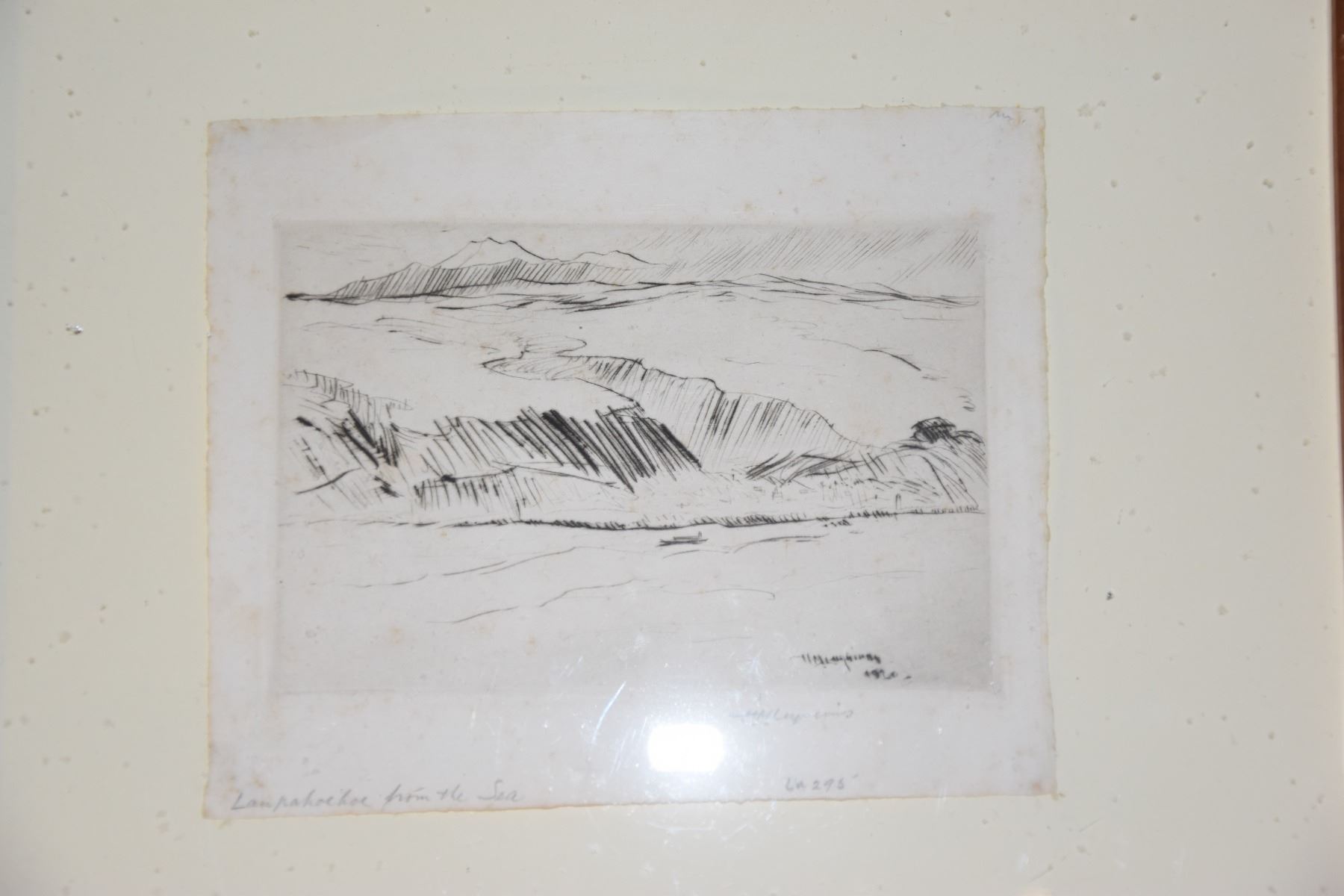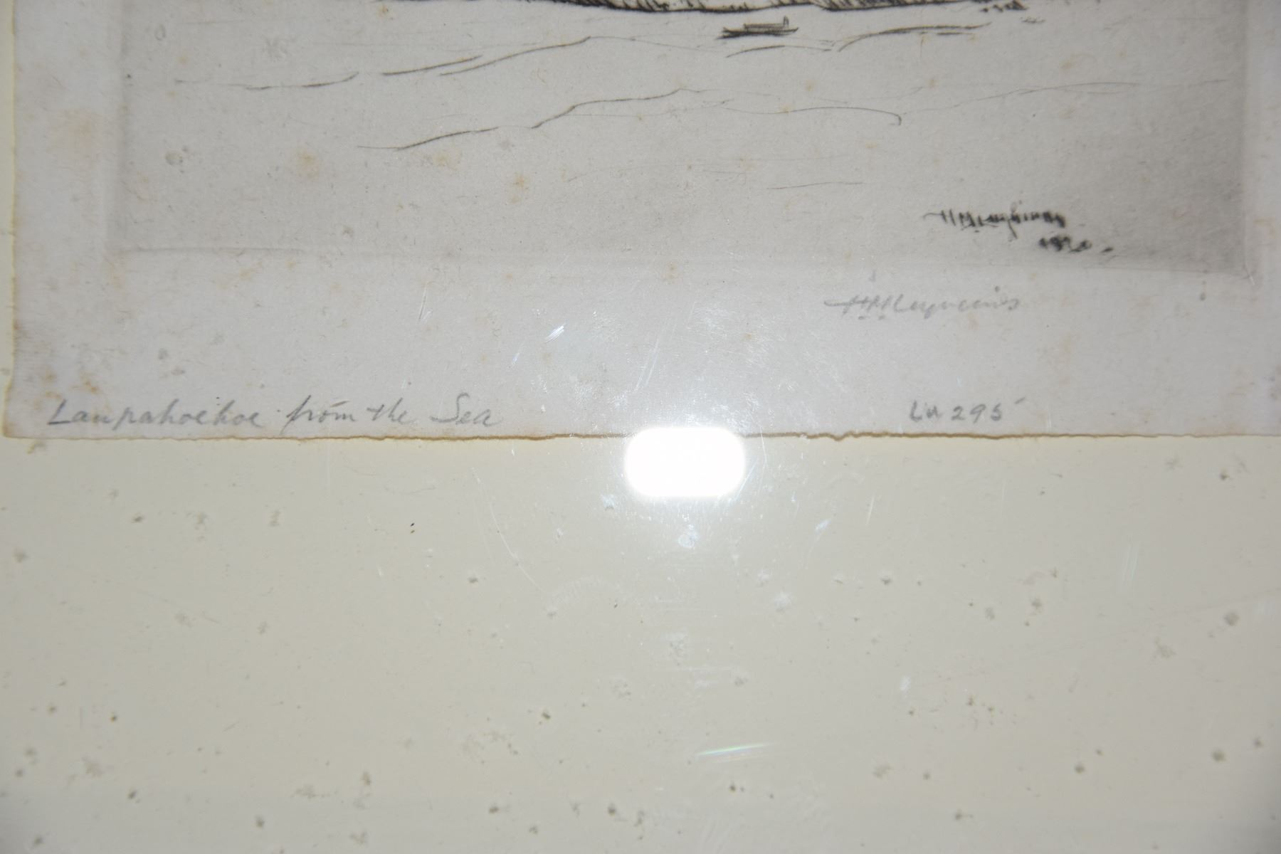 FRAMED ETCHING, "LAUPAHOEHOE FROM THE SEA"; SIGNED H.M. LUQUIENS (12" X 11")