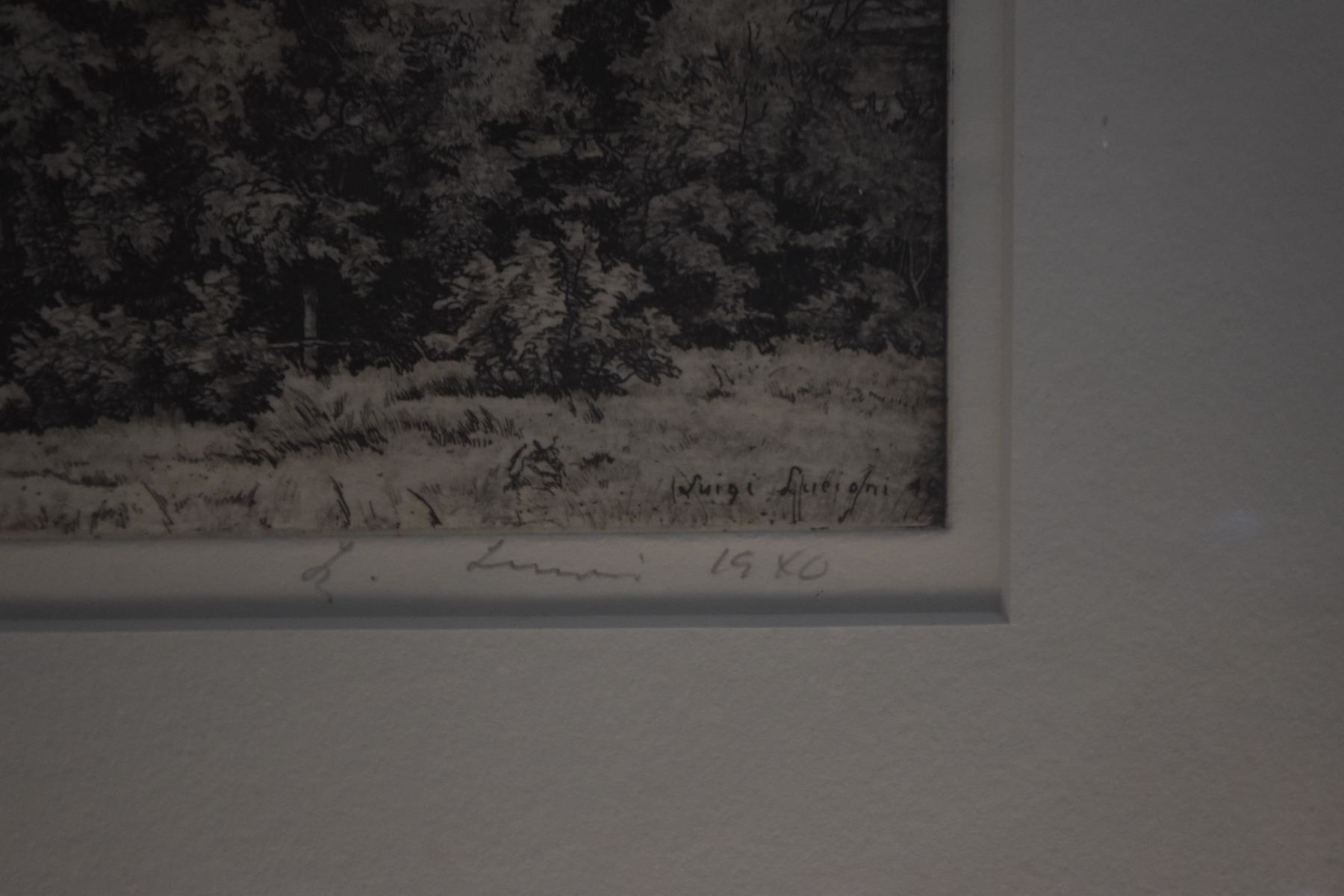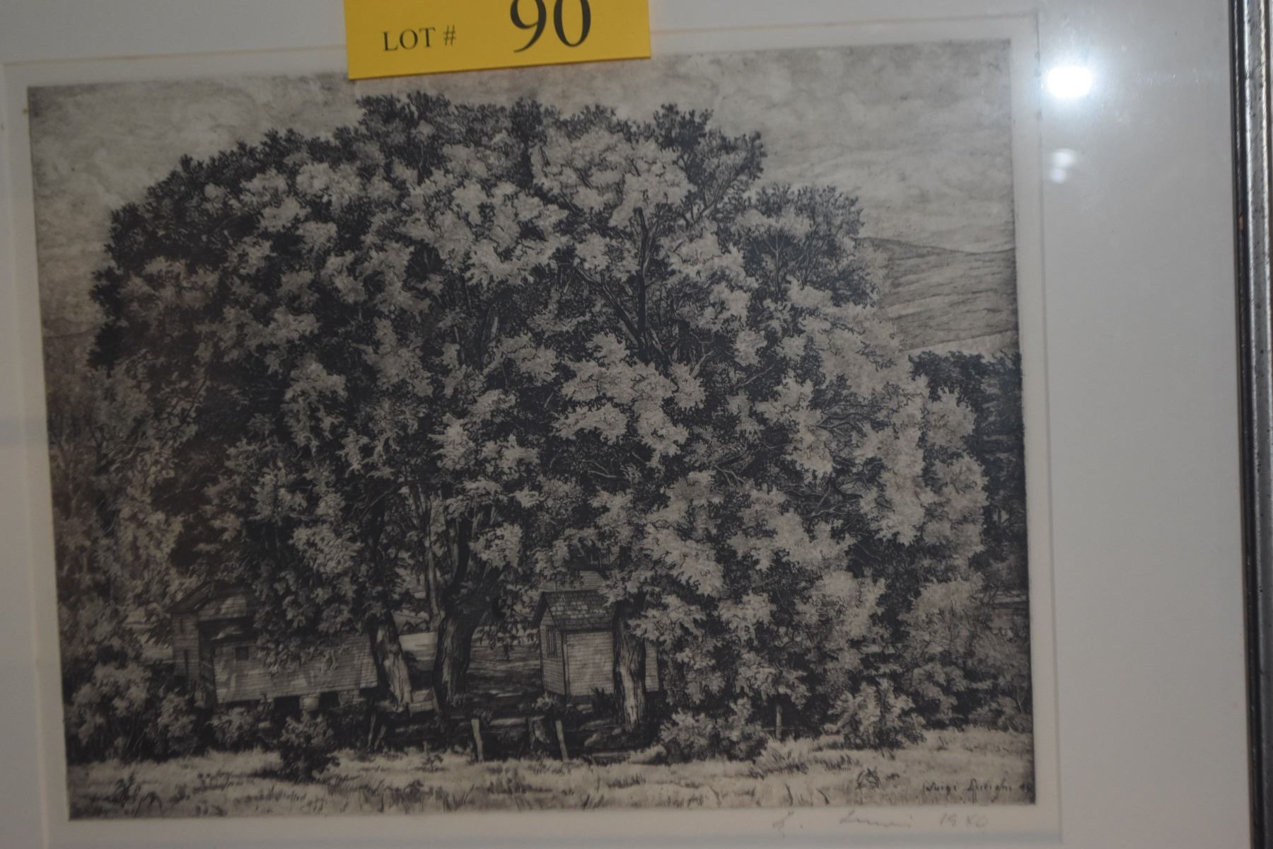 FRAMED ETCHING TITLED "THE BIG WILLOWS" BY LUIGI LUCIONI, 1946 (21" X 18 1/4")