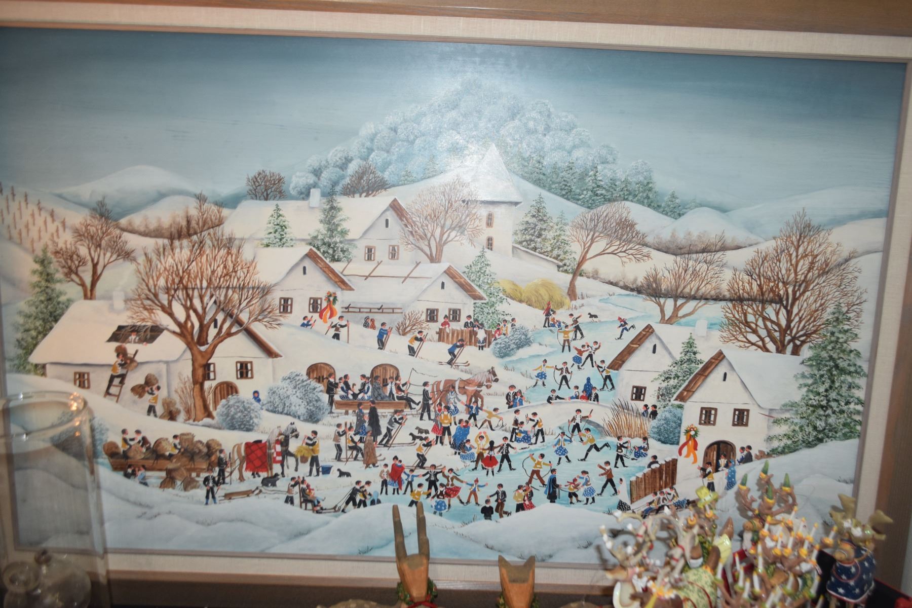 FRAMED HUNGARIAN OIL ON PANEL, UNKNOWN TITLE, DEPICTING A FESTIVE GATHERING OF VILLAGERS IN WINTER;