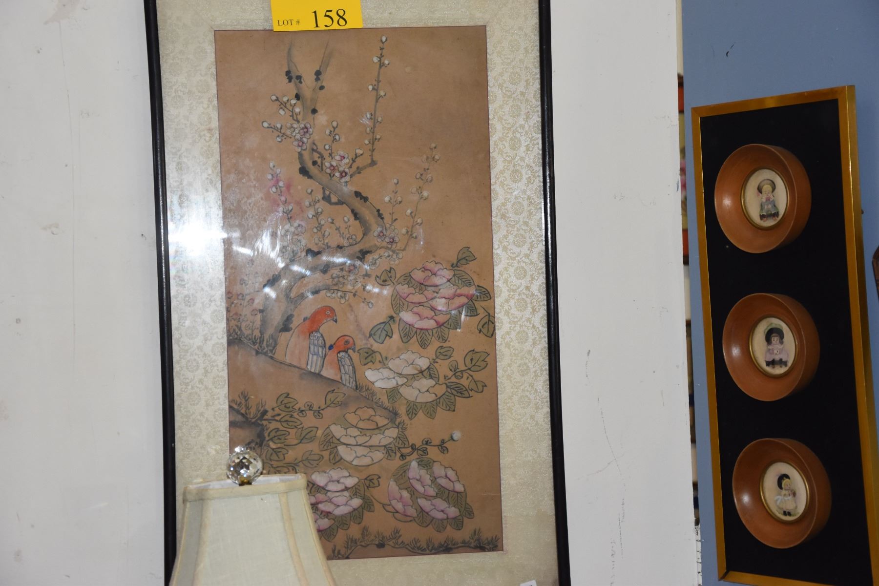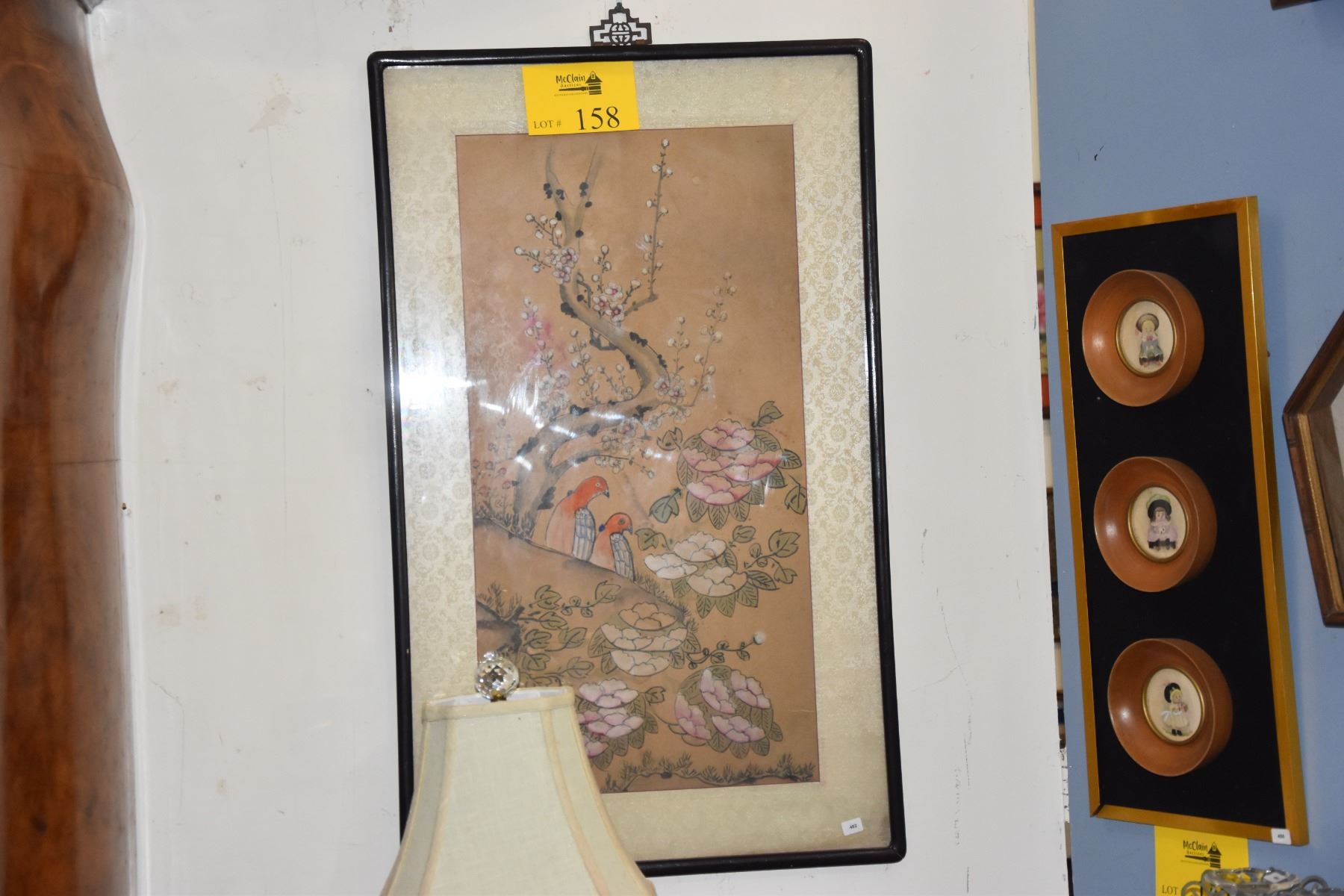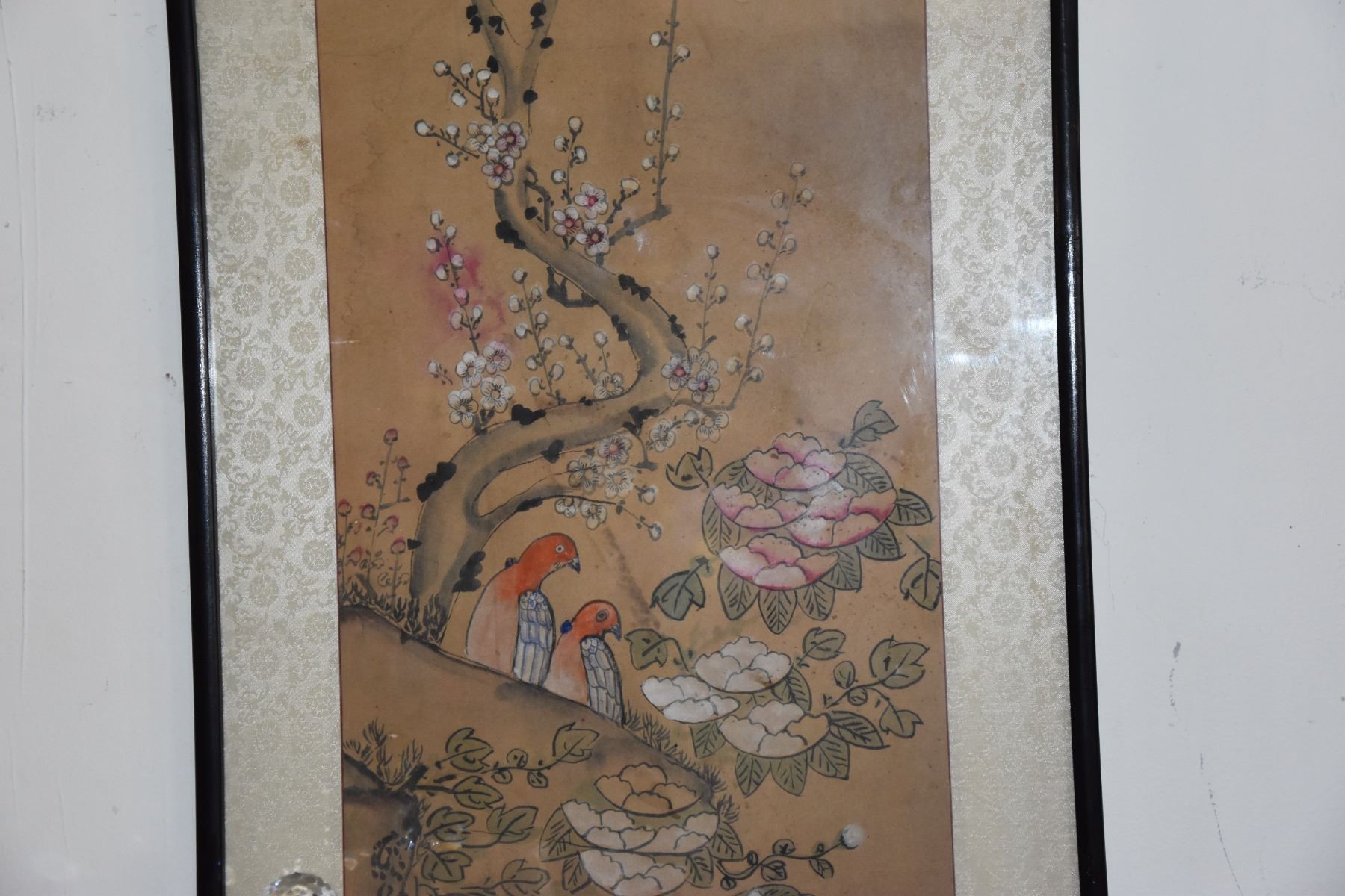 FRAMED KOREAN POLYCHROME PAINTING, BIRD & FLOWER MOTIF (18 1/2" X 30 3/4")