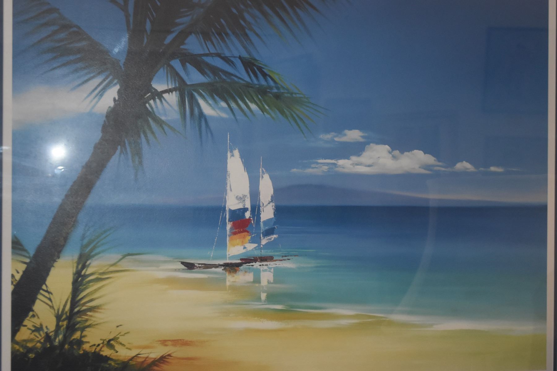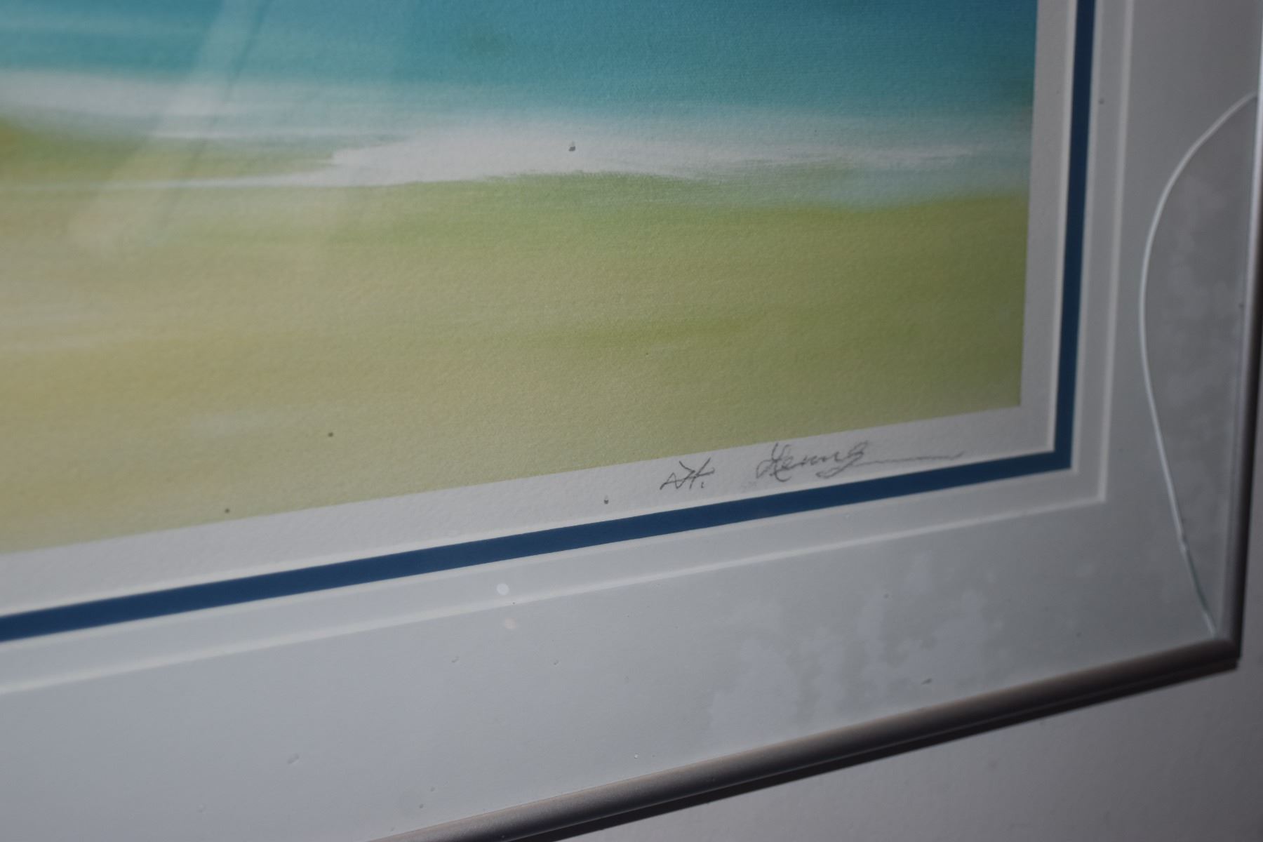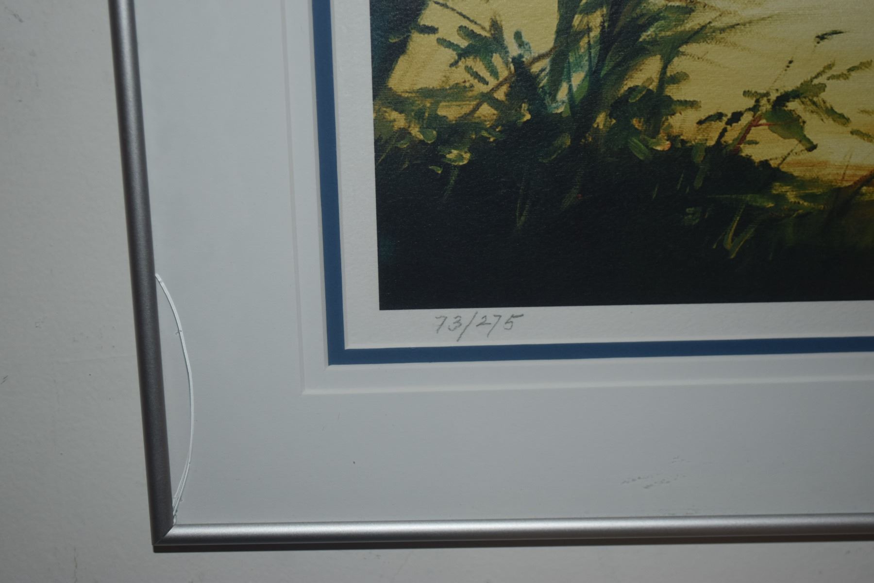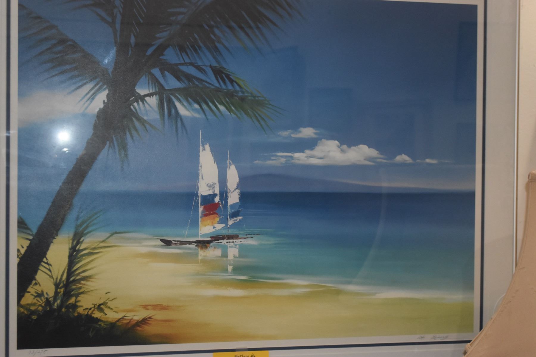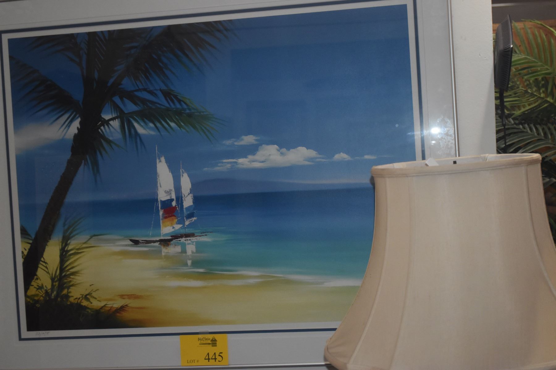 FRAMED LITHOGRAPHIC PRINT, SAILBOAT ON SHORE; SIGNED 73/275 (40" X 33 1/4")