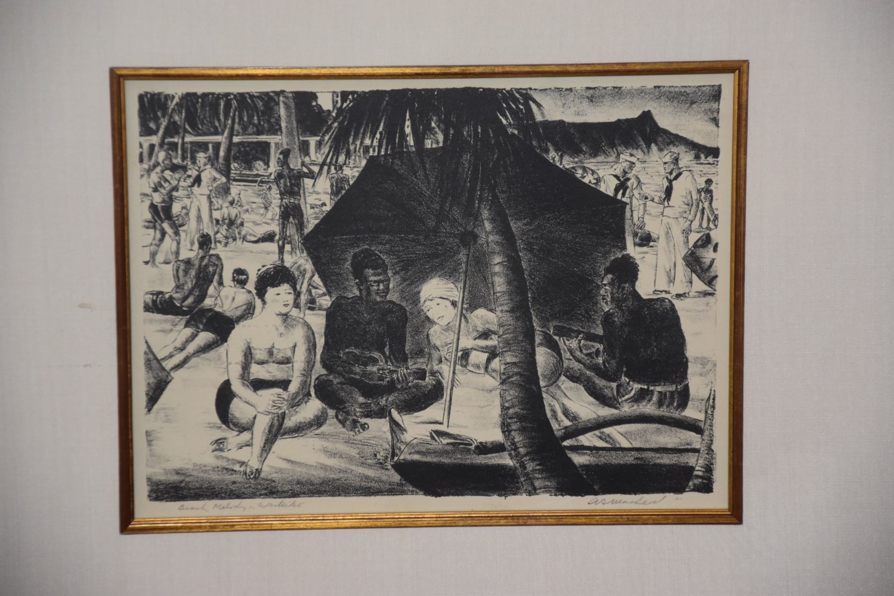FRAMED MACLEOD ETCHING, "BEACH MELODY - WAIKIKI" (29" X 25")