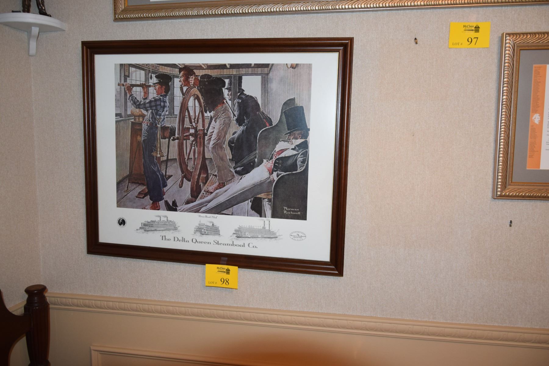 FRAMED NORMAN ROCKWELL POSTER, "RIVER BOAT PILOT"; DELTA QUEEN STEAMBOAT CO.