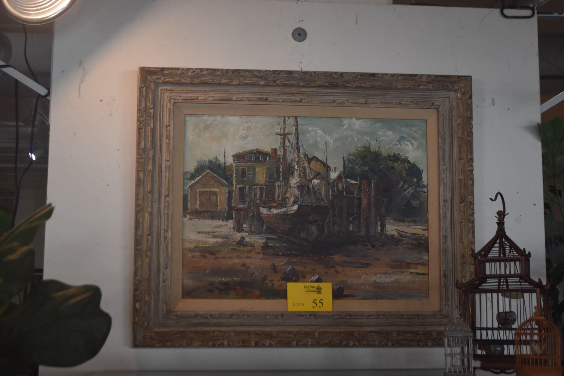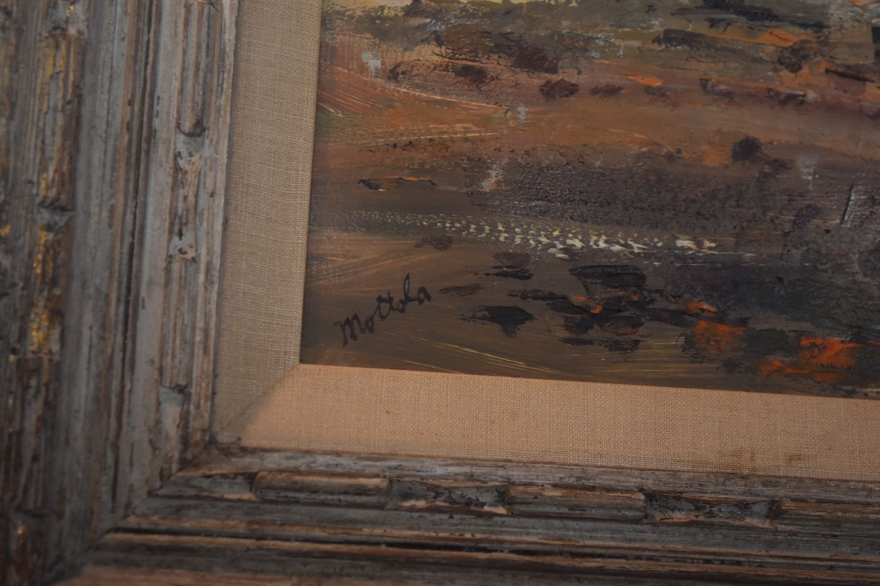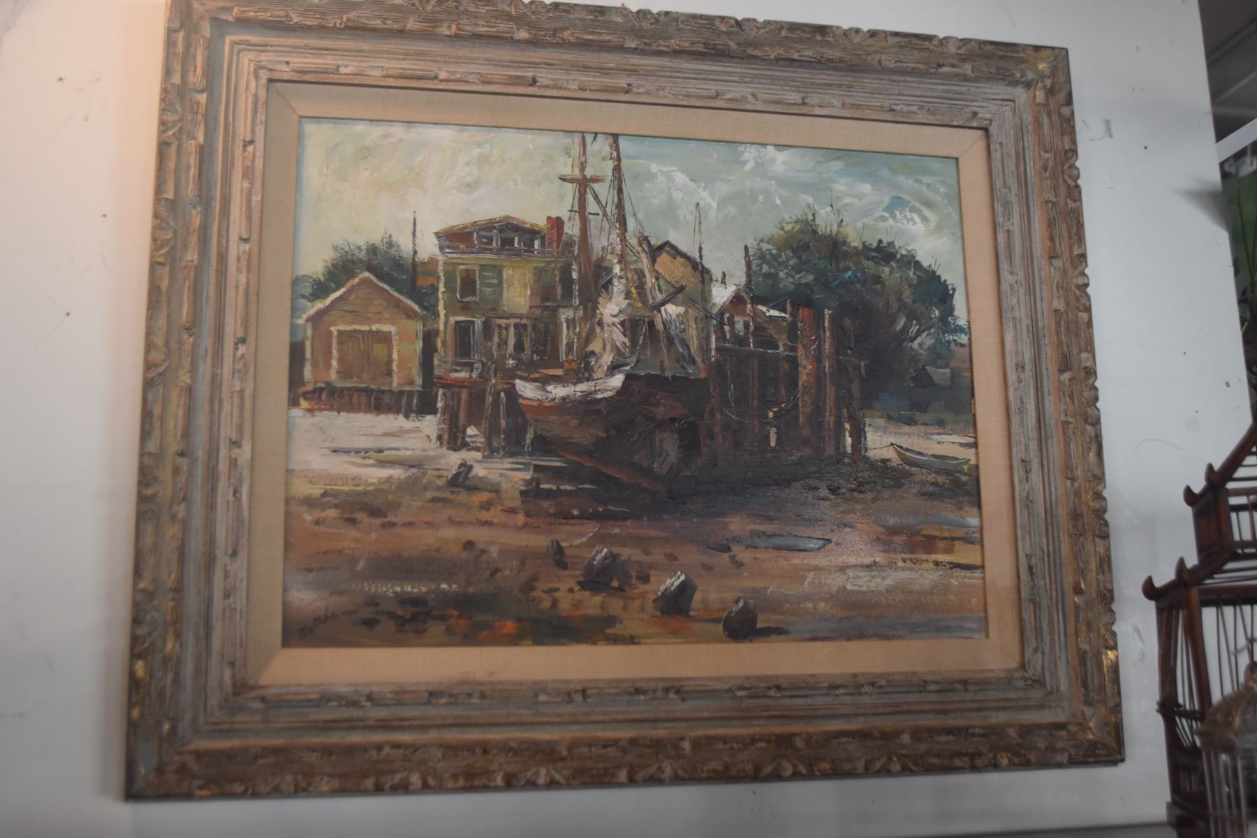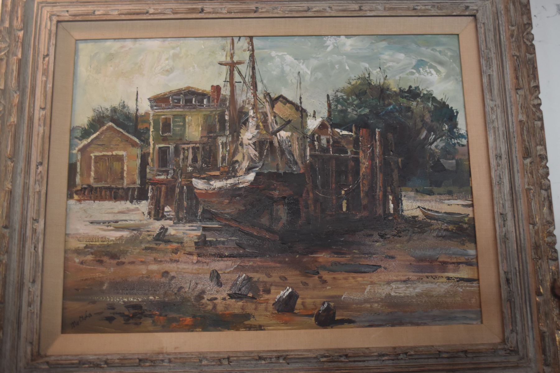 FRAMED OIL ON BOARD, "BOAT & WHARF"; SIGNED MOTTOLA (32" X 26 1/2")