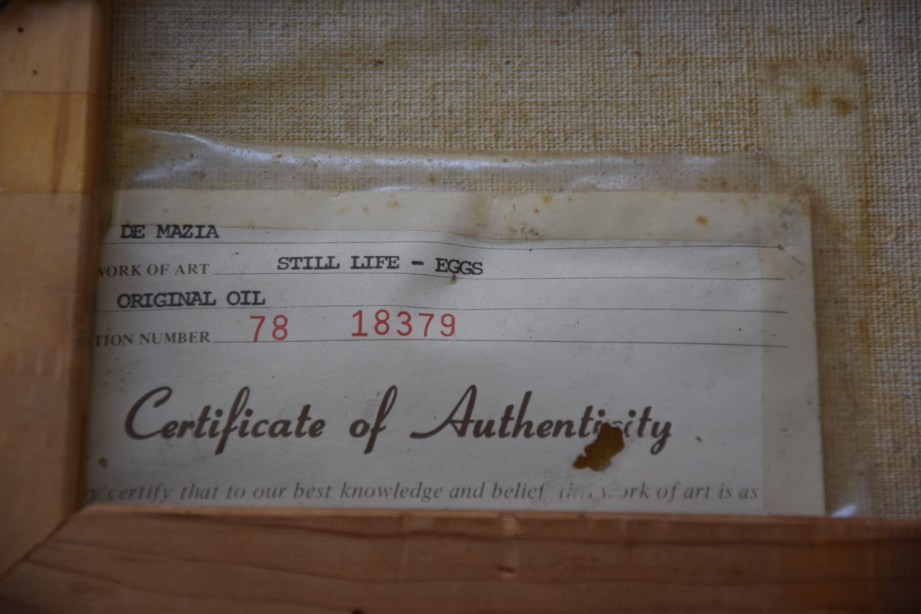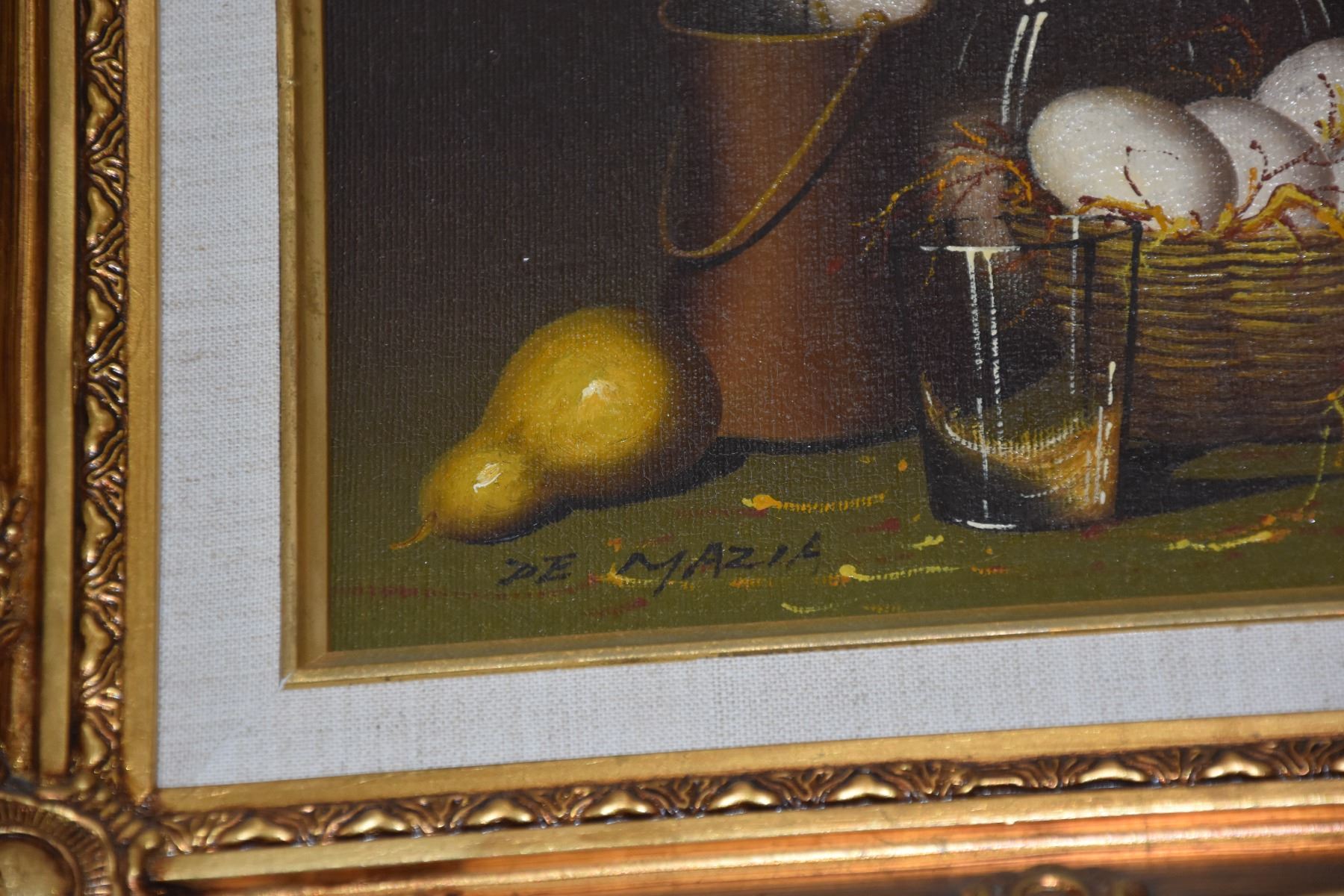 FRAMED OIL ON CANVAS, STILL LIFE; SIGNED DE MAZIA (15" X 13")