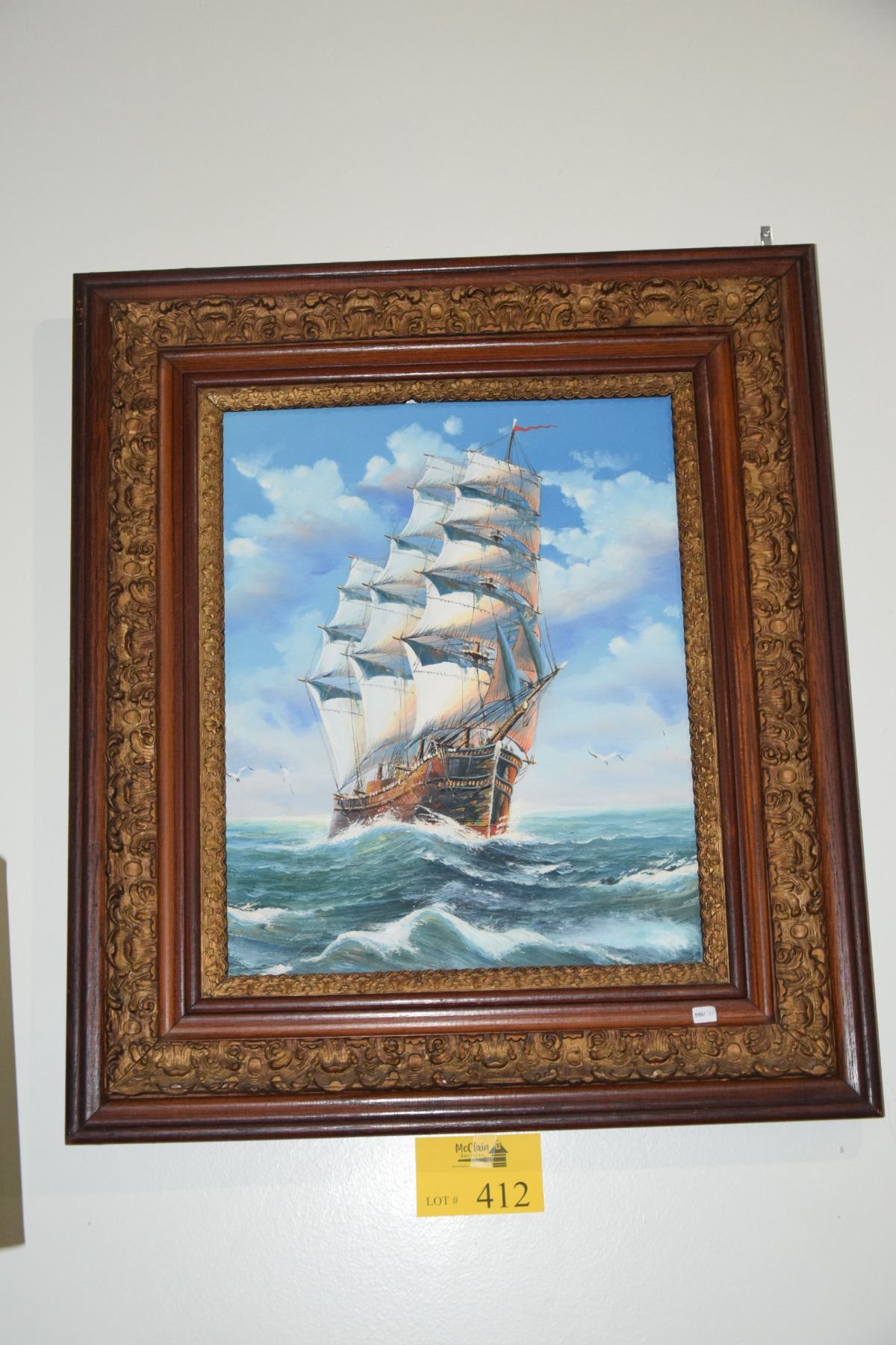 FRAMED OIL ON CANVAS, "TALL SHIP" (ANTIQUE OAK FRAME) (26" X 30")