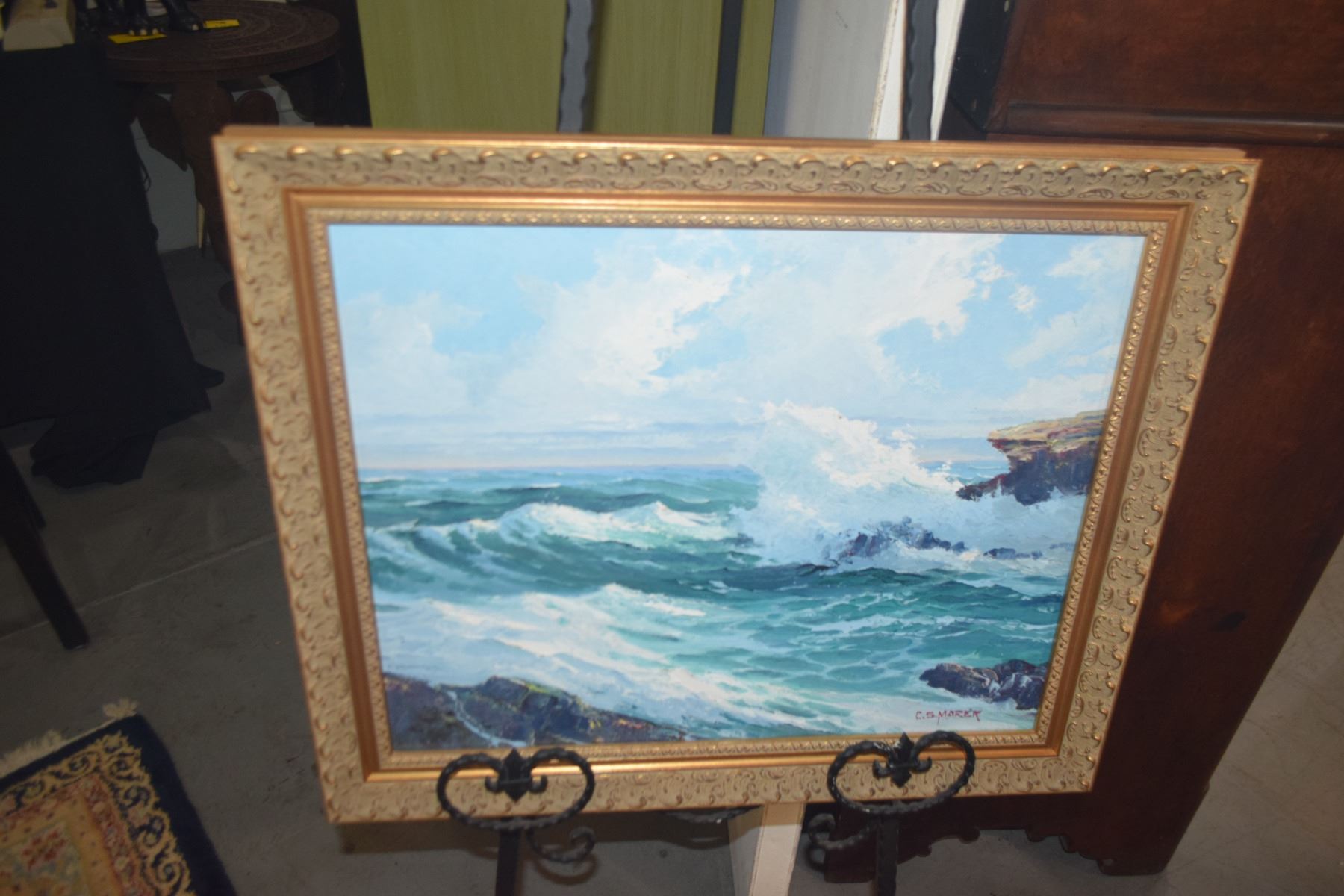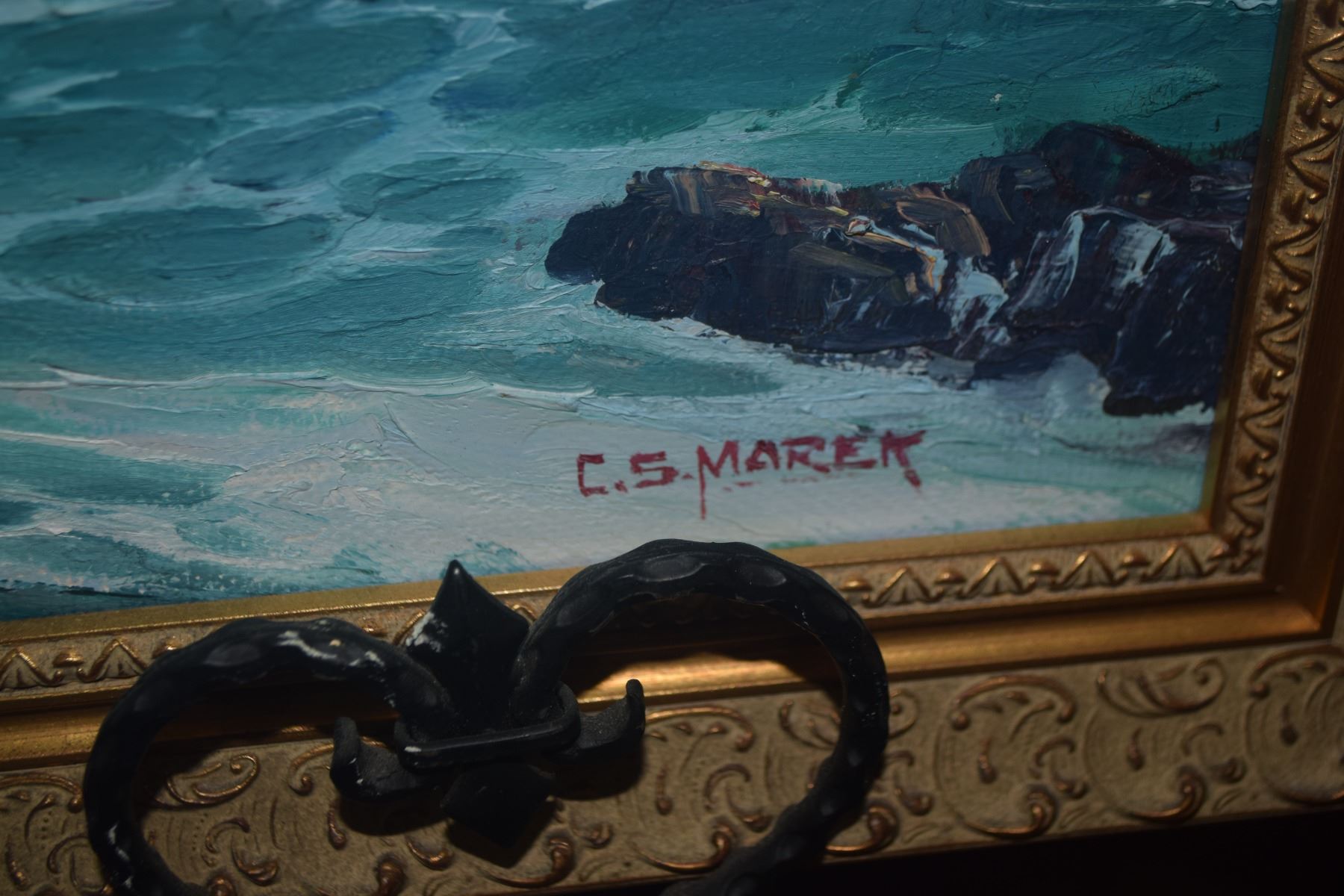 FRAMED OIL ON PANEL, UNTITLED, DEPICTING A HAWAIIAN SEASCAPE W/A WAVE BREAKING ON A ROCKY SHORELINE; SIGNED C.S. MAREK (CHARLES S. MAREK) (1891-1979) (23 1/4" X 19 1/2")