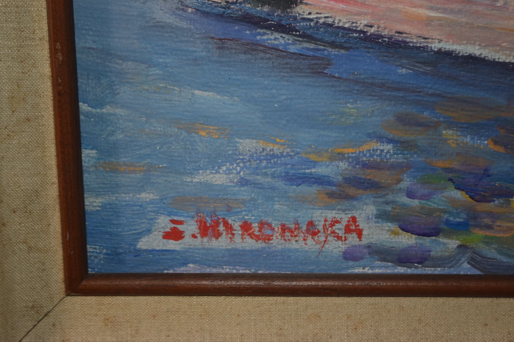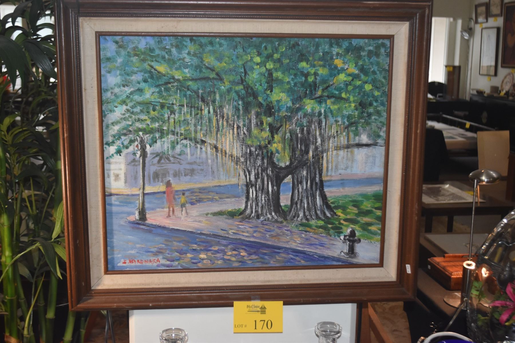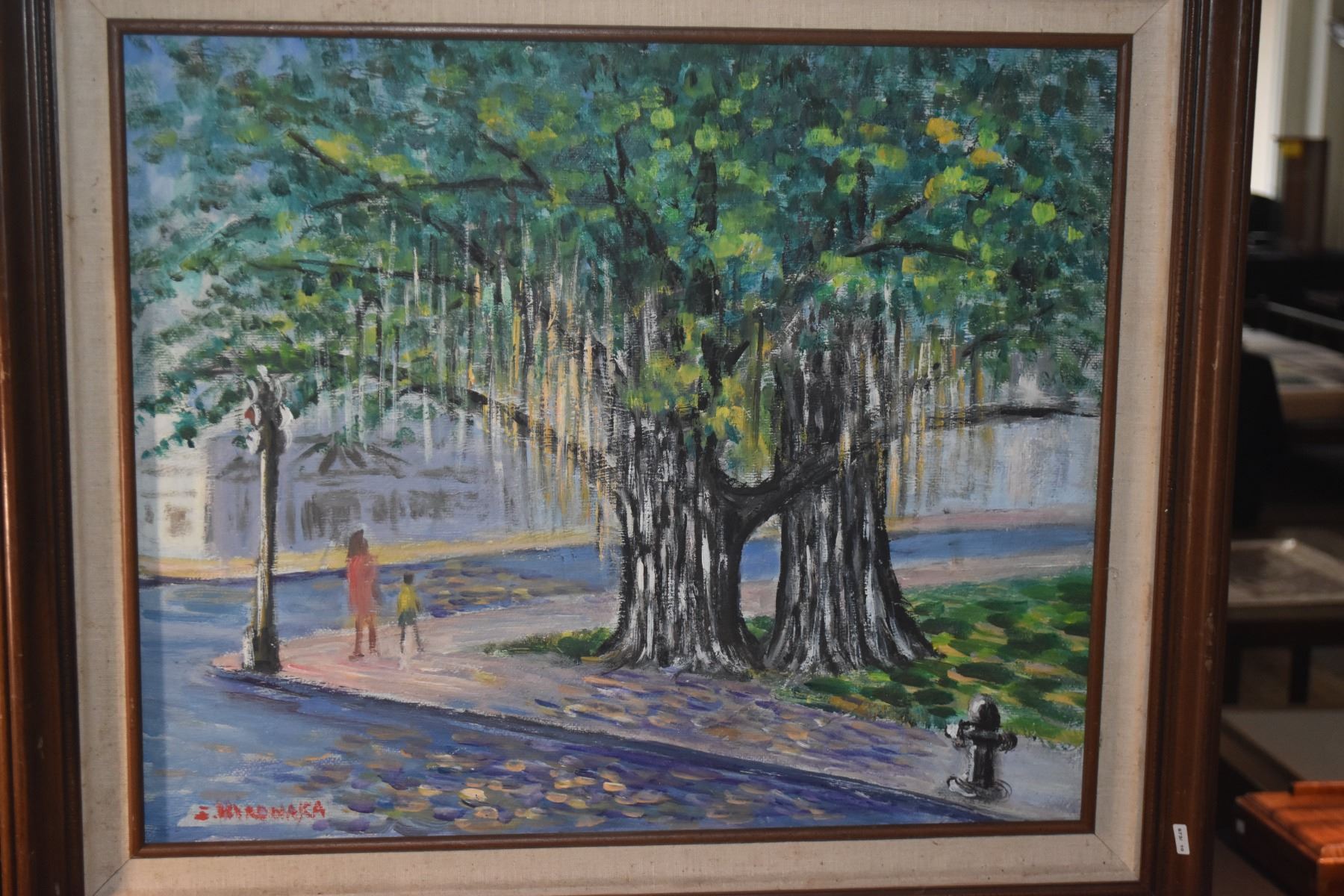 FRAMED OIL PAINTING, BANYAN TREES; SIGNED S. HIRONAKA (30" X 26 1/4")