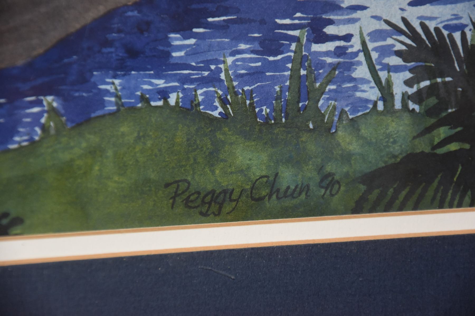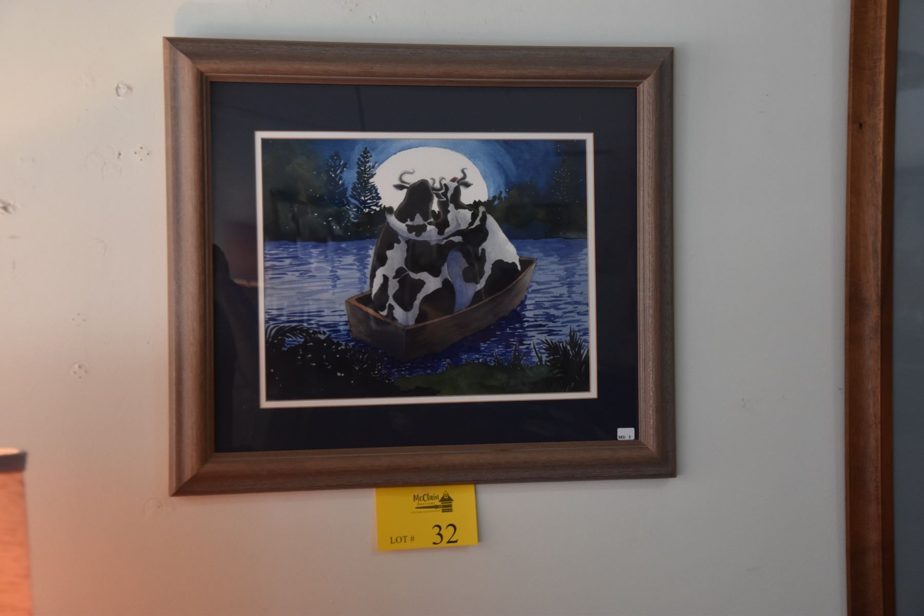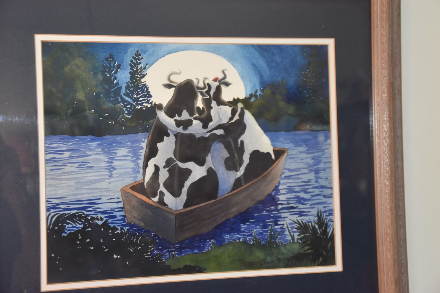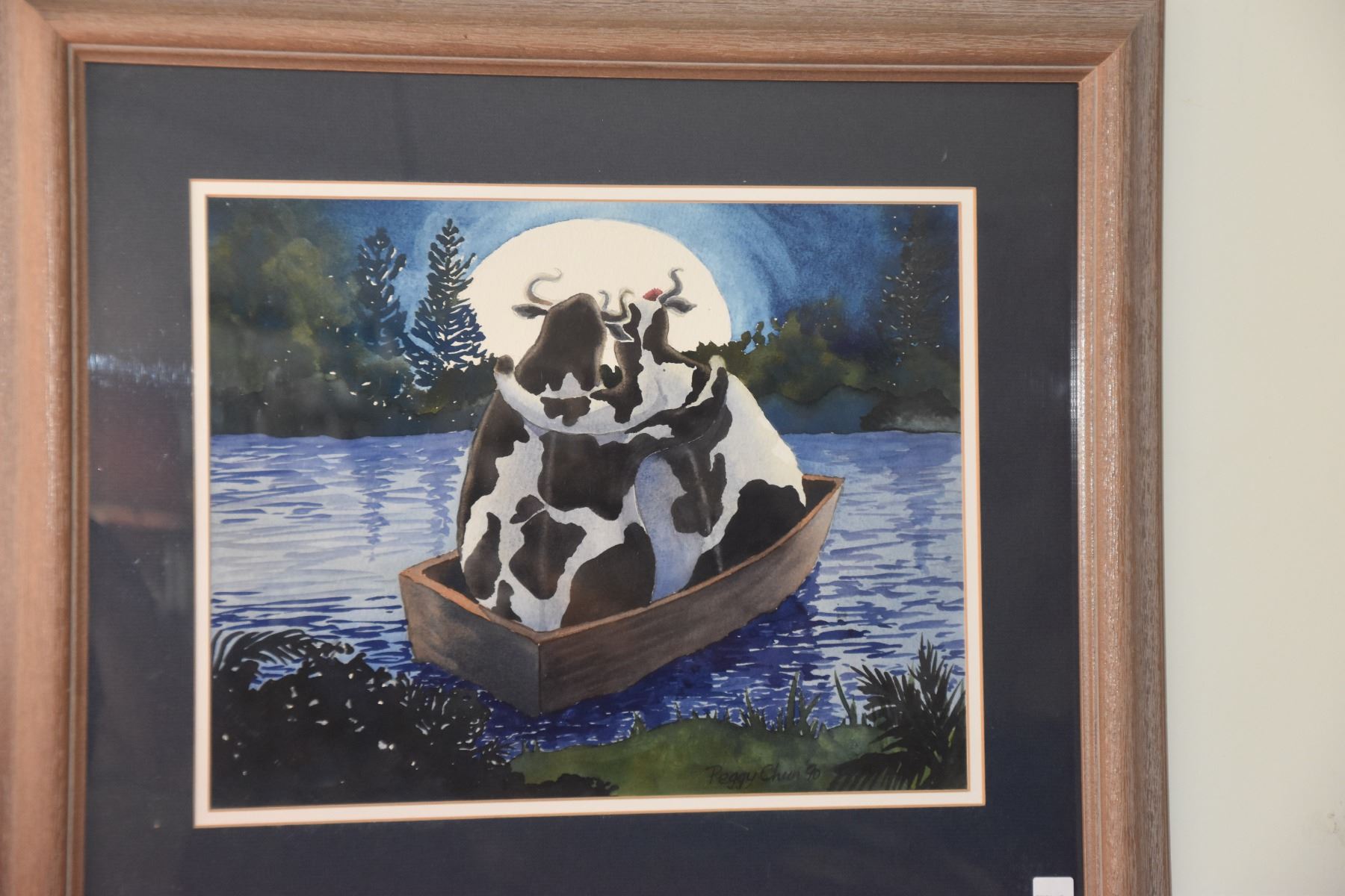 FRAMED ORIGINAL WATERCOLOR, "MOOOON RIVER - TWO HAWAIIAN COWS IN LOVE GAZING AT FULL MOON"; SIGNED PEGGY CHUN (21 1/2" X 18 1/2")