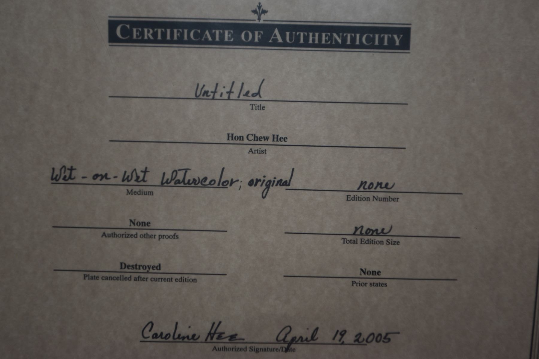 FRAMED ORIGINAL WET-ON-WET WATERCOLOR BY H.C. HEE W/CERTIFICATE (20 3/4" X 16 3/4")