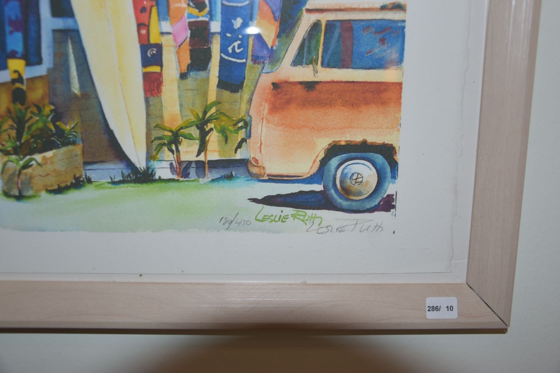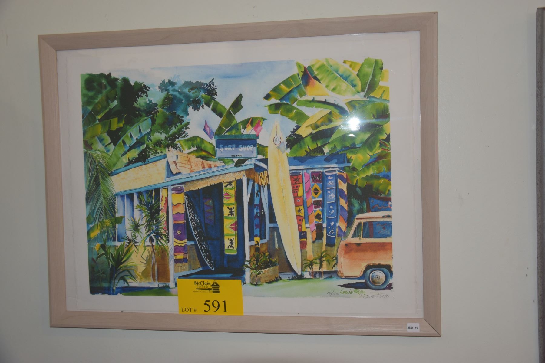 FRAMED PAINT, SURF SHOP; 180/450; SIGNED LESLIE RUTH (25 1/2" X 19 1/2")