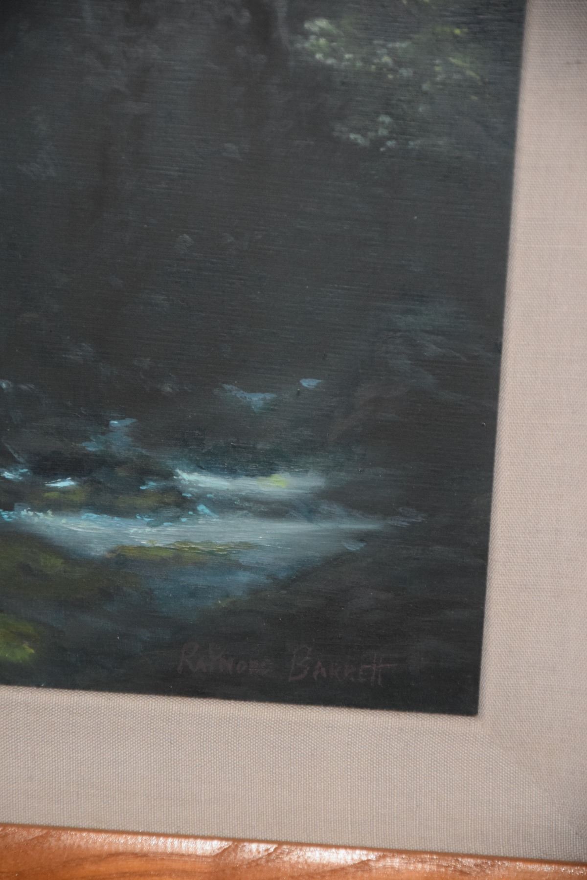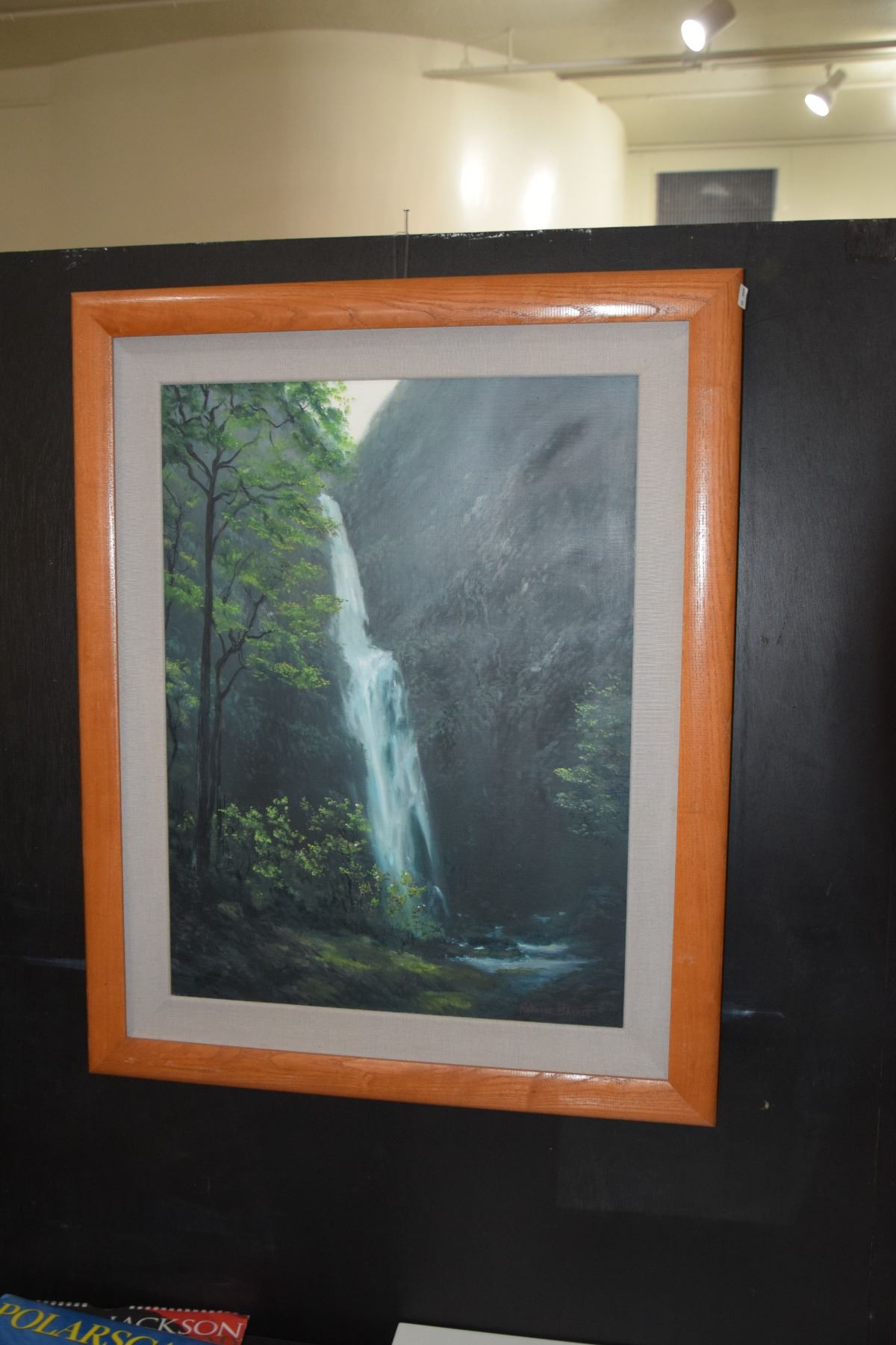 FRAMED PAINTING ON CANVAS, "HAWAIIAN WATERFALL", SIGNED RAYMOND BARRETT