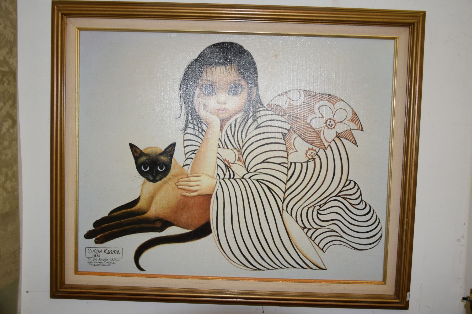FRAMED PAINTING ON CANVAS, "KIMONO CLAD GIRL W/CAT"; SIGNED MDH KEANE 1981 (MARGARET KEANE)