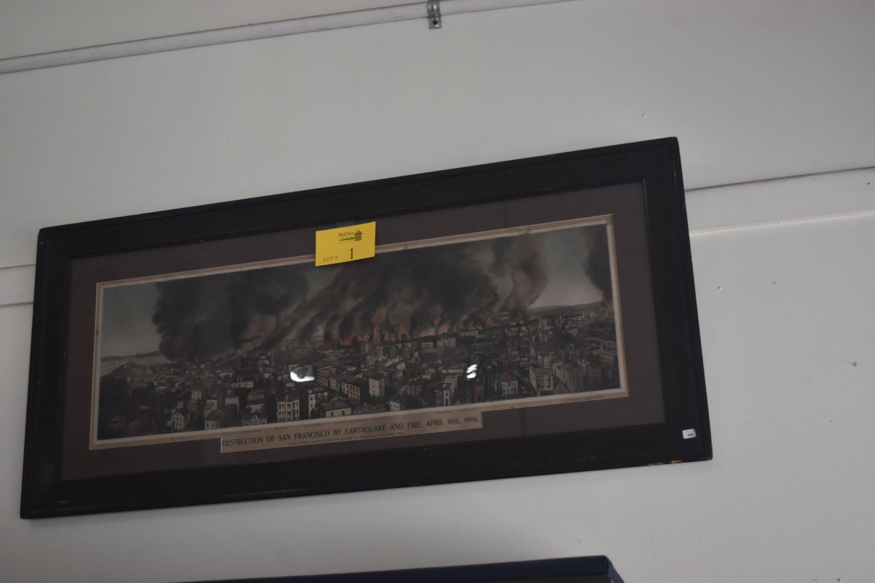 FRAMED PRINT DEPICTING THE DESTRUCTION OF SAN FRANCISCO FOLLOWING THE 1906 EARTHQUAKE & FIRE (45" X 20 1/2")