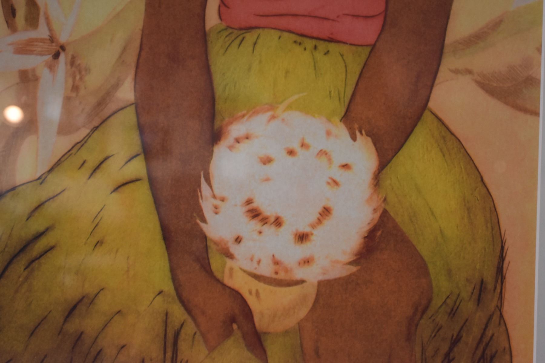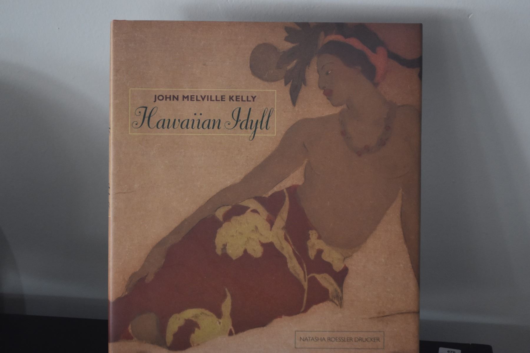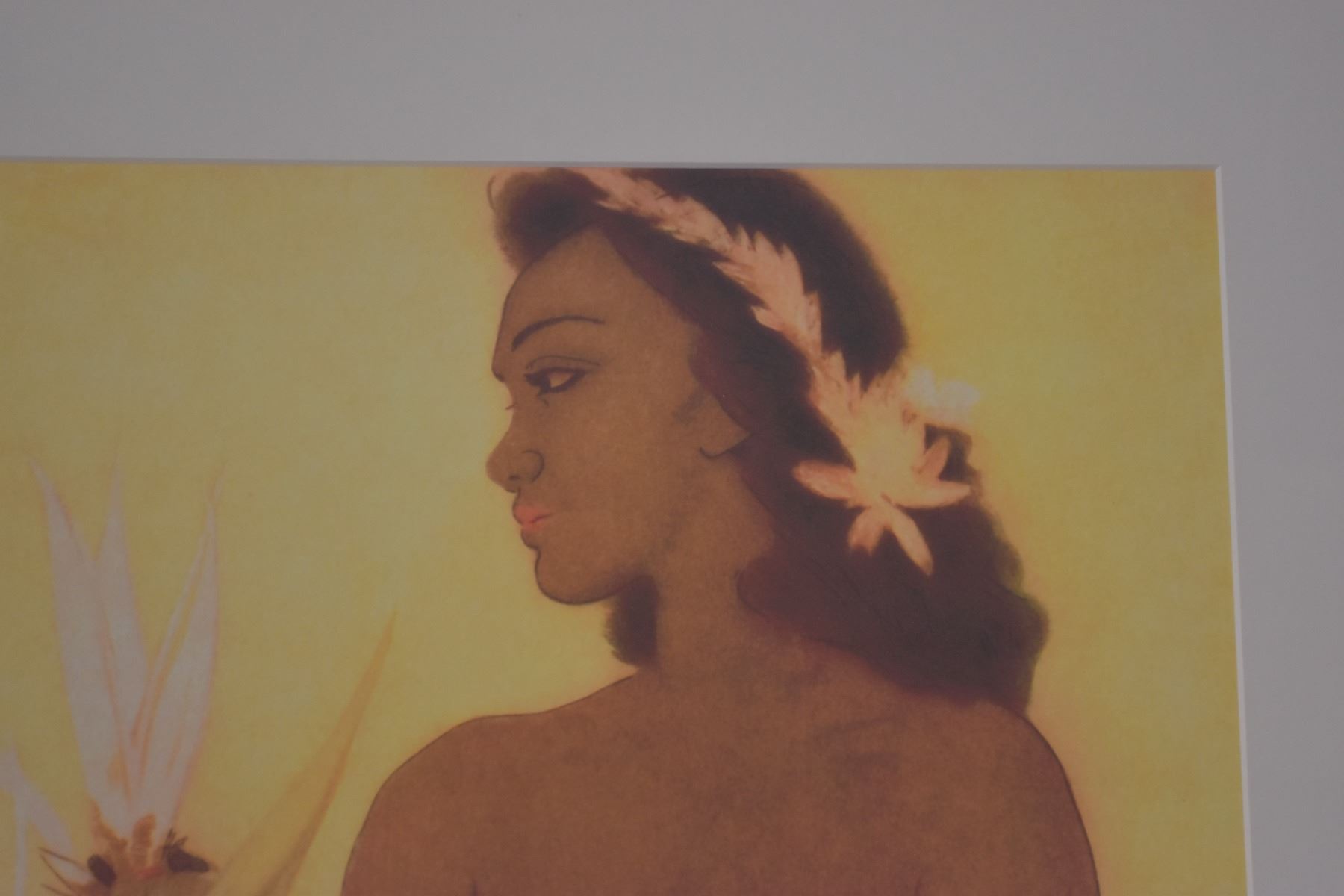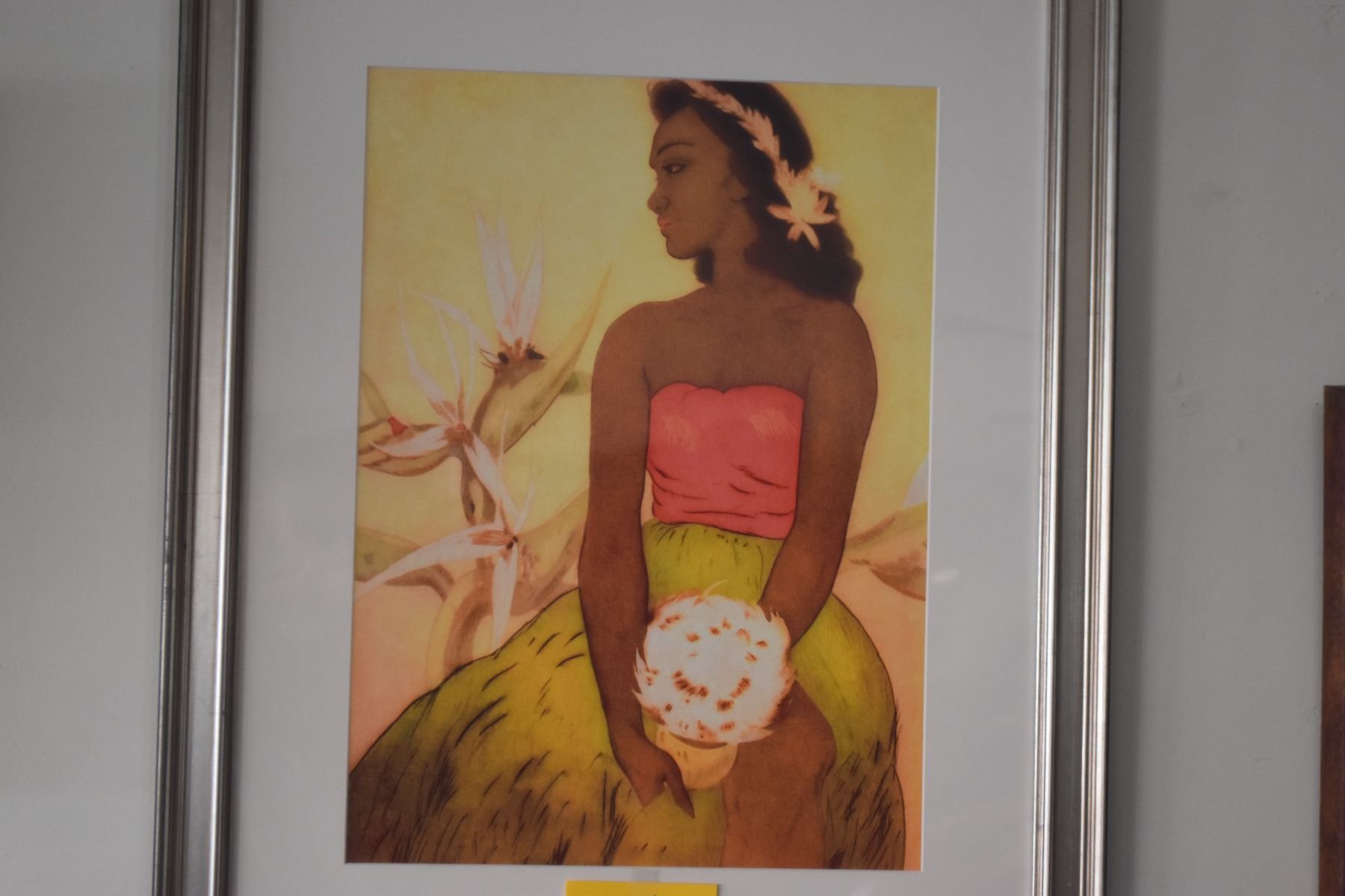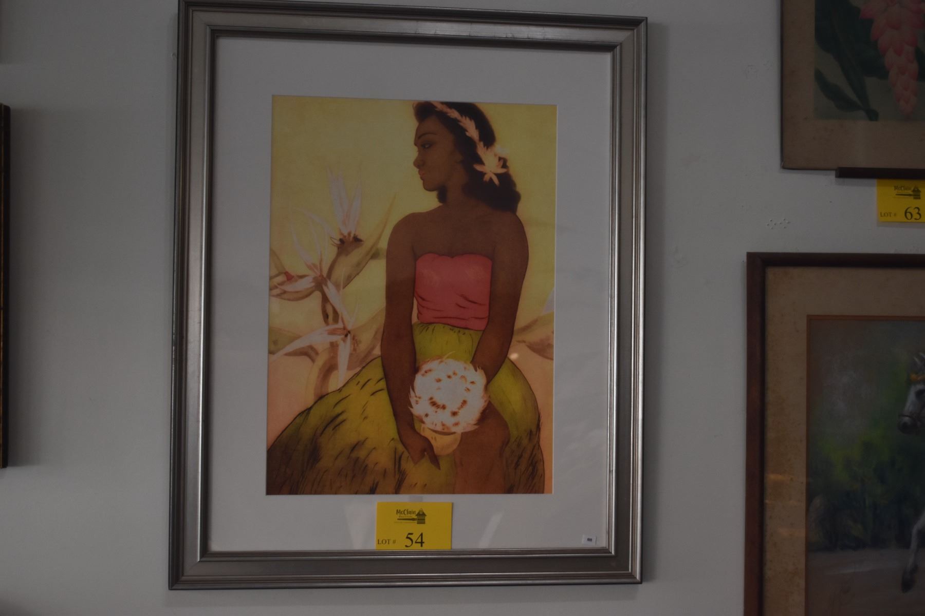 FRAMED PRINT, HULA DANCER 1954 BY JOHN KELLY OF ROYAL HAWAIIAN HOTEL DINNER MENU W/HAWAIIAN IDYLL BOOK (26 1/2" X 32 1/2") (2 PCS) (DOES NOT INCLUDE STAND)