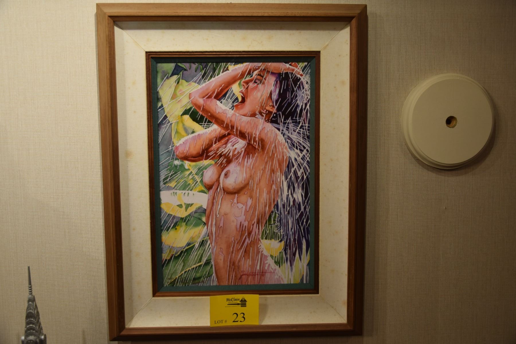 FRAMED PRINT, "NUDE FEMALE IN THE RAIN" (22" X 28")