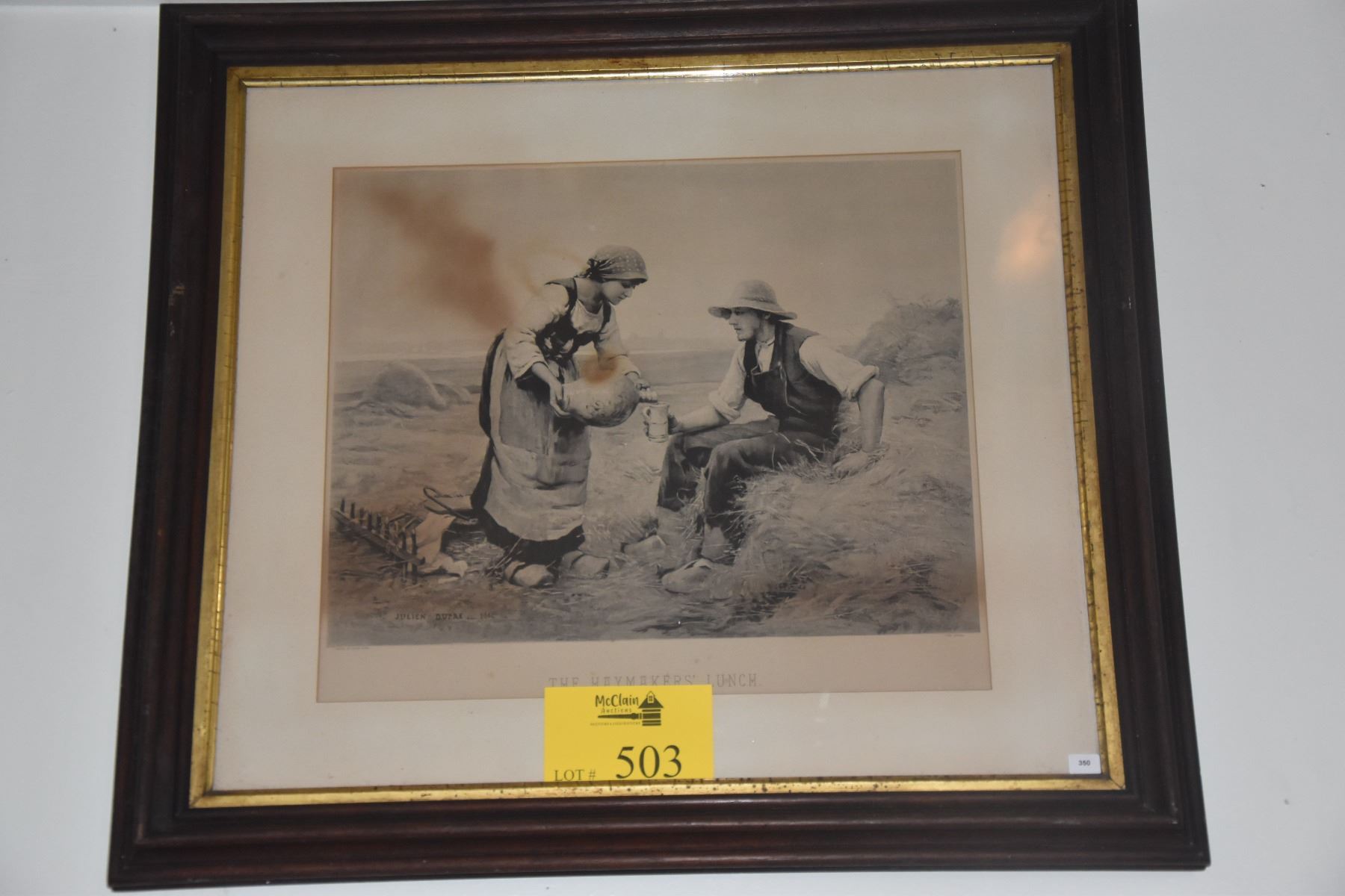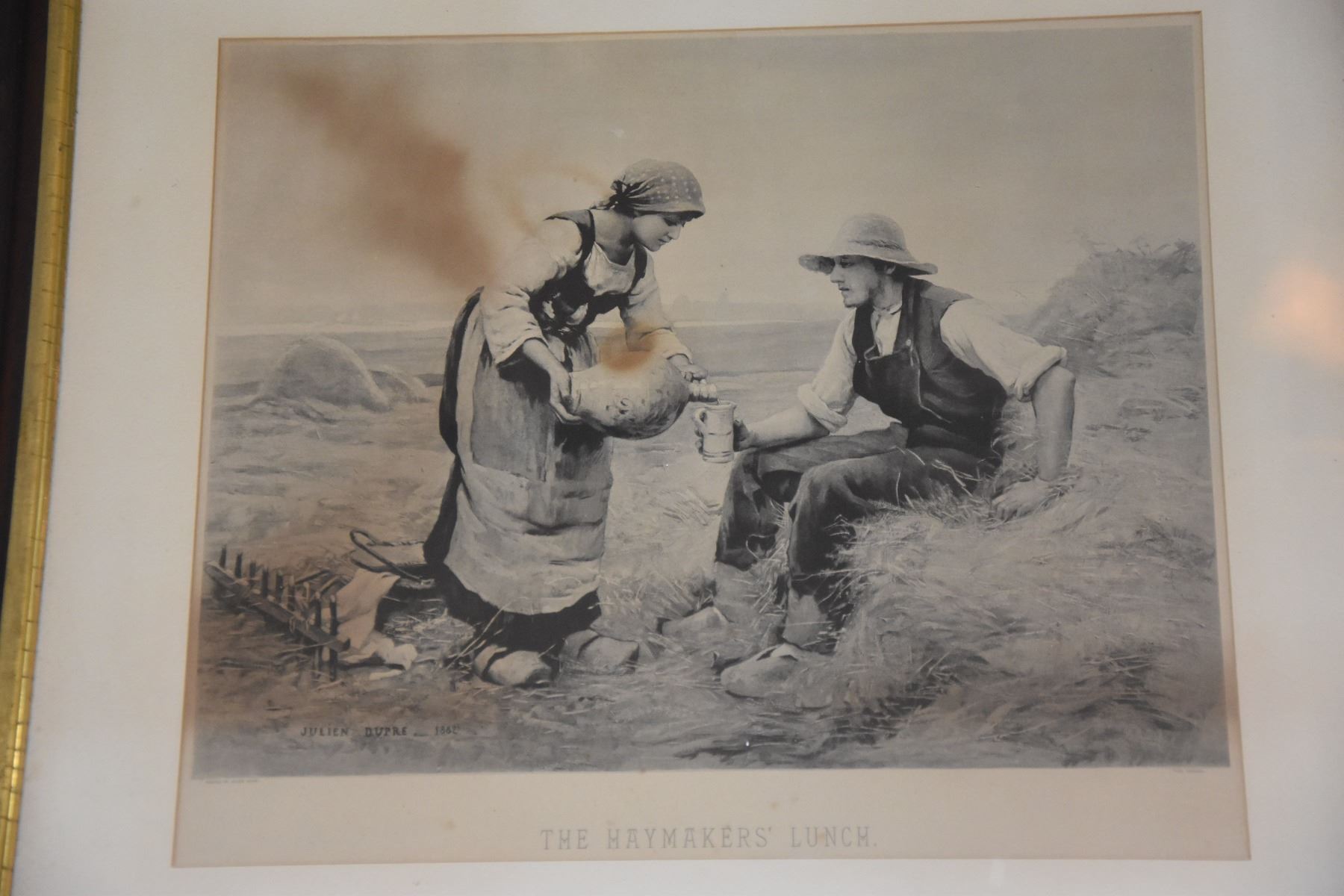 FRAMED PRINT, "THE HAYMAKERS LUNCH"; PRINTED BY JULIEN DUPRE FROM THE ORIGINAL (26 1/2" X 24")