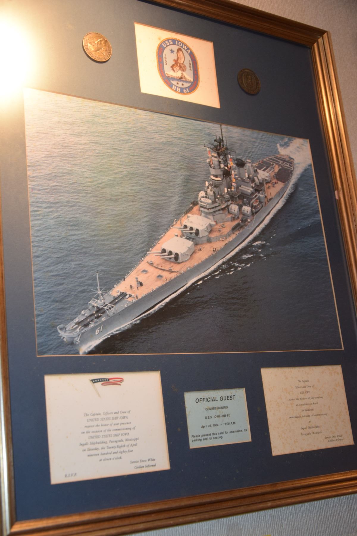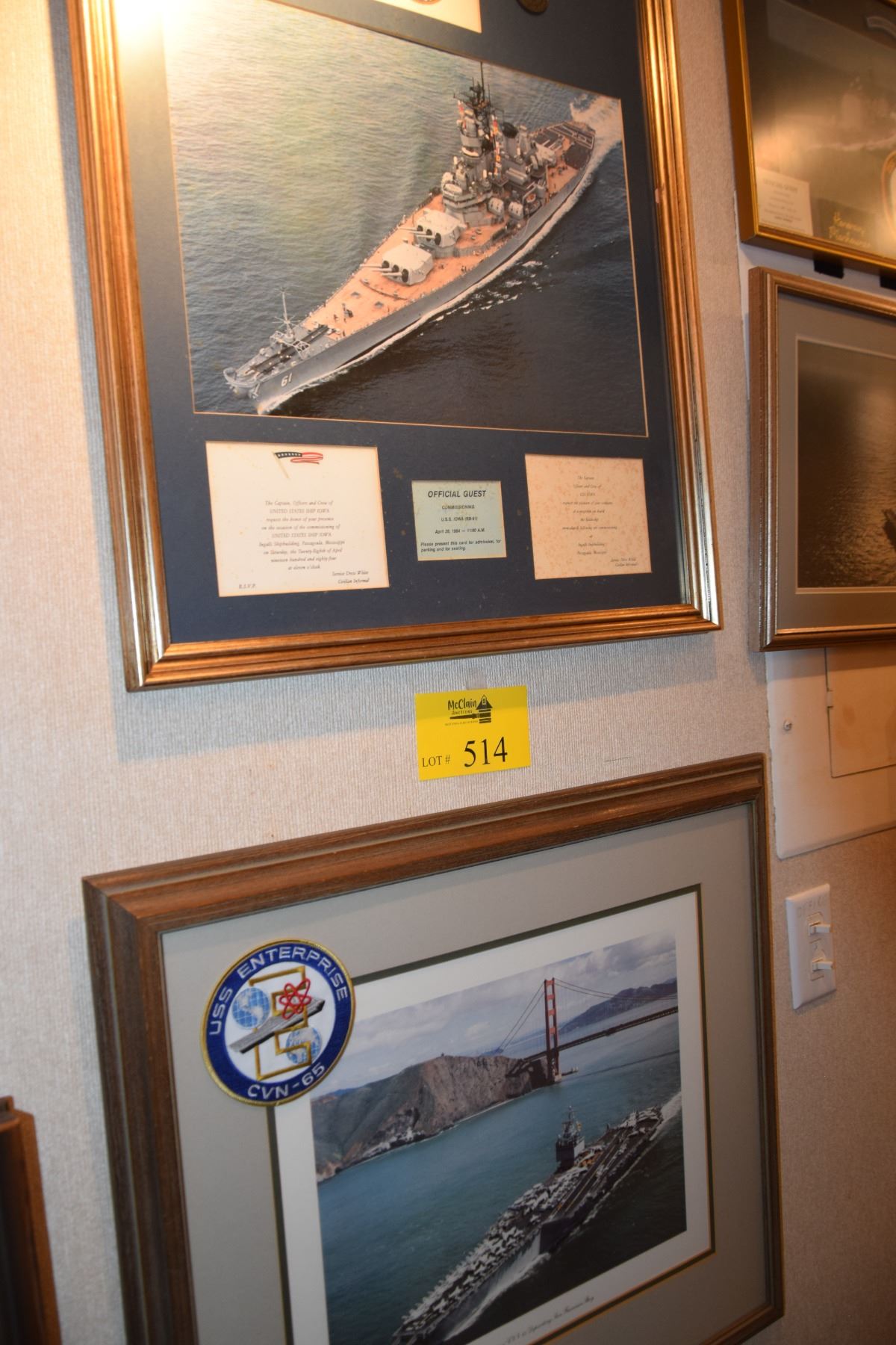 FRAMED PRINTS, "USS IOWA W/MEDALLIONS-INVITATION TO COMMISSIONING" & "USS ENTERPRISE W/MEDALLIONS" (2 PCS)