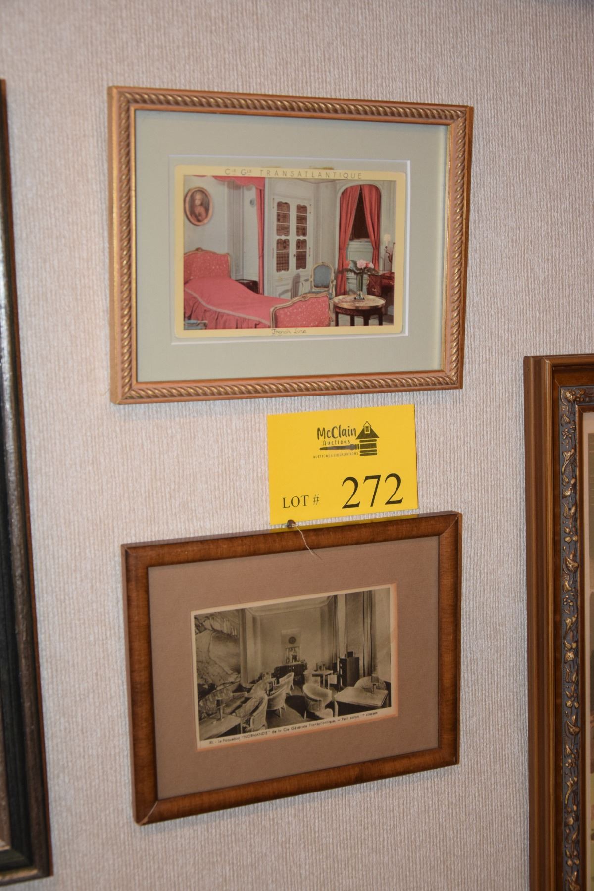 FRAMED SS NORMANDIE POSTCARD, LA CHAMBRE DE "JUMIEGES" (OPPARTEMENT DE LUXE) & FRAMED SS NORMANDIE POSTCARD, NORMANDIE 1ST CLASS PETIT SALON (7" X 9") (2 PCS)