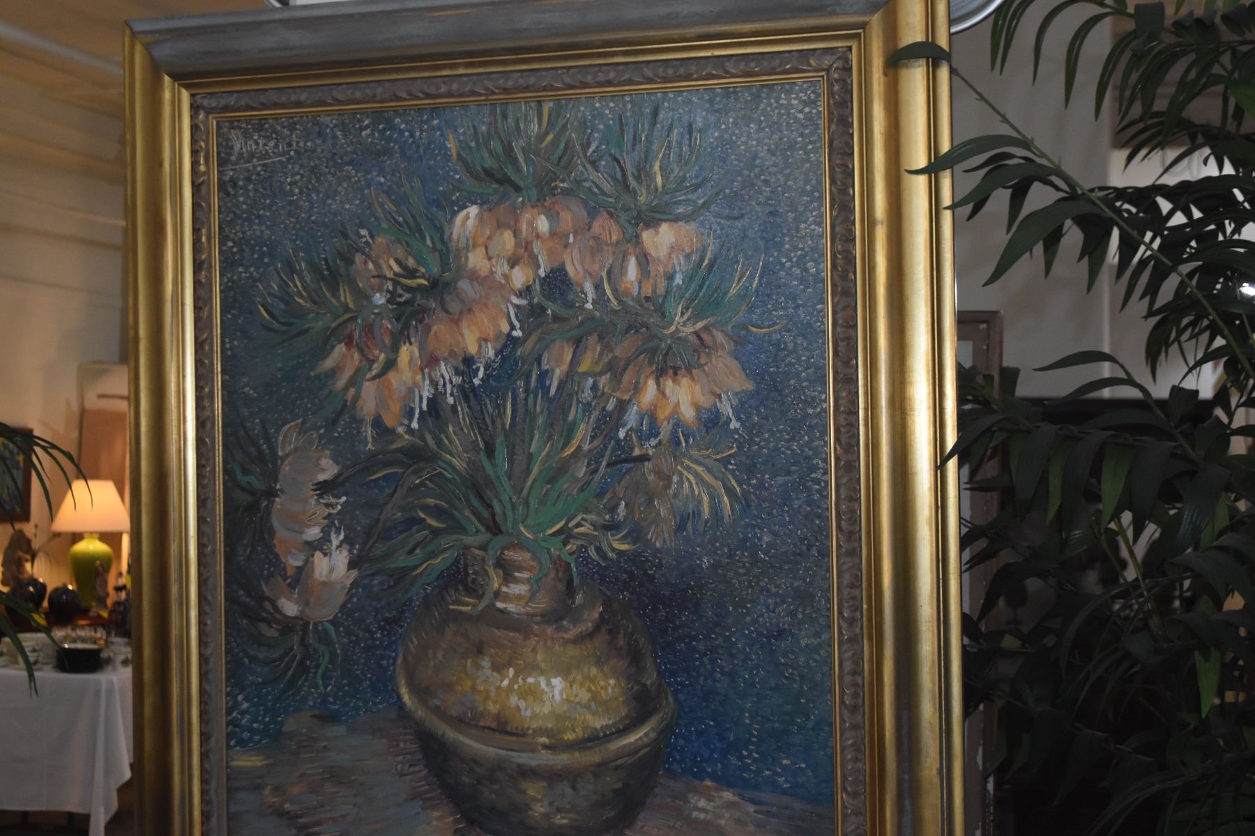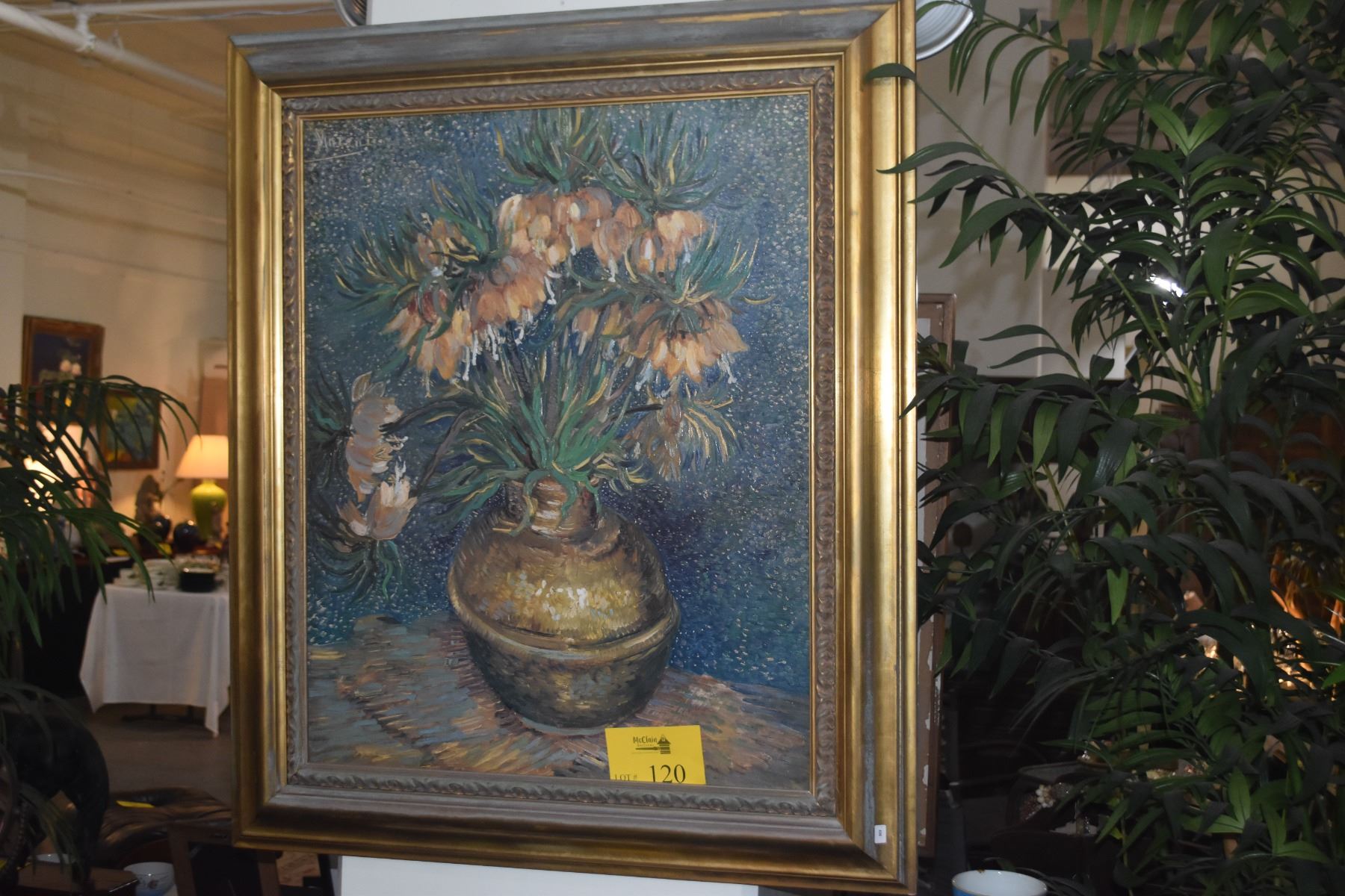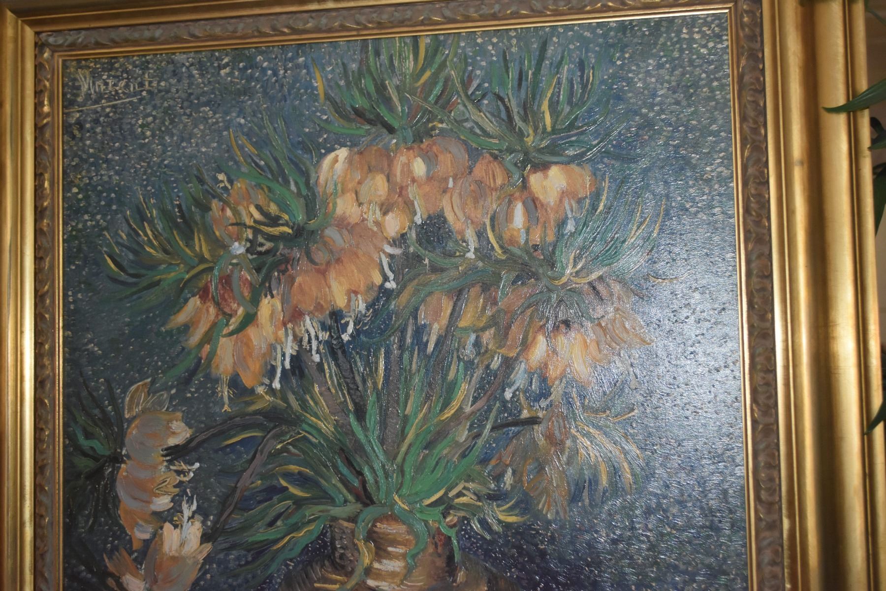 FRAMED VINCENT VAN GOGH REPRODUCTION OF "IMPERIAL FRITILLARIES IN COPPER VASE" (32" X 38")