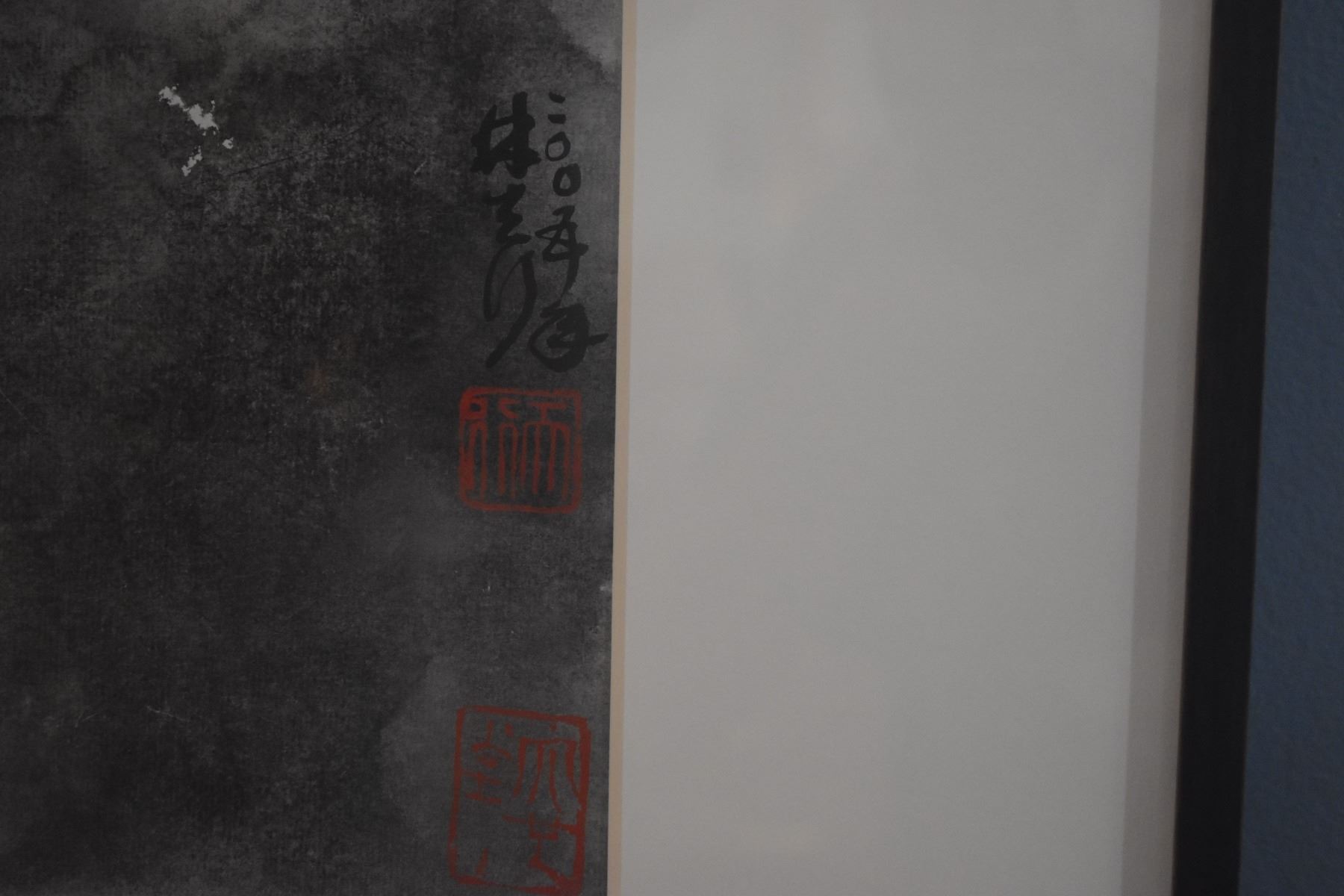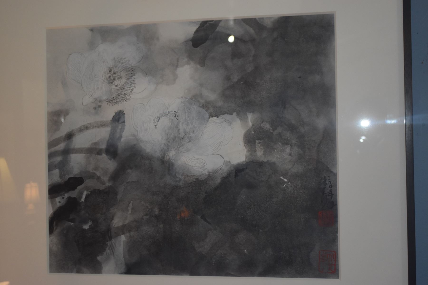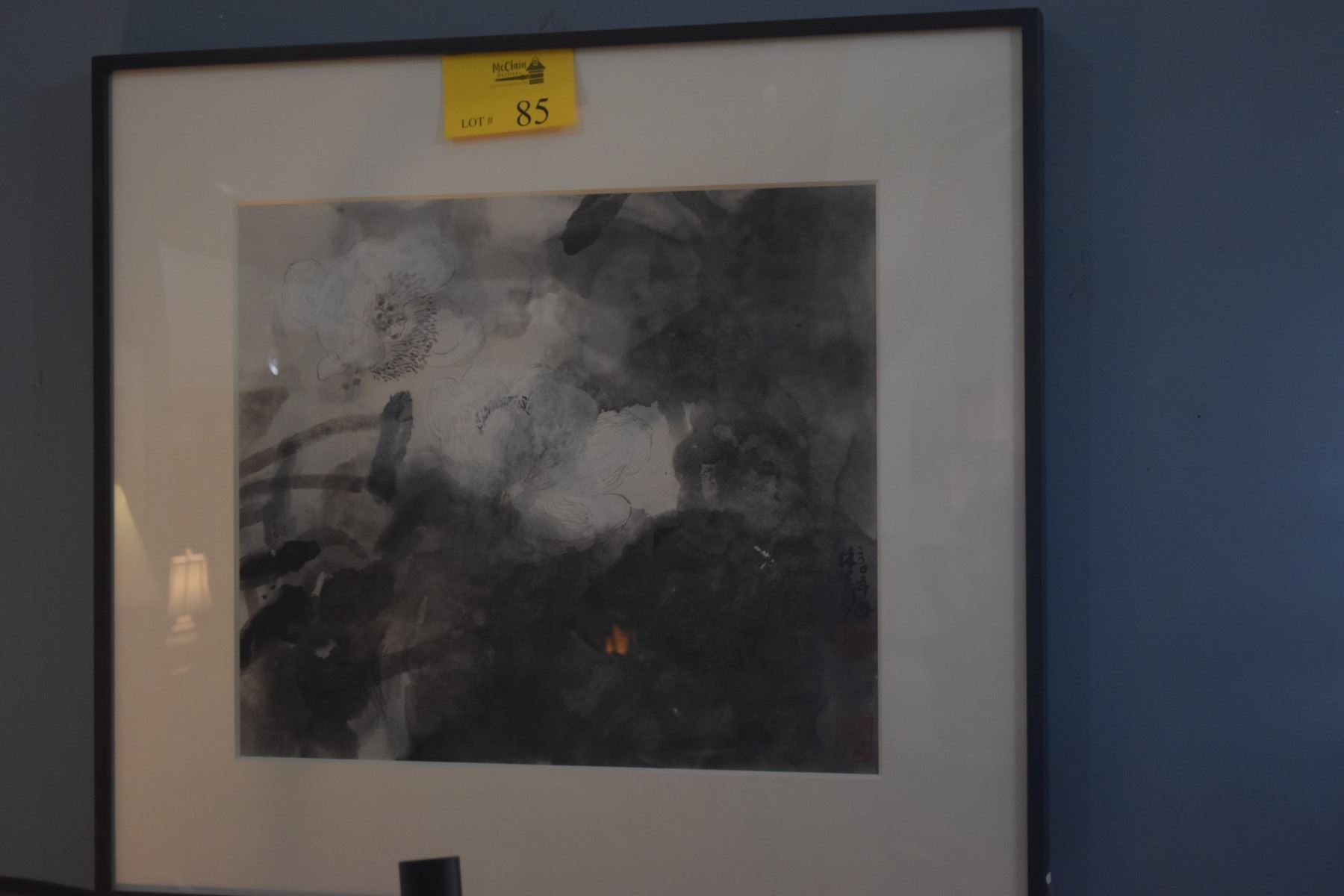 FRAMED WATERCOLOR ABSTRACT, LOTUS IMPRESSION; CHOP SIGNED (30 1/4" X 27 1/4")