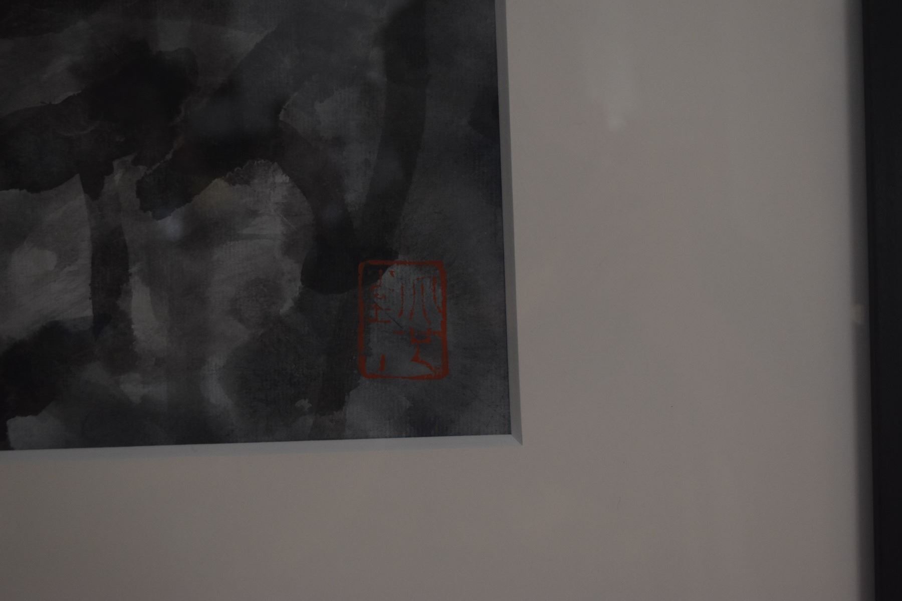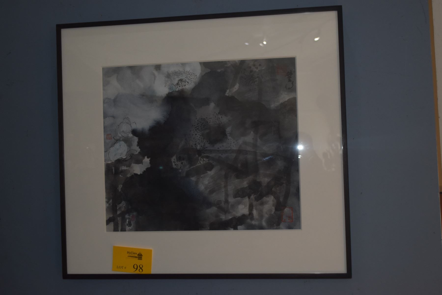 FRAMED WATERCOLOR ABSTRACT, LOTUS IMPRESSION; CHOP SIGNED (30 1/4" X 27 1/4)