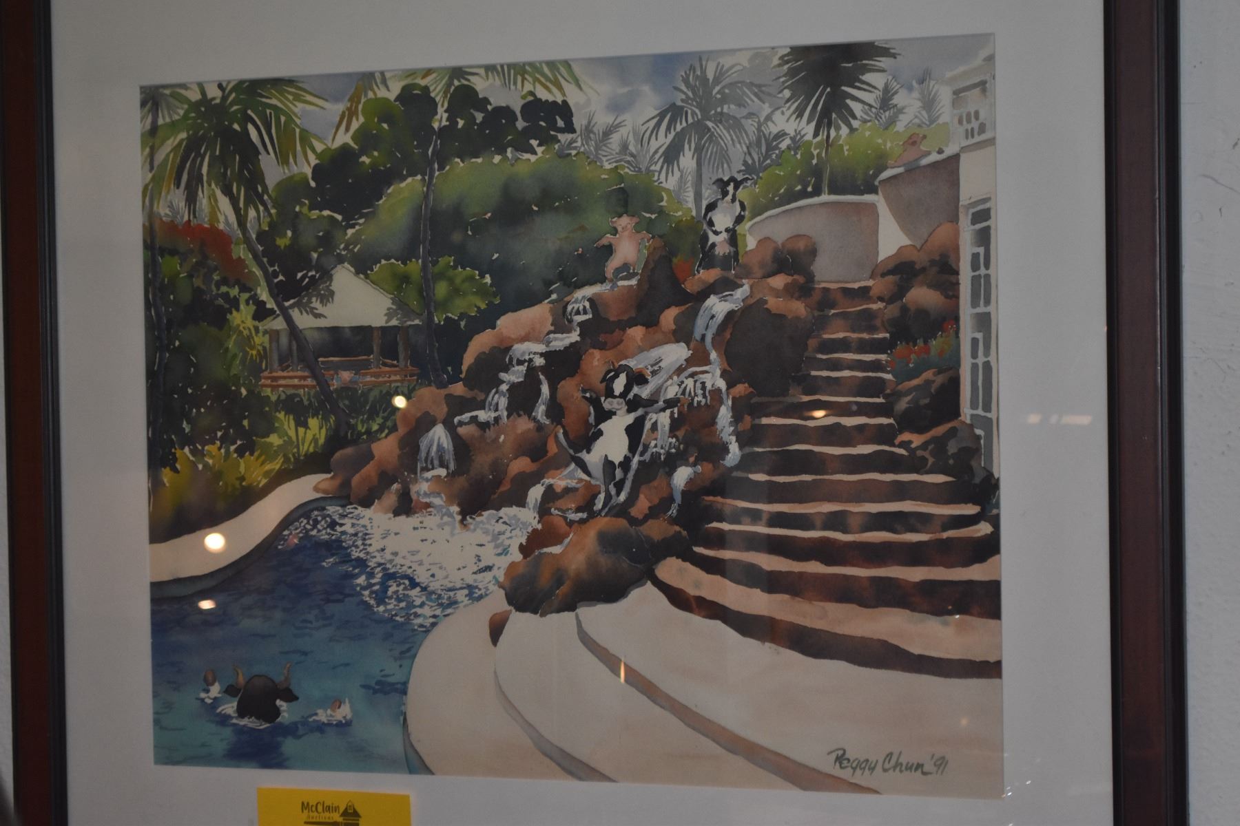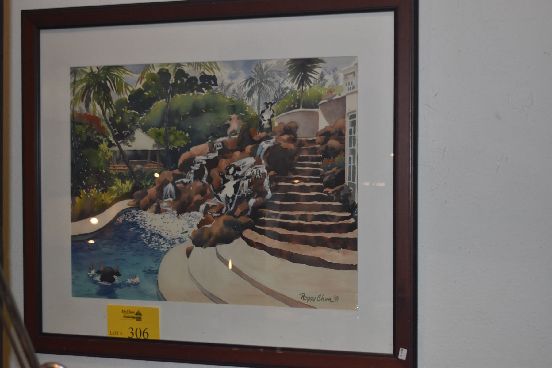 FRAMED WATERCOLOR PAINTING, "POOL PARTY"; SIGNED PEGGY CHUN '91 (30 3/4" X 27")