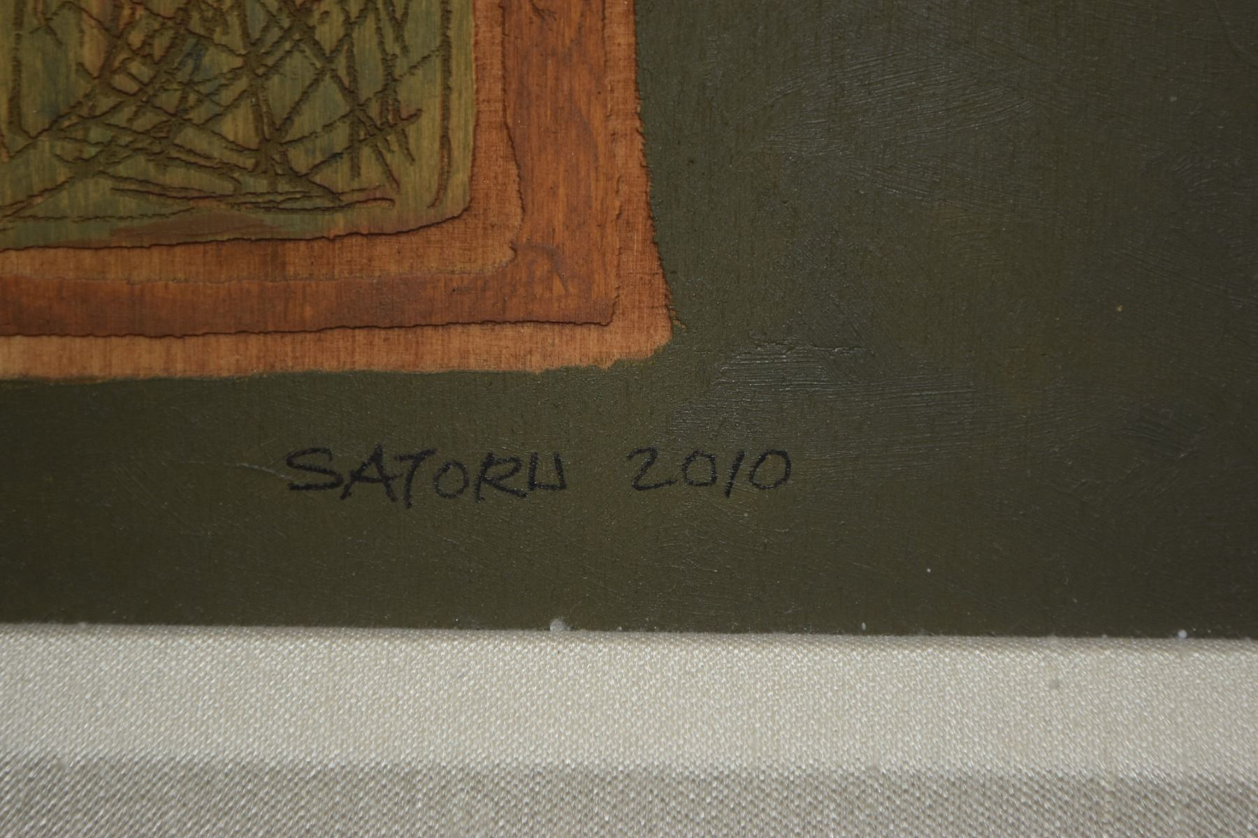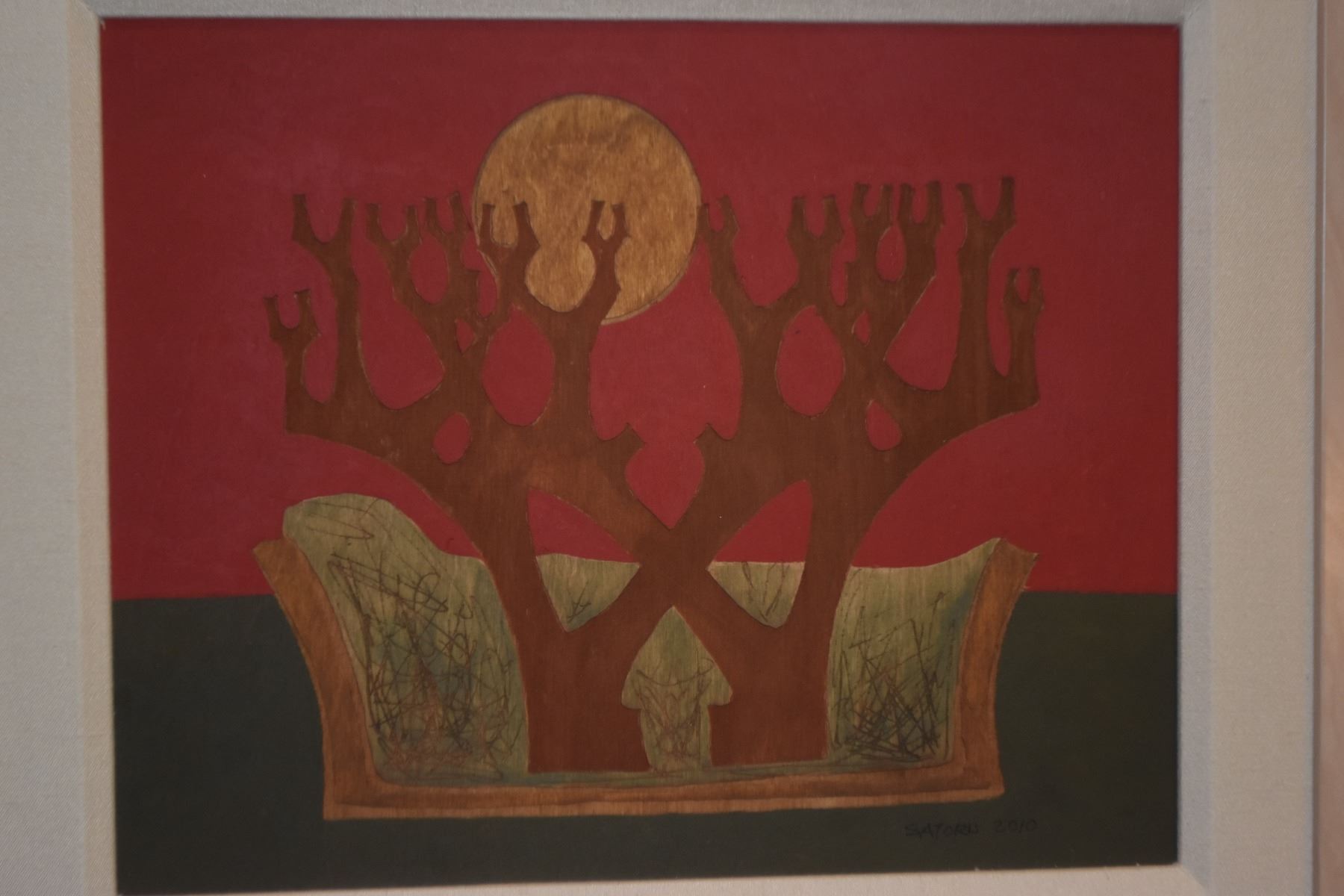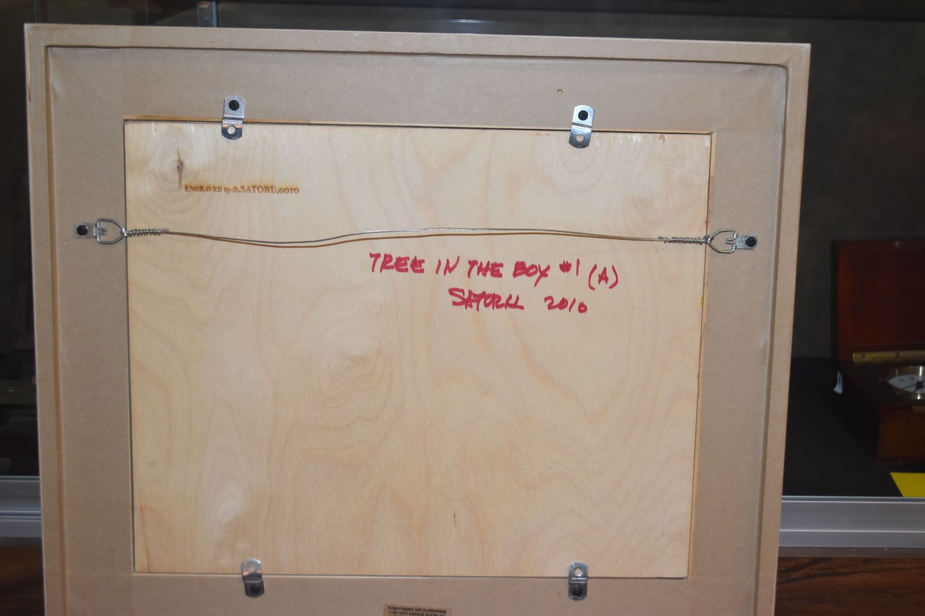 FRAMED WOOD CUT "TREE IN THE BOX #1"; SIGNED SATORU 2010 (19 1/4" X 16 1/2")