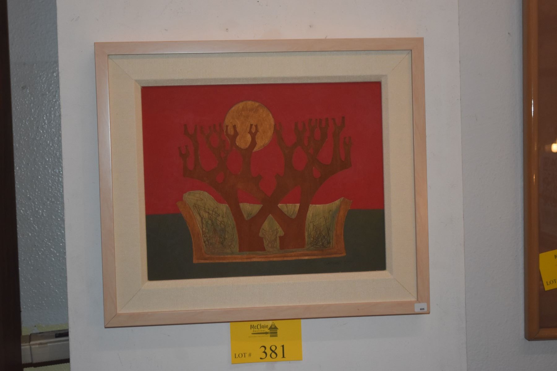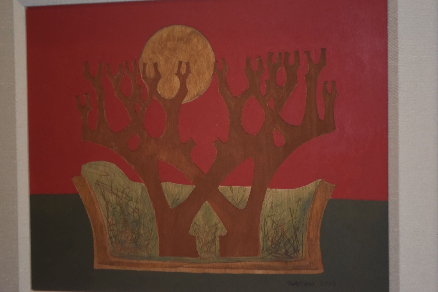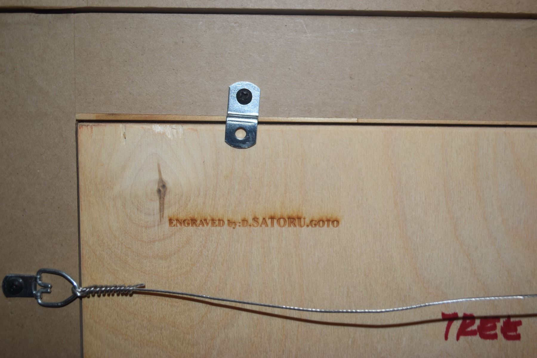 FRAMED WOOD CUT "TREE IN THE BOX #1"; SIGNED SATORU 2010 (19 1/4" X 16 1/2")