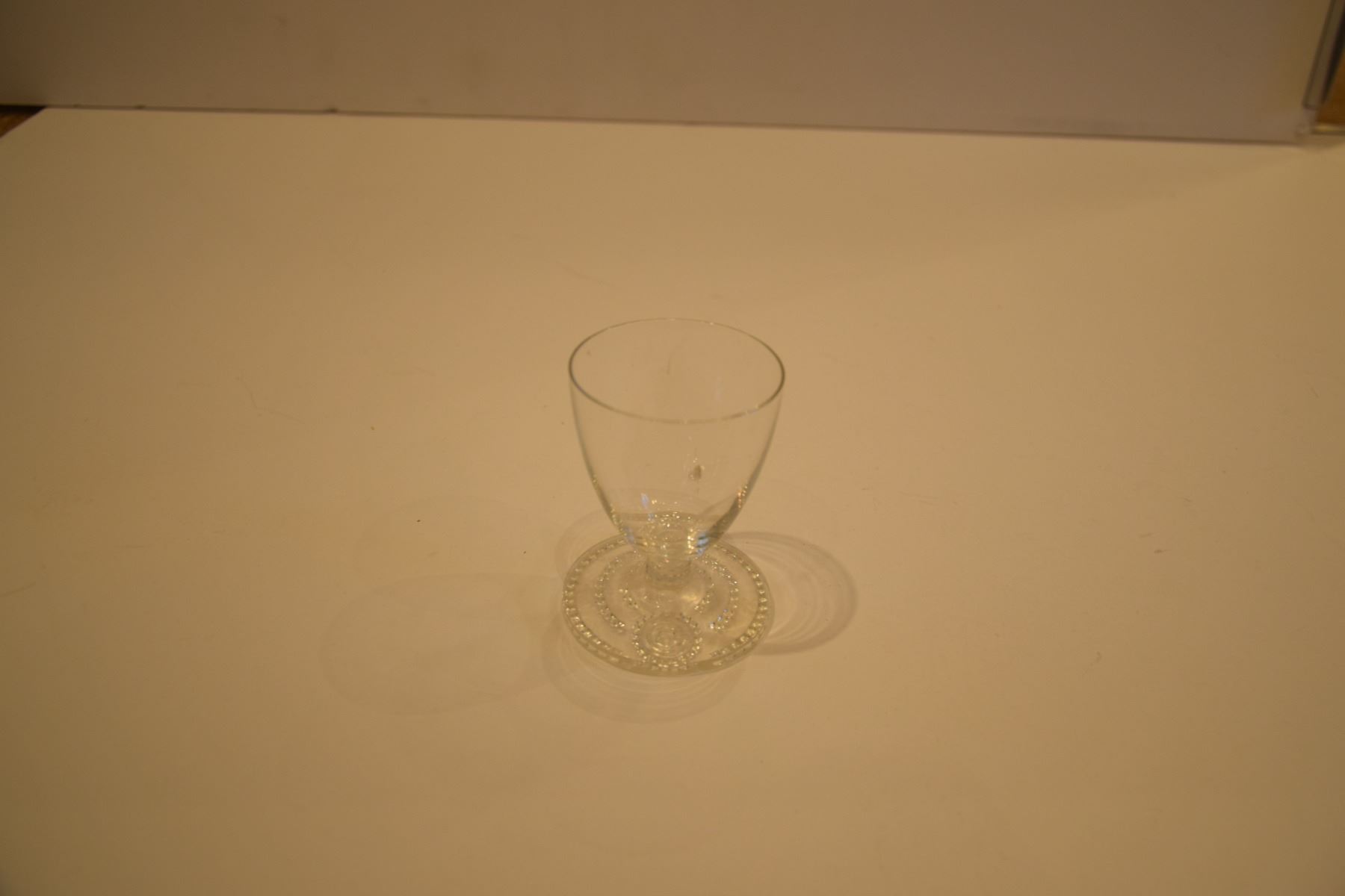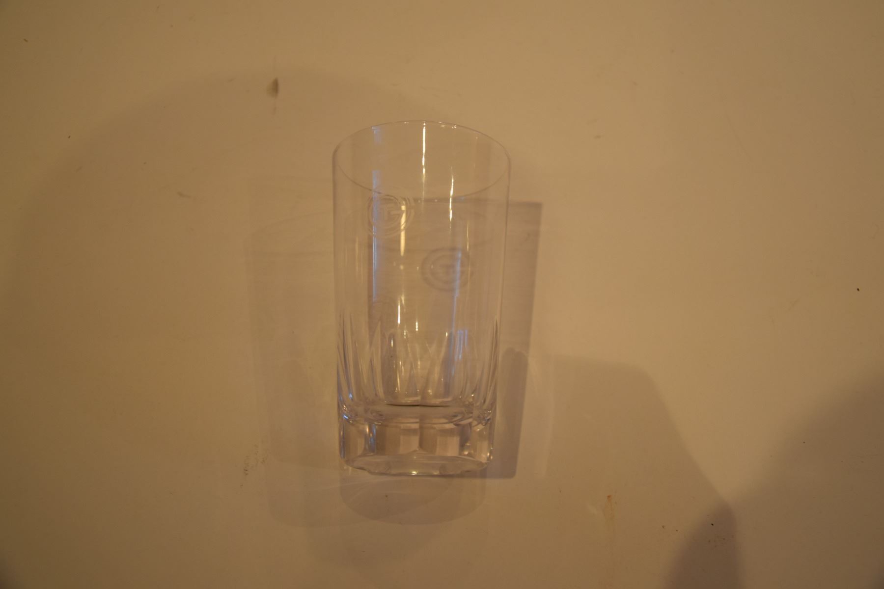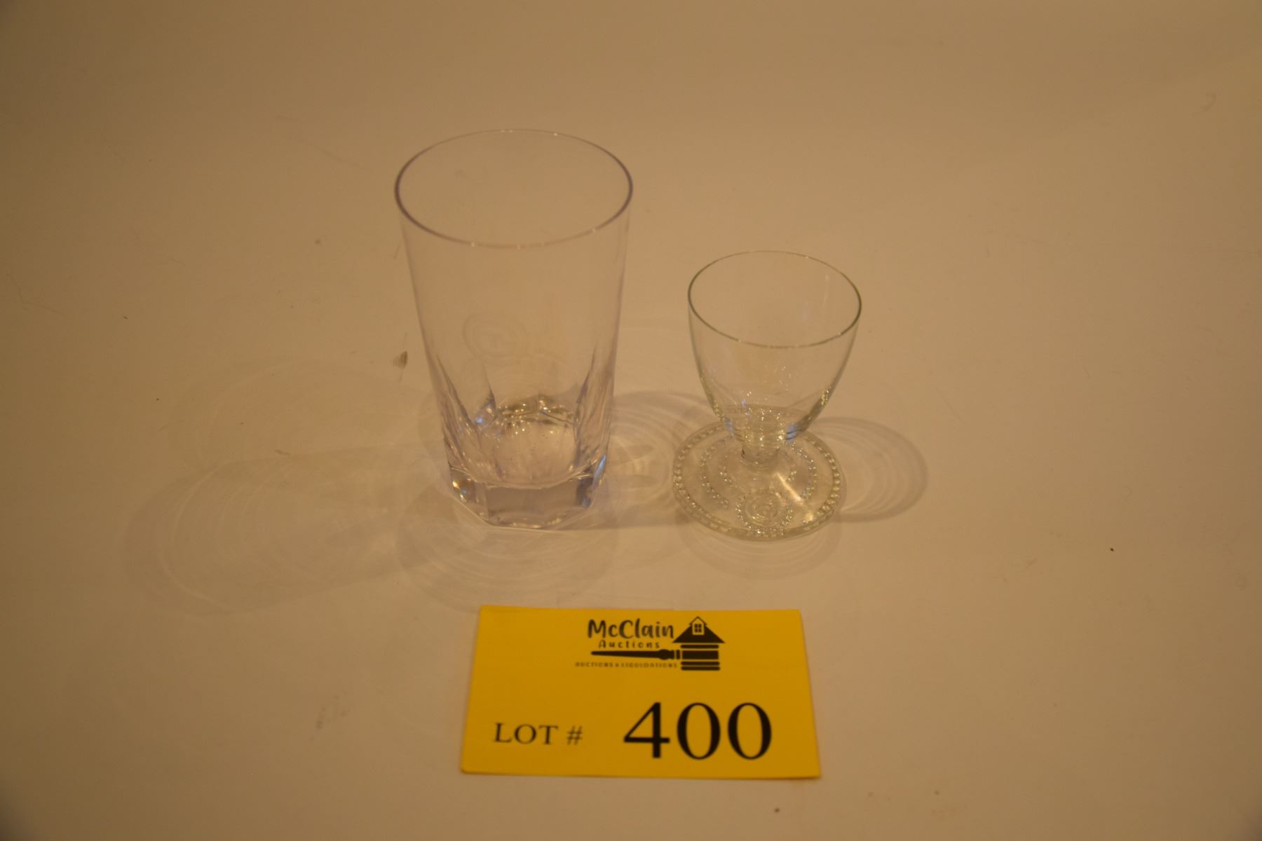 FRANCE: HIGH CUT CRYSTAL HIGHBALL GLASS FROM HER 1ST CLASS BAR W/HOUSE LOGO ON THE SIDE (4 3/4" HIGH) & NORMANDIE: HIGH CORDIAL GLASS BY LALIQUE CREATED FOR THE DELUXE SUITES (3 1/4" HIGH) (2 PCS)