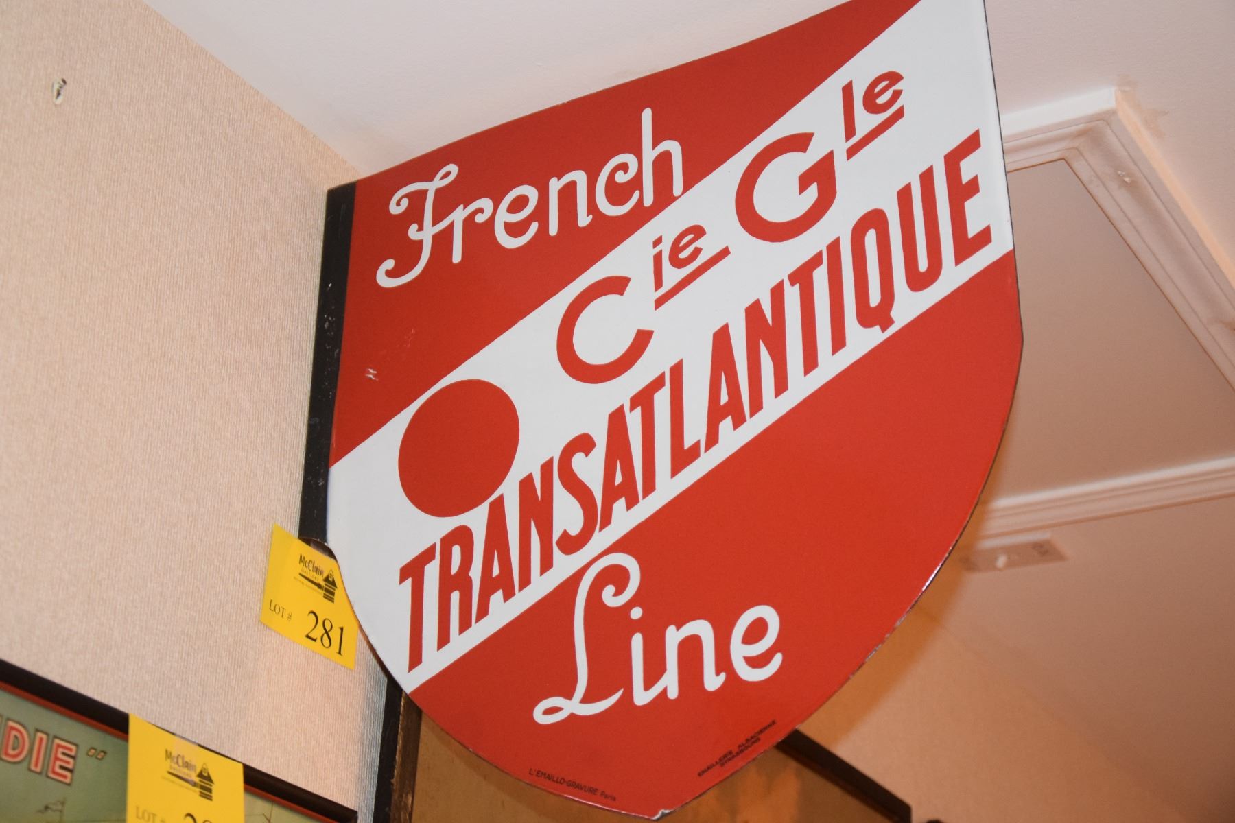 FRENCH LINE: ENAMELED ON CAST IRON SIGN IN THE SHAPE OF THE FRENCH LINE SHIELD (SIGN WAS CREATED TO HANG OUTSIDE TRAVEL OR COMPANY OFFICES, 2 SIDED W/A SELF-CONTAINED BRACKET FOR ATTACHING TO MASONRY) (19 1/4" X 19 1/2")