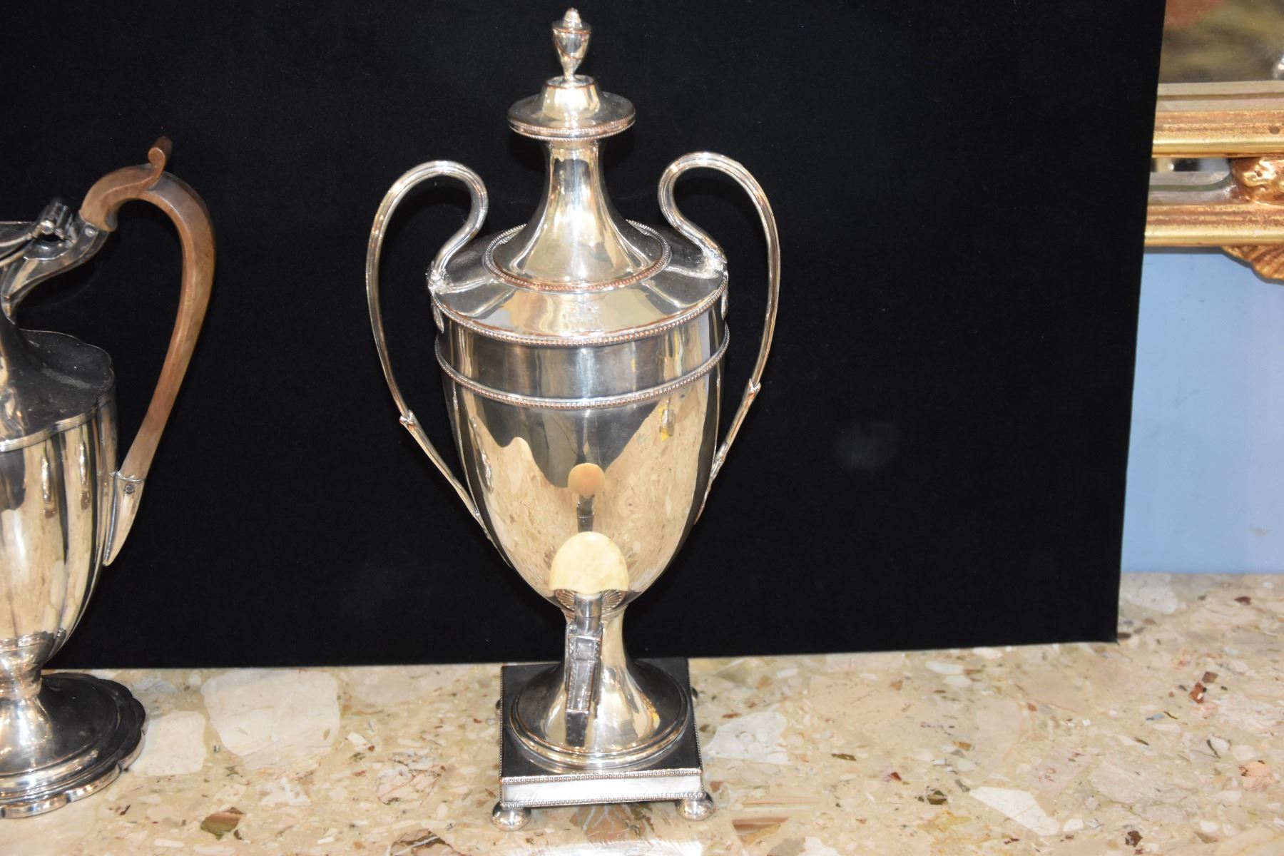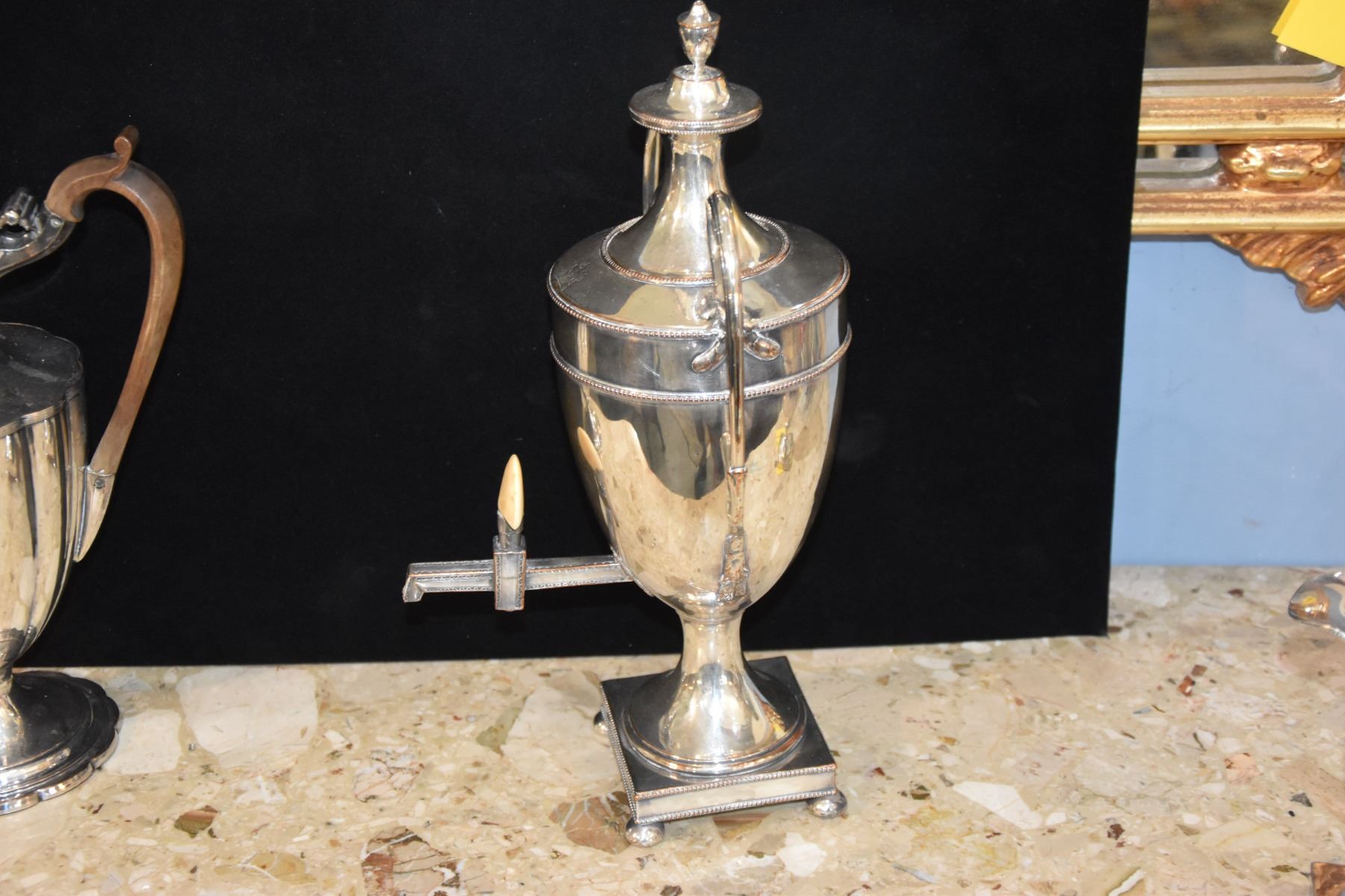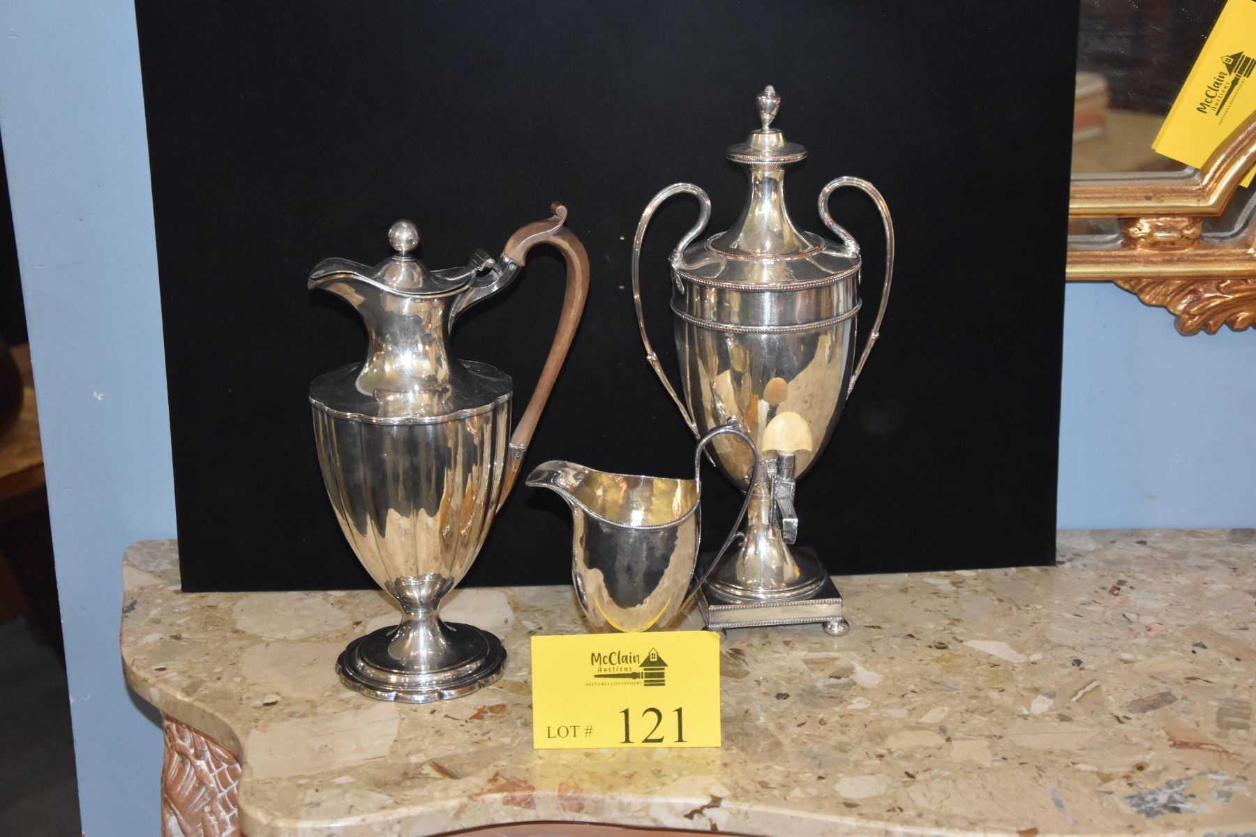 GEORGE III SILVER FUSED ELECTROPLATE HOT WATER URN, HOT WATER JUG & CREAMER, SILVER ON COPPER (APPRISED VALUE: $600) (3 PCS)