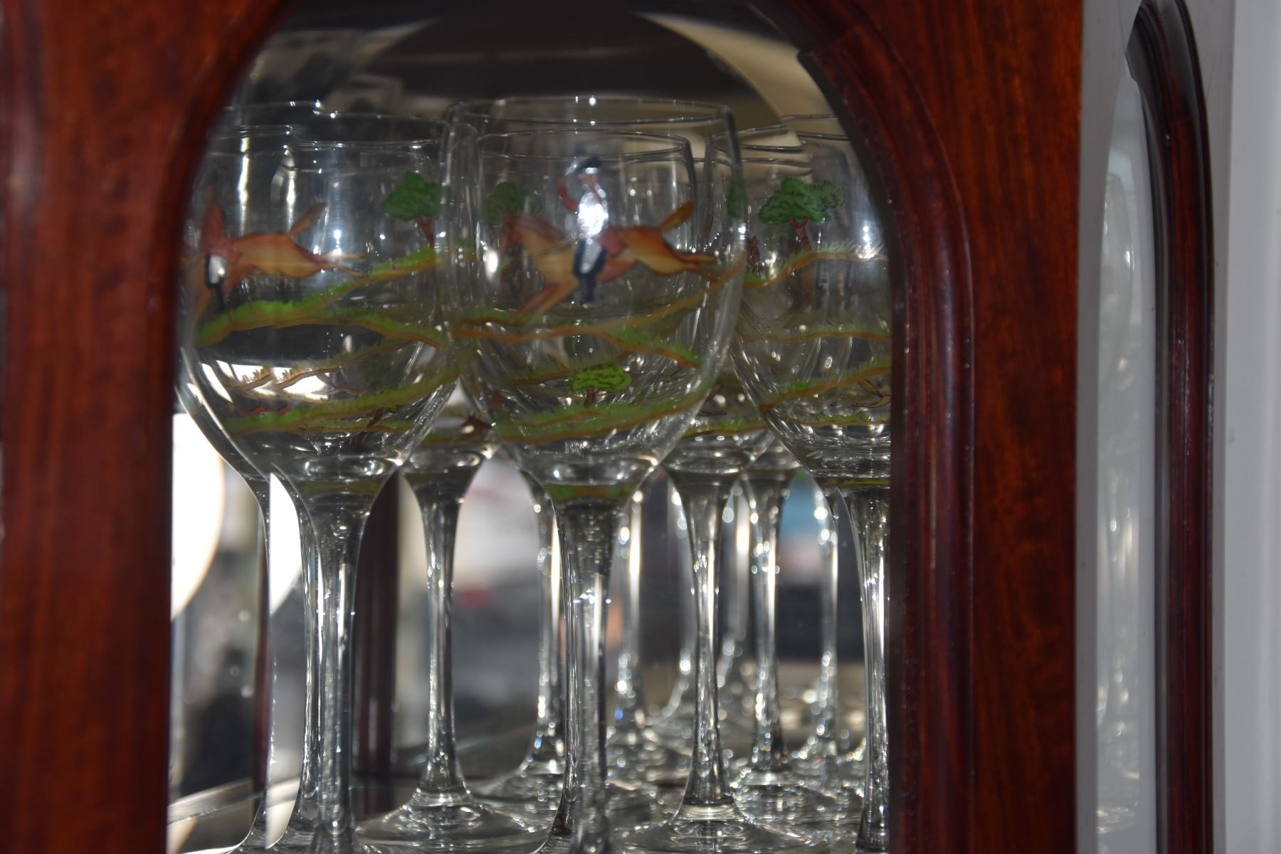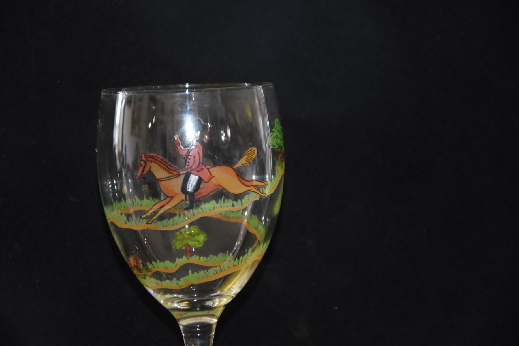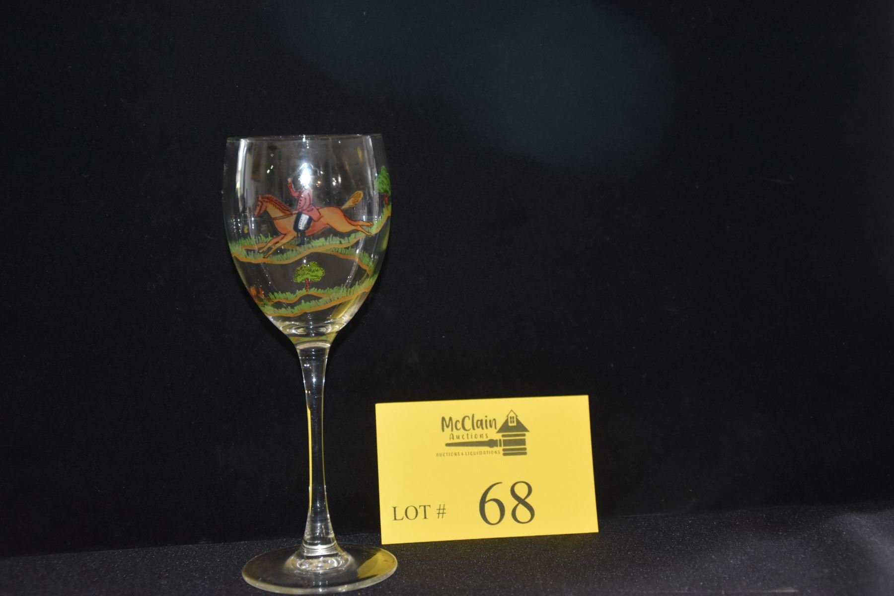 GLASS STEMMED WINE GOBBETS W/HUNTING SCENE PATTERN, MARKED LUMINARC FRANCE (7 3/4") (8 PCS)