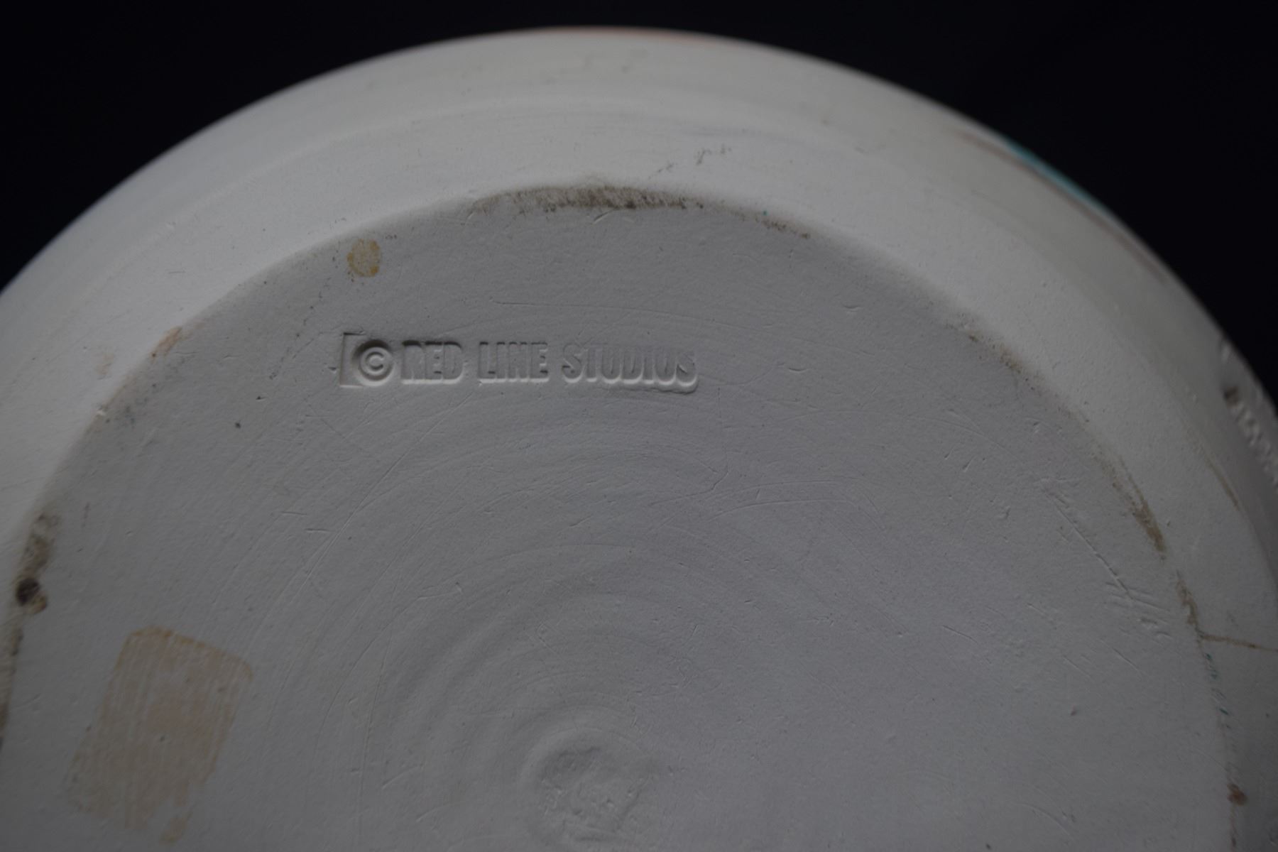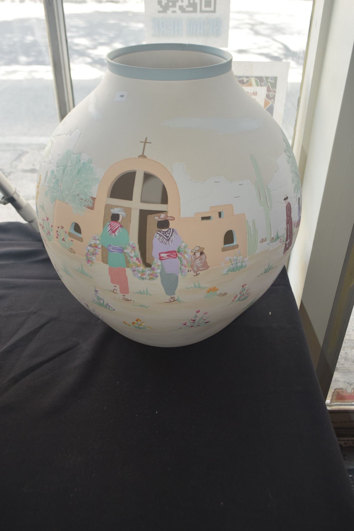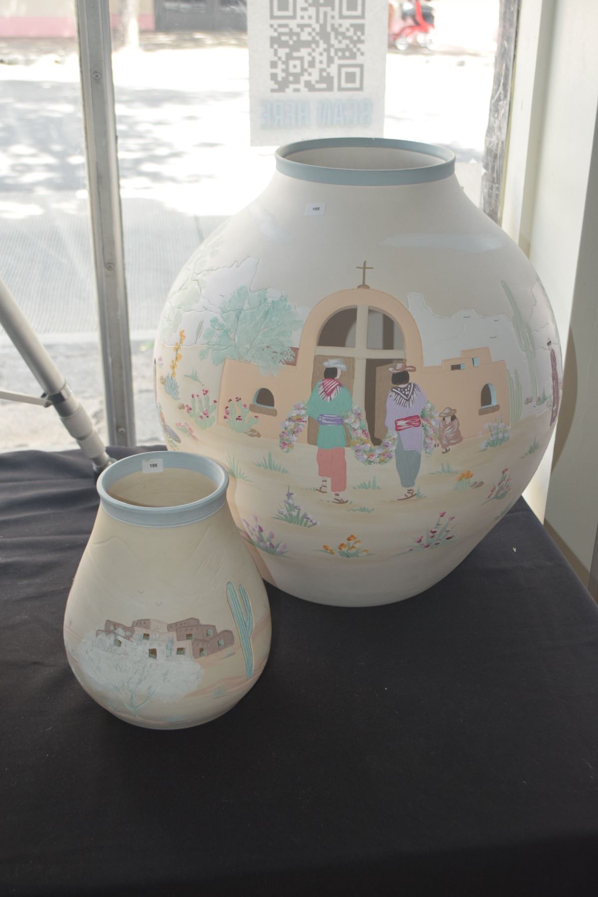 HAND PAINTED CERAMIC OVAL JAR W/HAND PAINTED SCENE OF A SOUTHWEST VILLAGE BY RED LINE STUDIOS (9" & 18 1/2") (2 PCS)