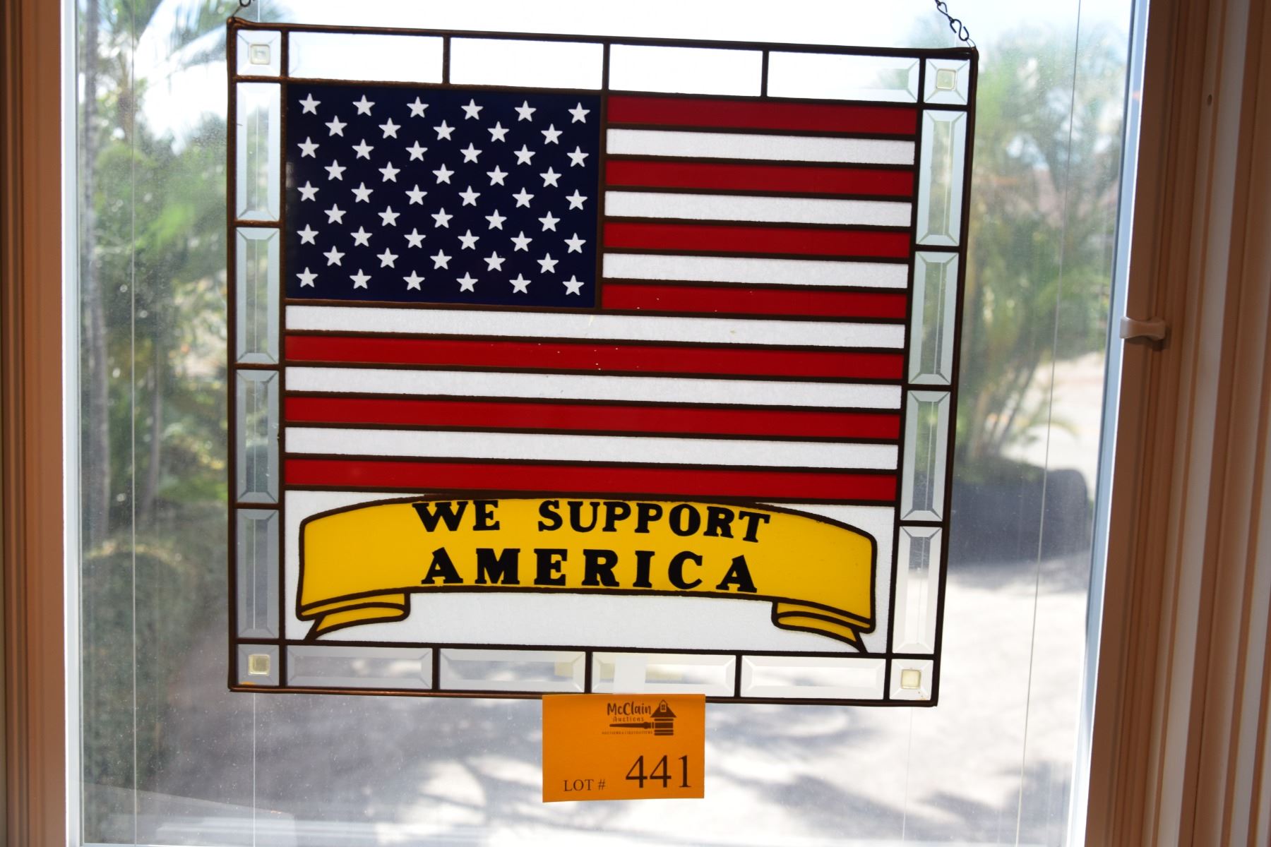 HANGING LEADED GLASS, "FLAG-WE SUPPORT AMERICA" (17 1/2" X 16")