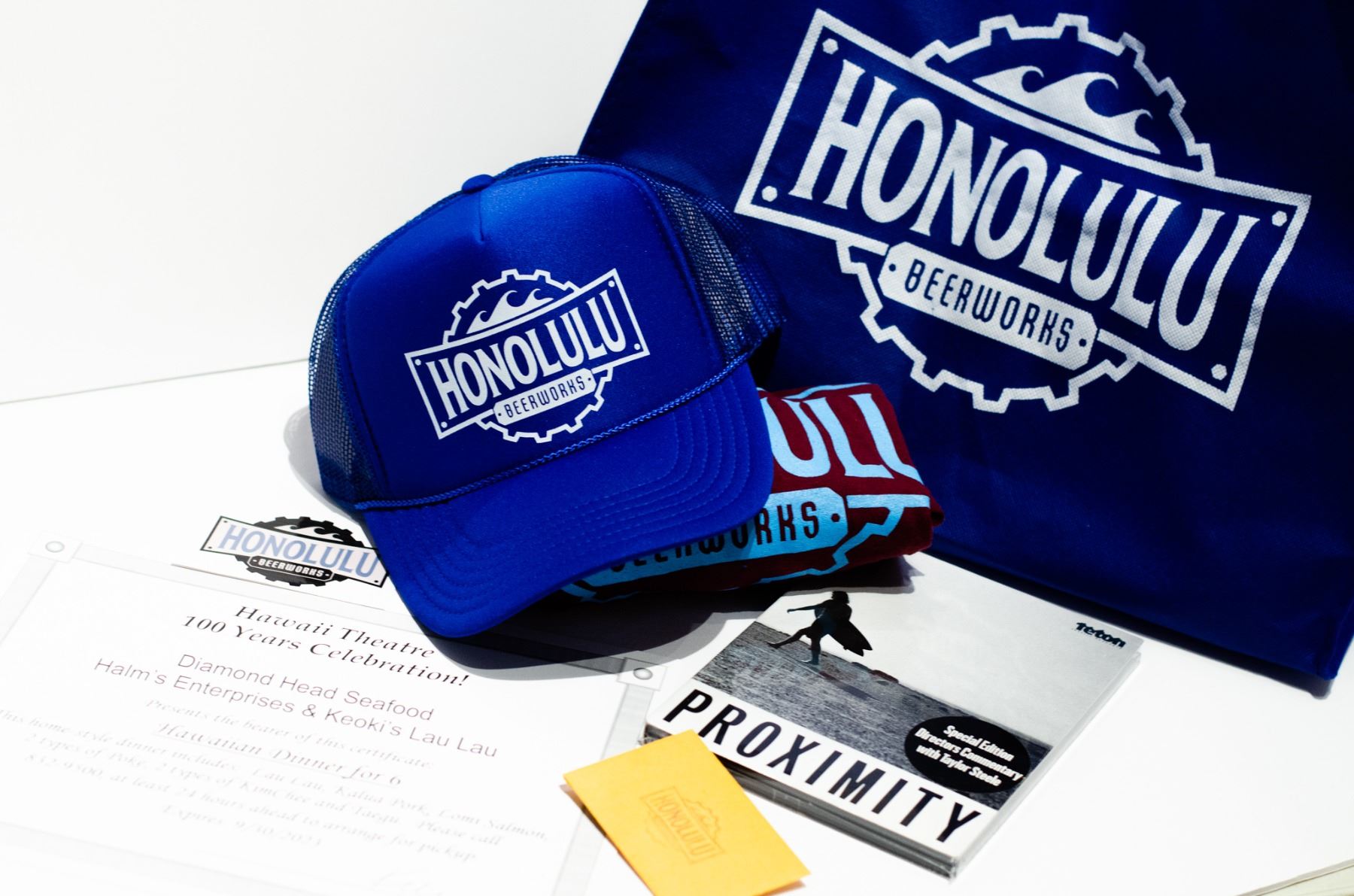 Honolulu Beerworks Swag Bag and Gift Card - Shopping tote, sticker, sunglasses, koozie, stadium cup, mints, keychain bottle opener, trucker hat, Honolulu Beer Works men t-shirt, and $25.00 gift card