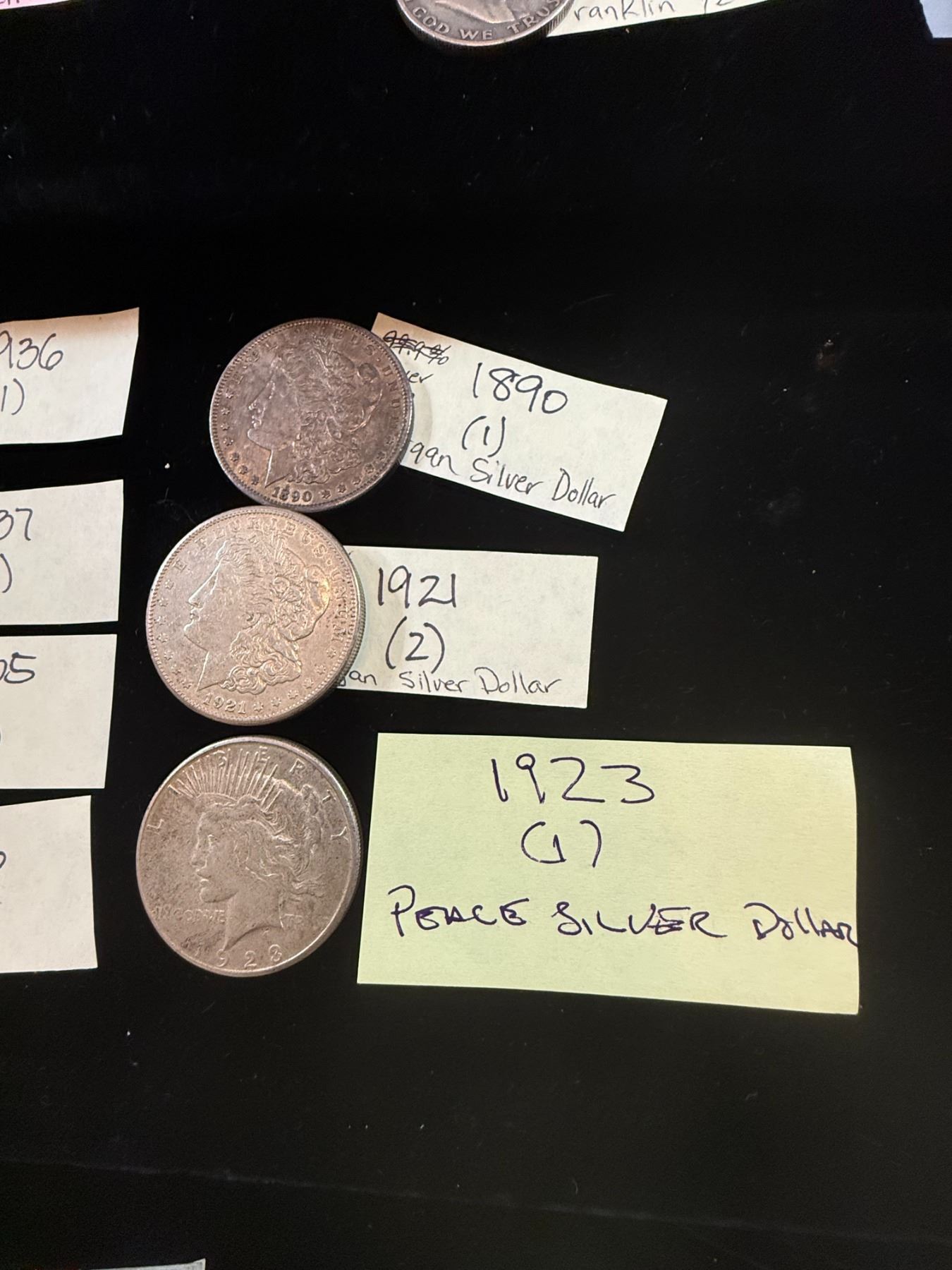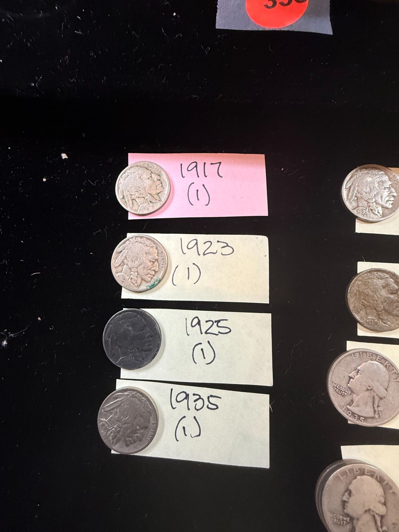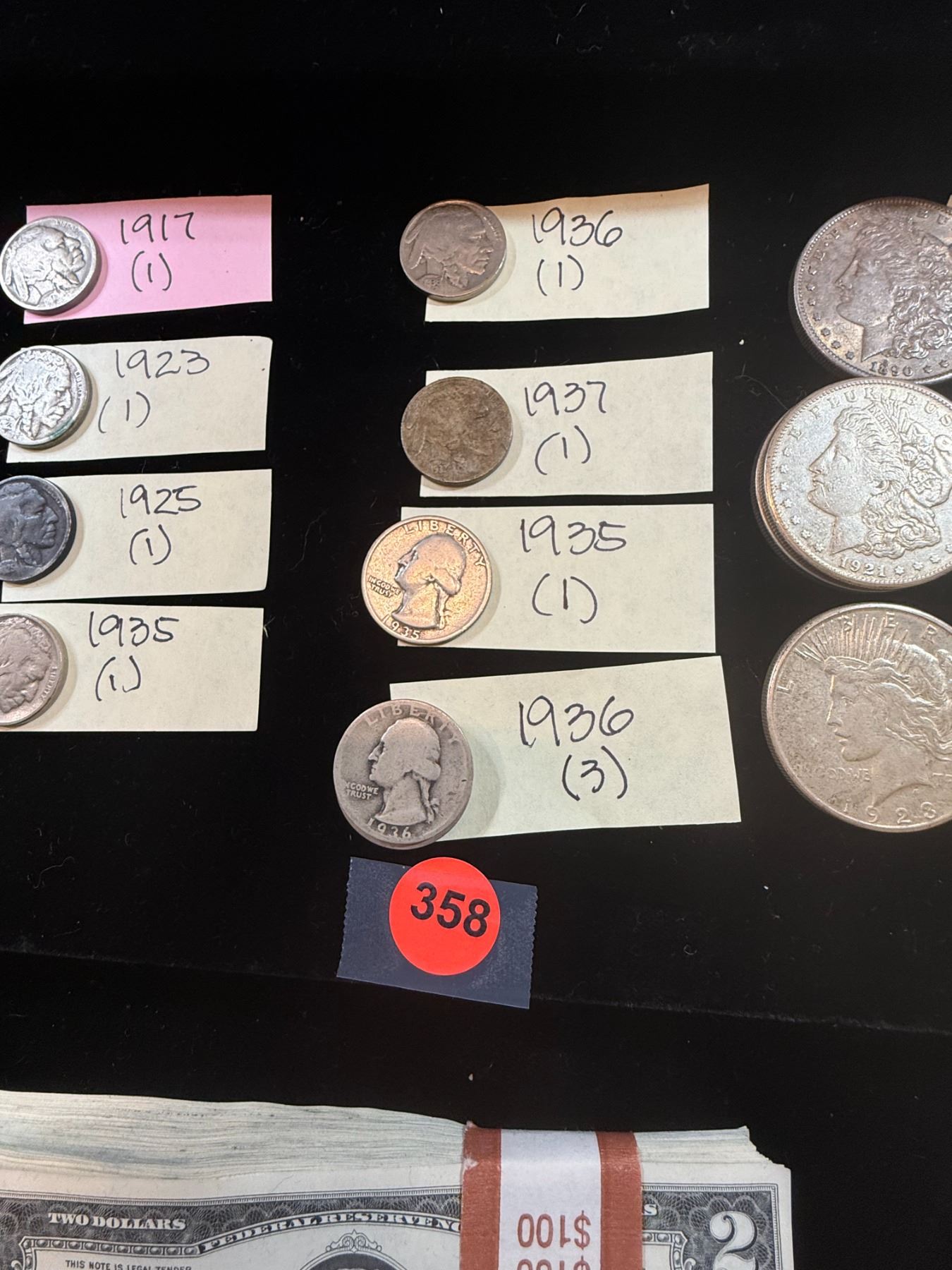 INDIAN HEAD NICKLES - 1917, 1923, 1925, 1935, 1936, 1937; SILVER QUARTERS - 1935 (1) 1936 (3); MORGA