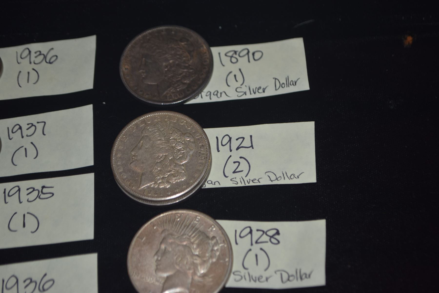 INDIAN HEAD NICKLES - 1917, 1923, 1925, 1935, 1936, 1937; SILVER QUARTERS - 1935 (1) 1936 (3); MORGAN SILVER DOLLARS - 1890 (1), 1921 (2); LIBERTY SILVER DOLLAR - 1923 (1) (14 PCS)