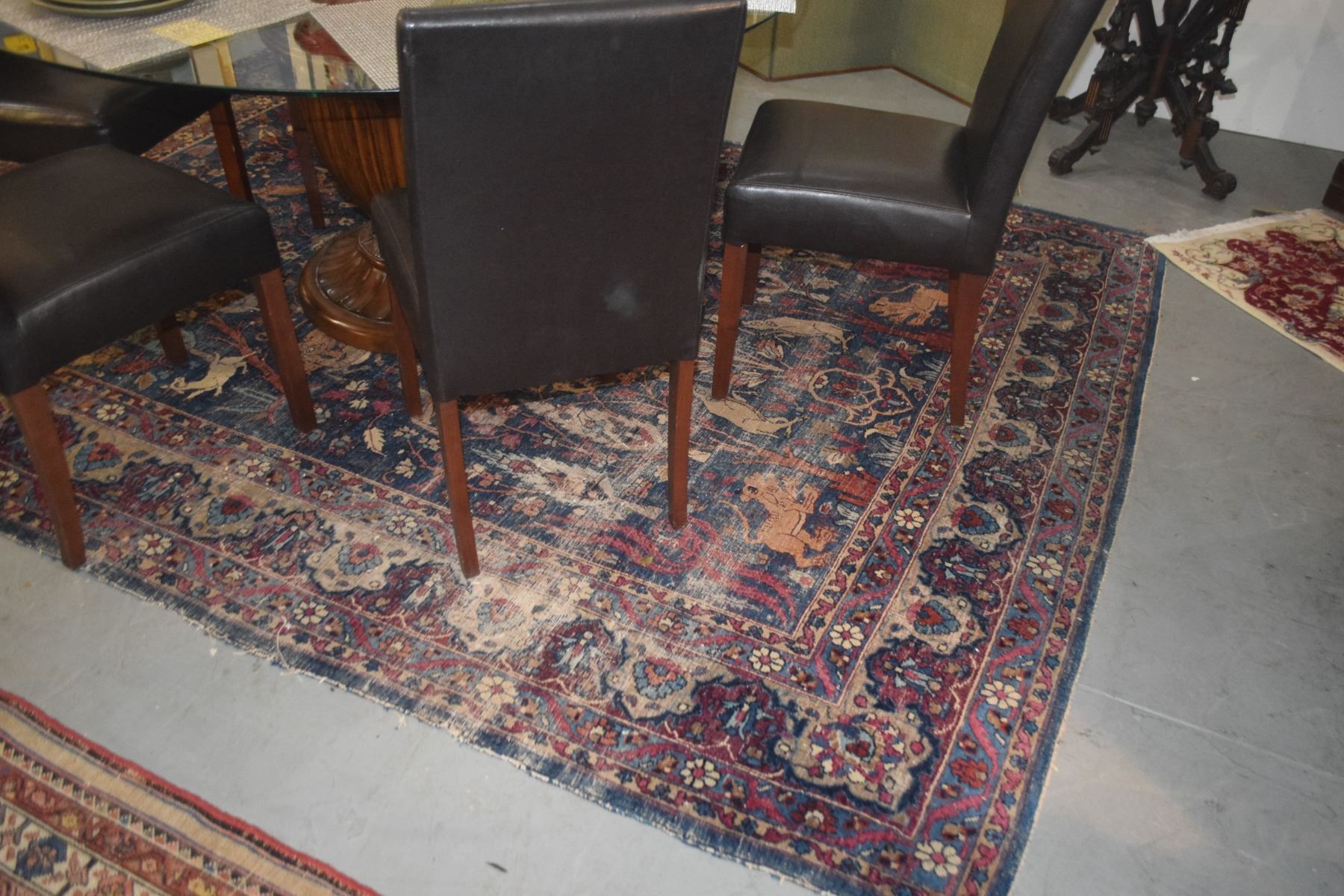 IRANIAN SAROUK HAND KNOTTED WOOL PINE RUG, THE DEEP BLUE FIELD W/A DIAMOND SHAPE MEDALLION FILLED W/FLOWERS IN PALE PINK, LIGHT BLUE, OFF-WHITE, SURROUNDED BY A FLORAL BORDER, CA. 1920 (113" X 82")