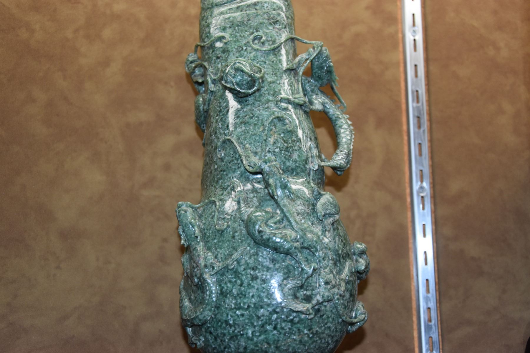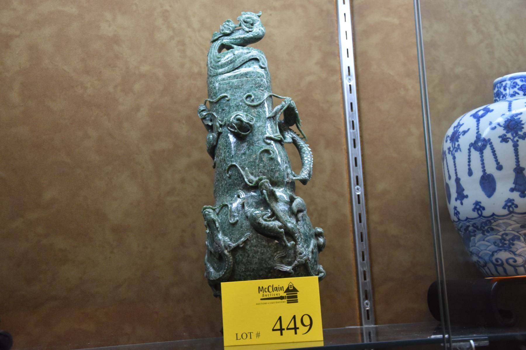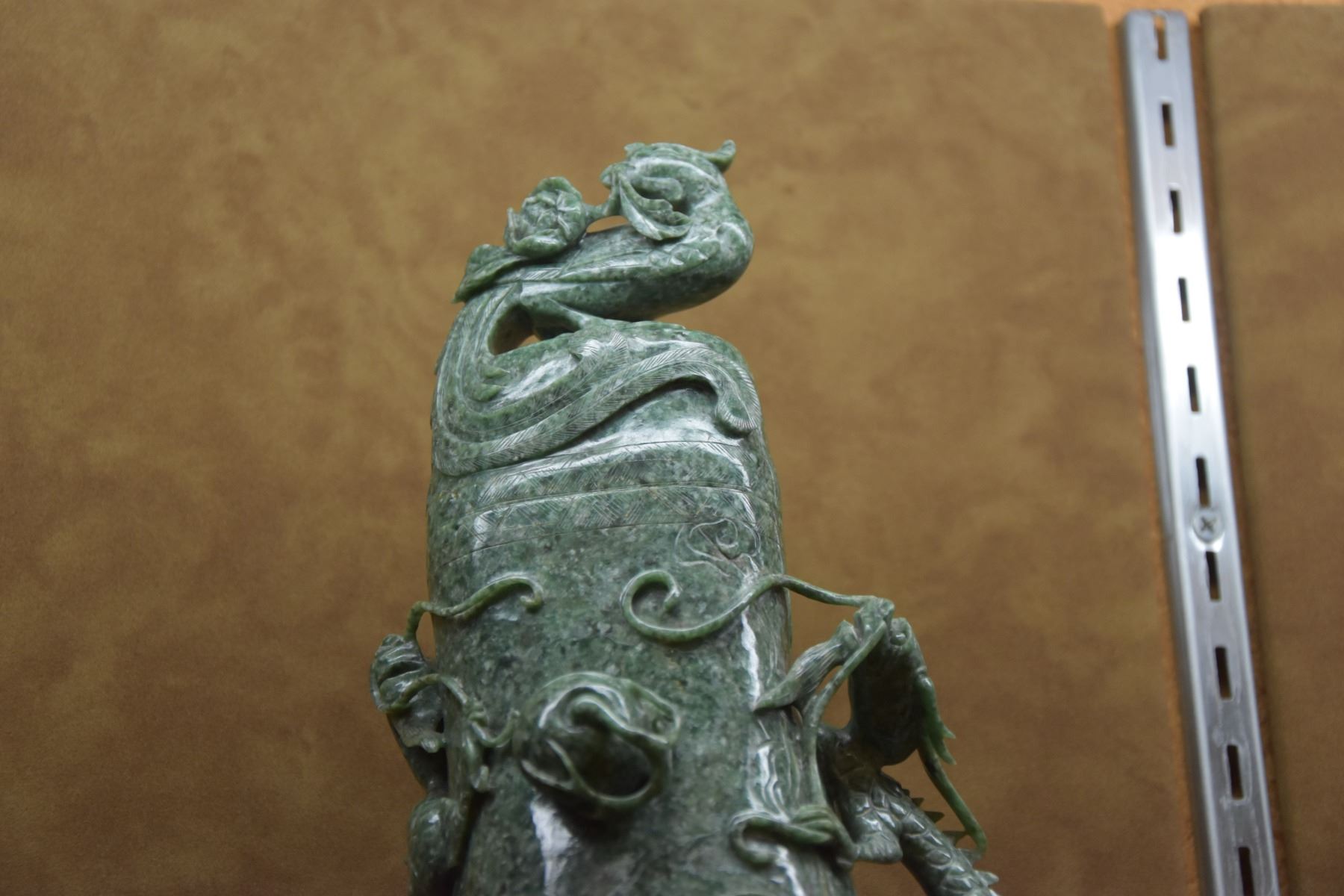 JADE COVERED JAR W/STAND, HIGH RELIEF WATER DRAGONS & PHOENIX W/ORIGINAL BOX (14 1/2")