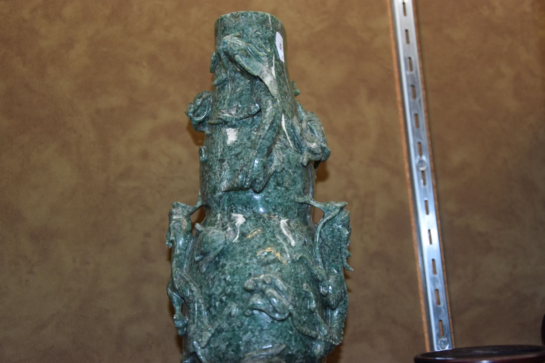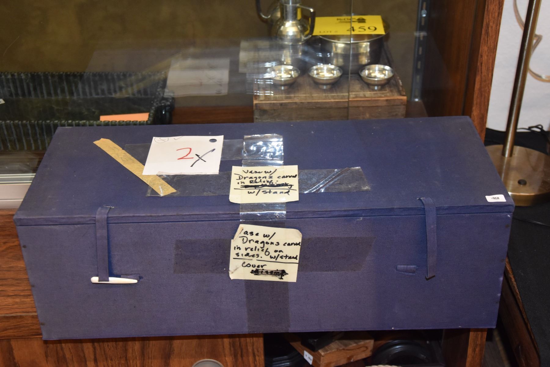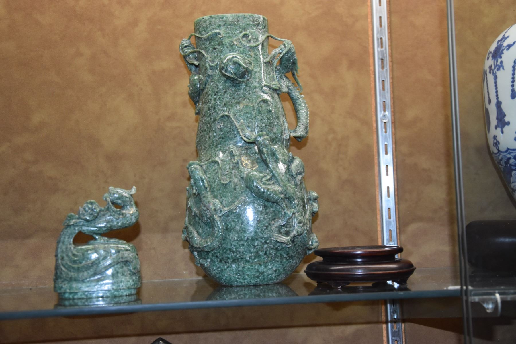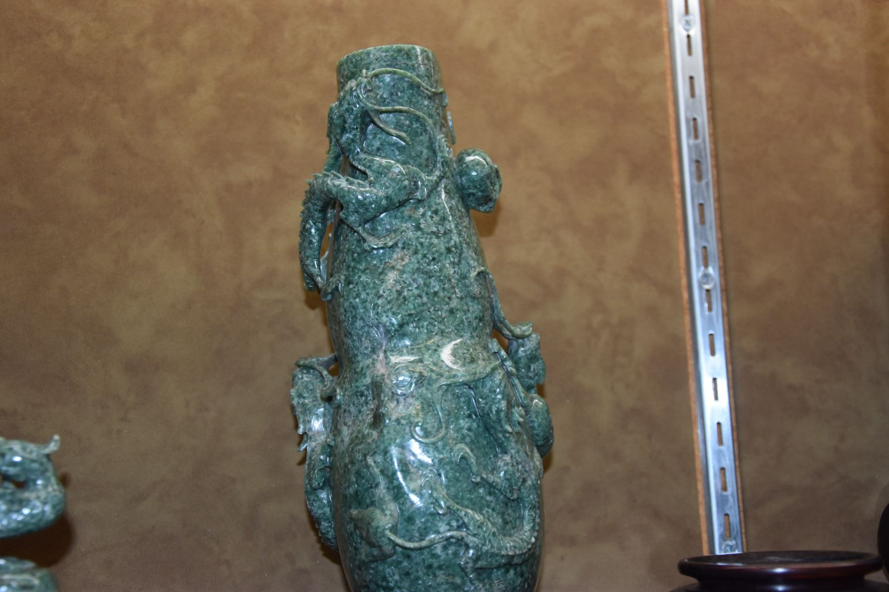 JADE COVERED JAR W/STAND, HIGH RELIEF WATER DRAGONS & PHOENIX W/ORIGINAL BOX (14 1/2")