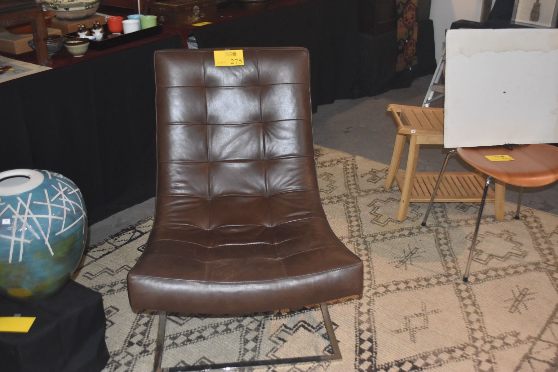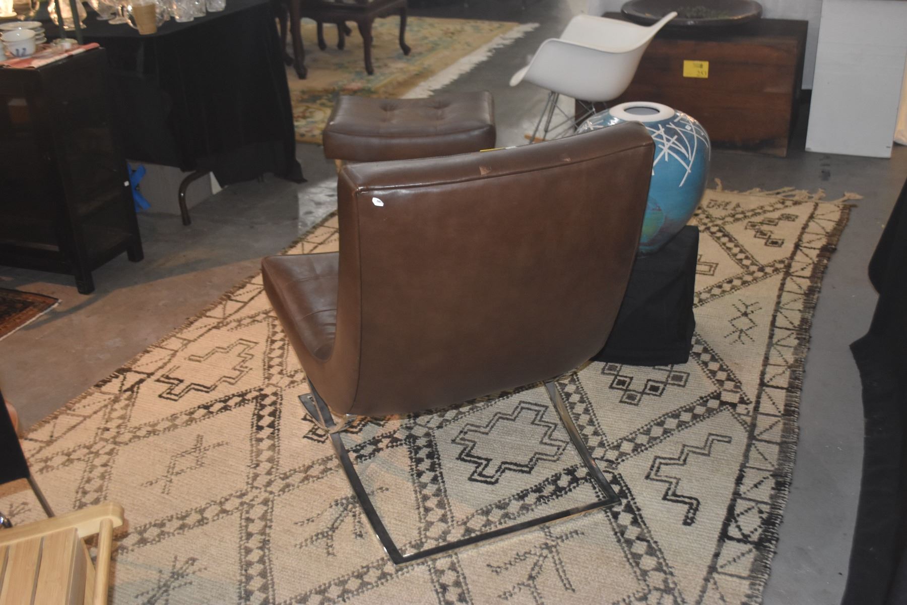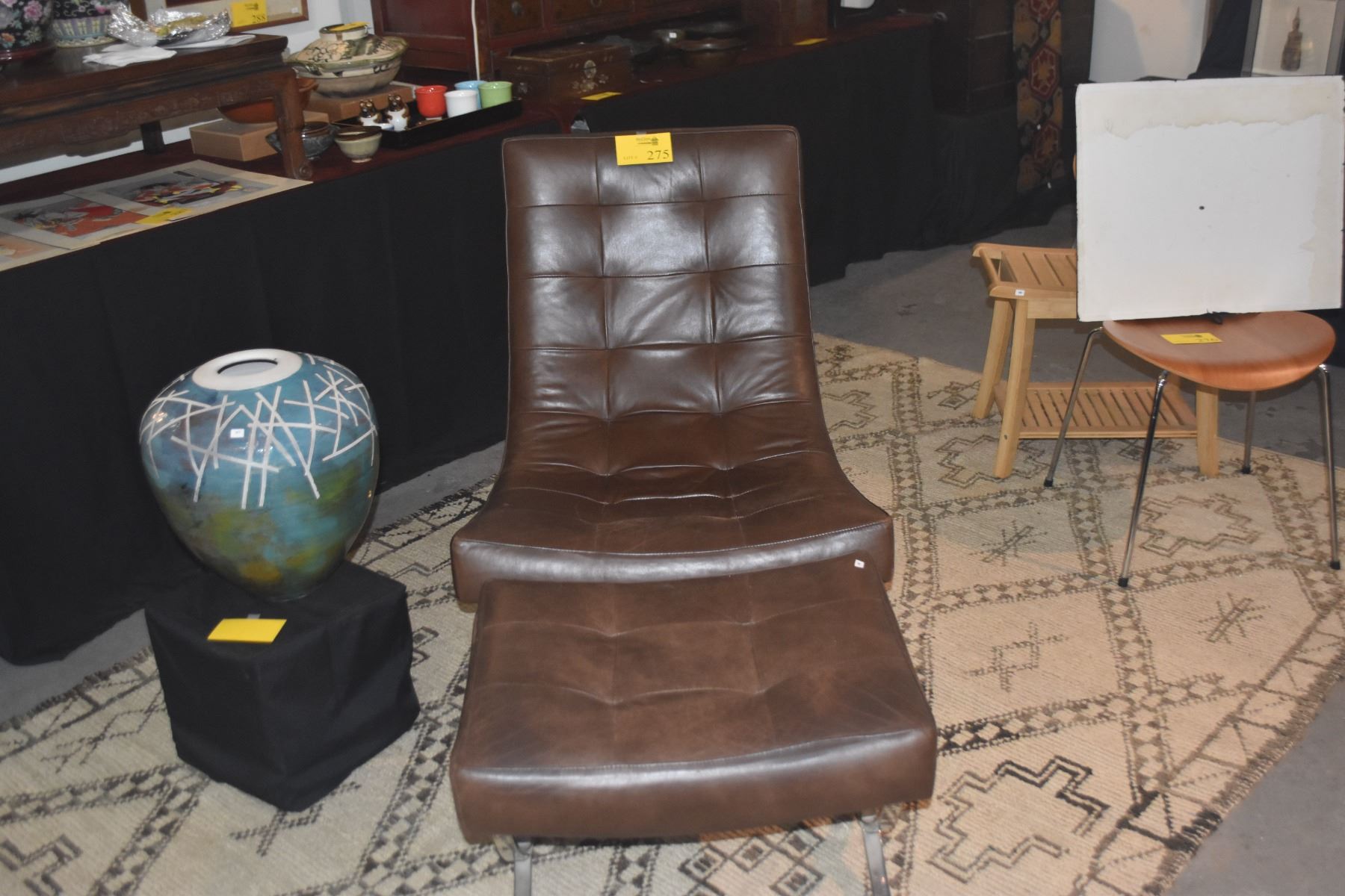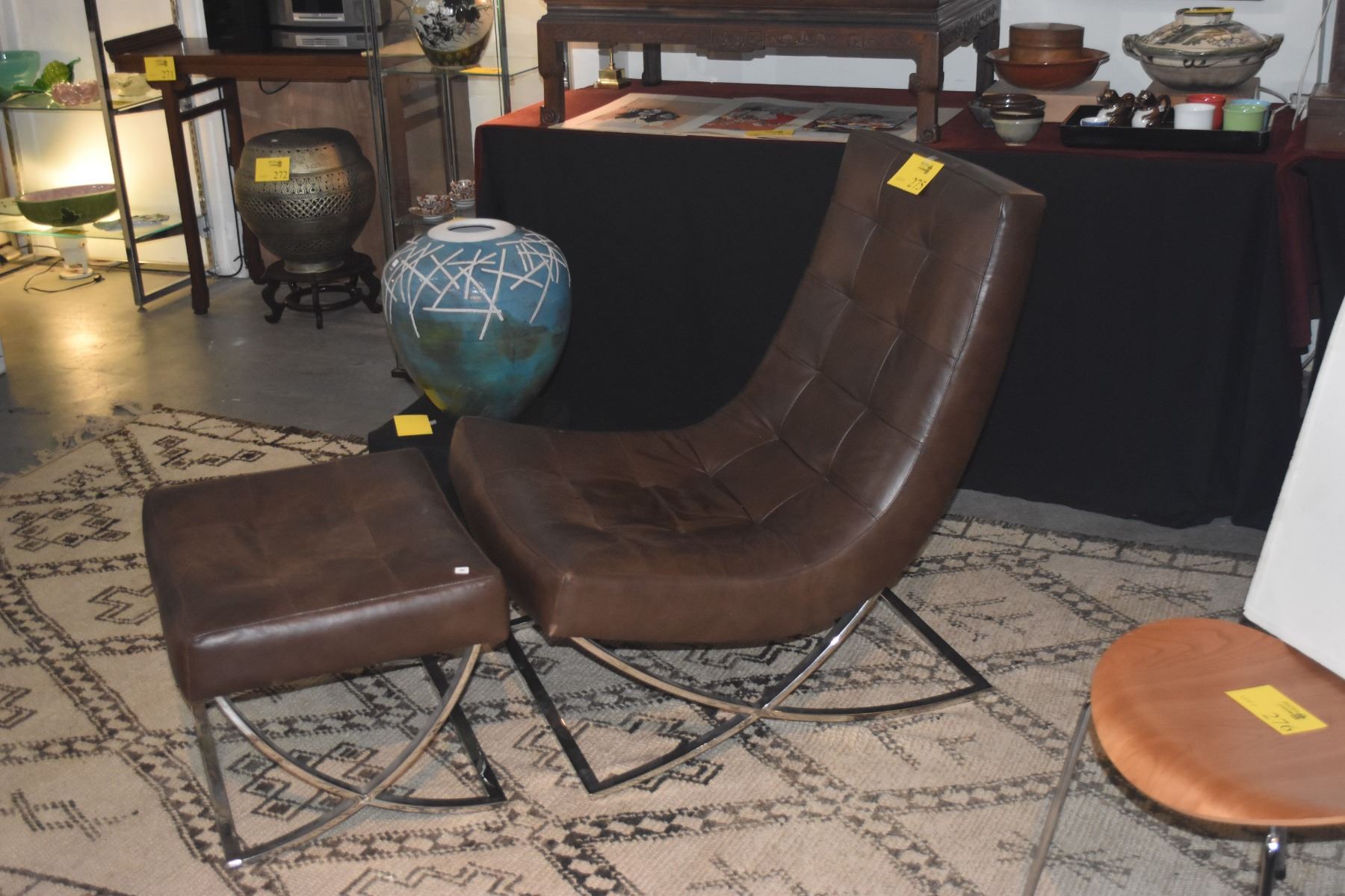 JAMES CHAIR & OTTOMAN, TOFFEE ITALIAN DISTRESSED LEATHER & POLISHED NICKLE FRAMES (WILLIAMS SONOMA)