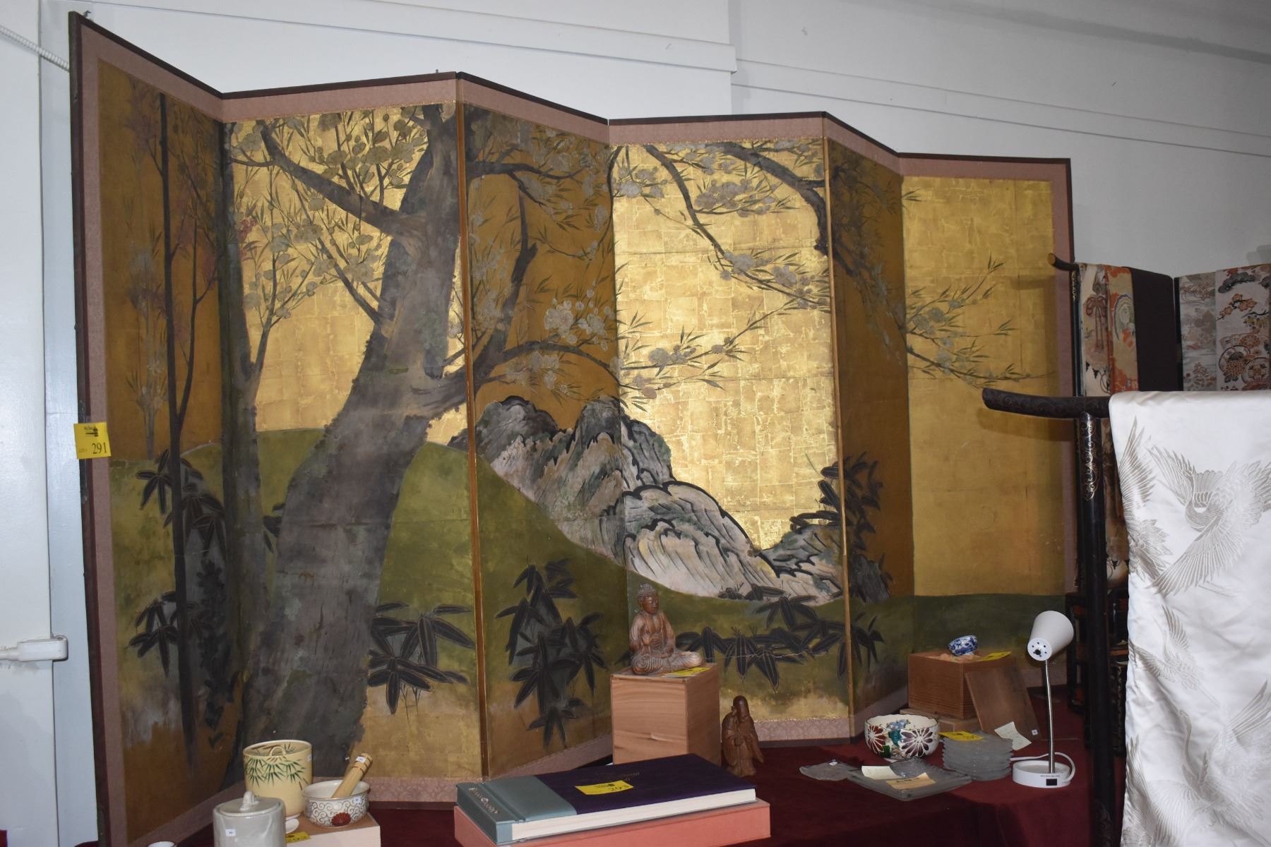 JAPANESE 6 PANEL BYO-BU POLYCHROME SCREEN, LANDSCAPE & PLUM TREES (APPROX 134")